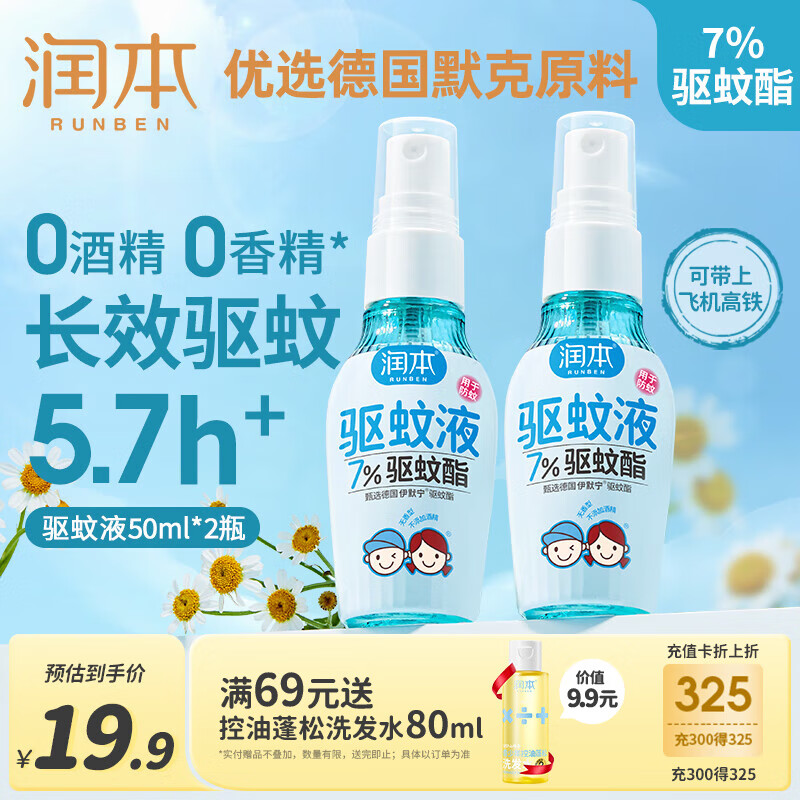 润本(RUNBEN)驱蚊液驱蚊喷雾花露水户外防蚊虫叮咬驱蚊水7%驱蚊酯无香50ml*2