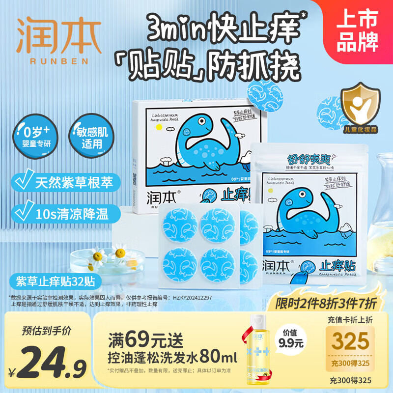 润本(RUNBEN)紫草舒缓止痒贴32贴/盒紫草膏蚊虫叮咬消包儿童护肤品标准-水龙版