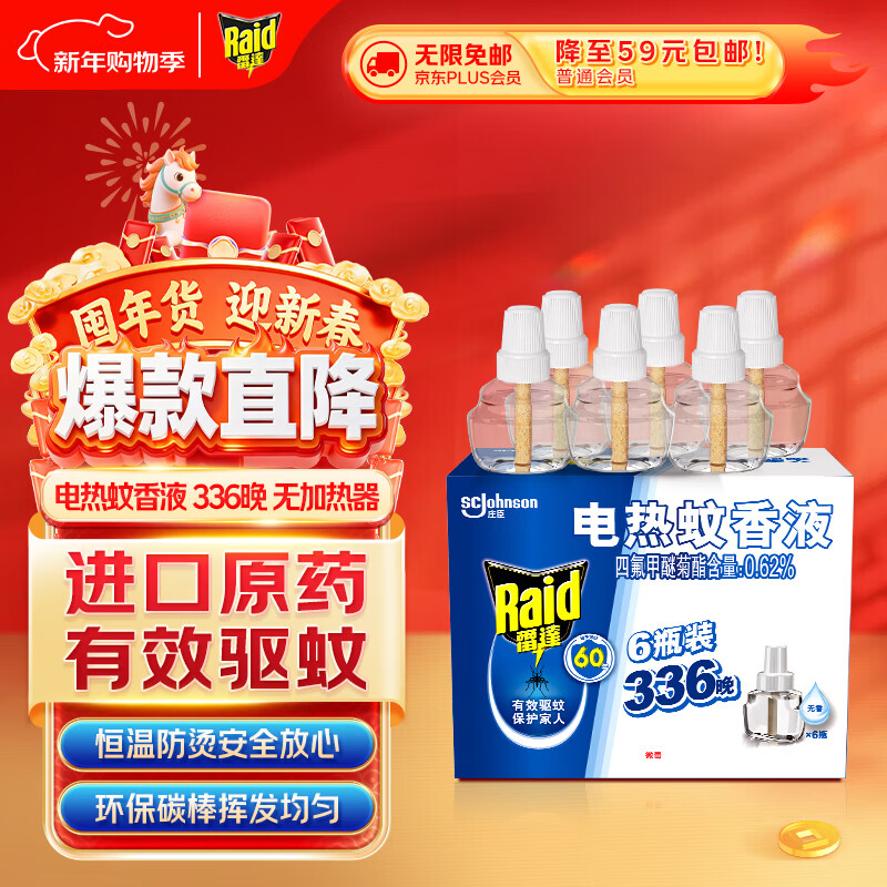 雷达(Raid)基孔肯雅热电蚊香液 336晚6瓶装替换装 无加热器 无香型 驱蚊器