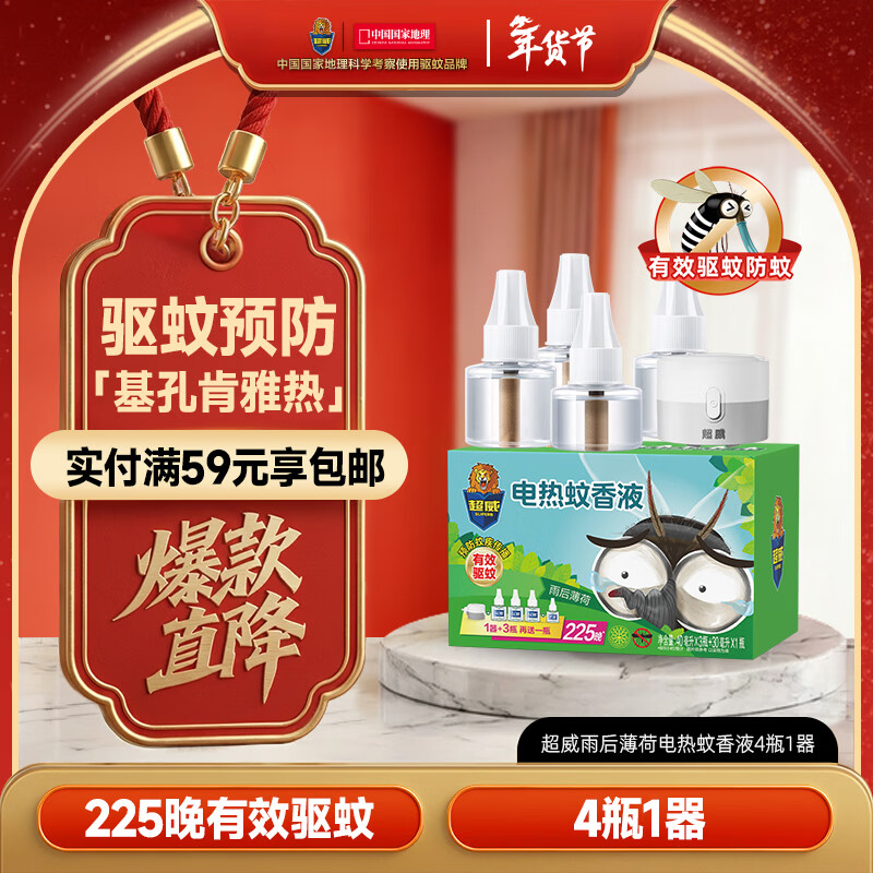 超威电蚊香液基孔肯雅热灭蚊非无香驱蚊液防蚊225晚补充液4瓶1加热器