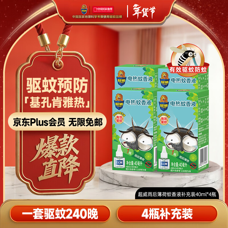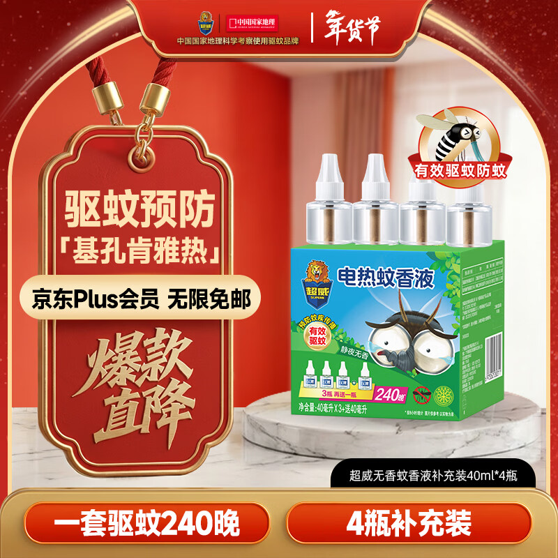 超威电蚊香液基孔肯雅热灭蚊器无香驱蚊防蚊液240晚补充液4瓶无加热器