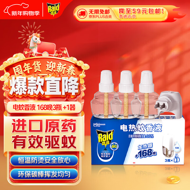 雷达(Raid)基孔肯雅热电蚊香液 168晚3瓶装 +无线加热器 无香型