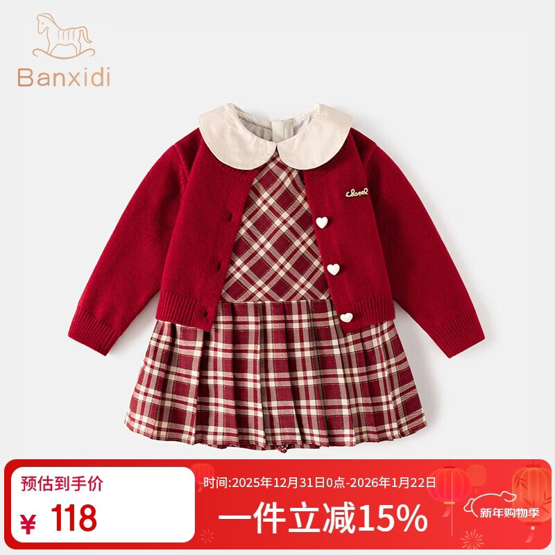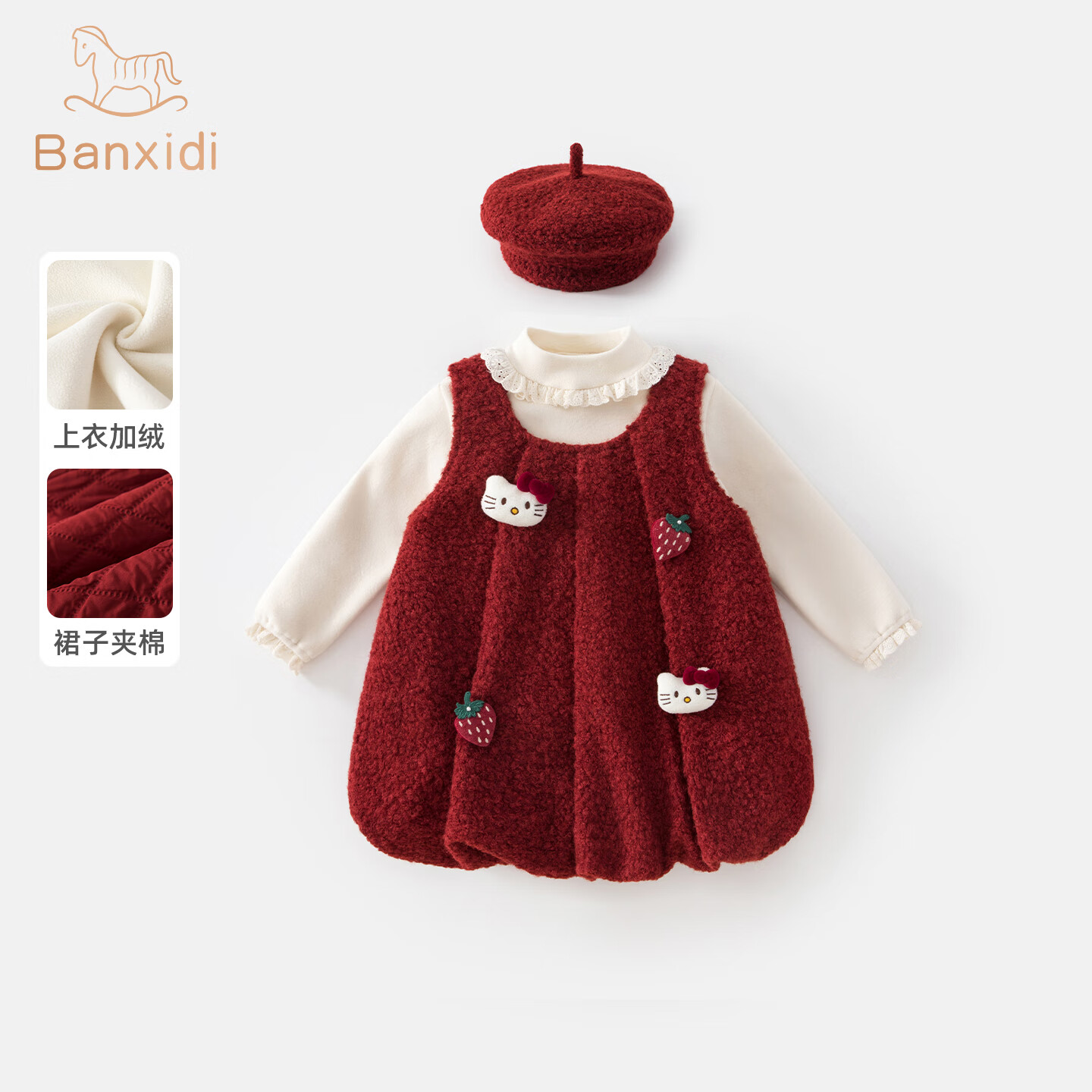 班喜迪女童连衣裙秋冬洋气女宝宝周岁礼服儿童公主裙套装加绒裙子拜年服 红色 90