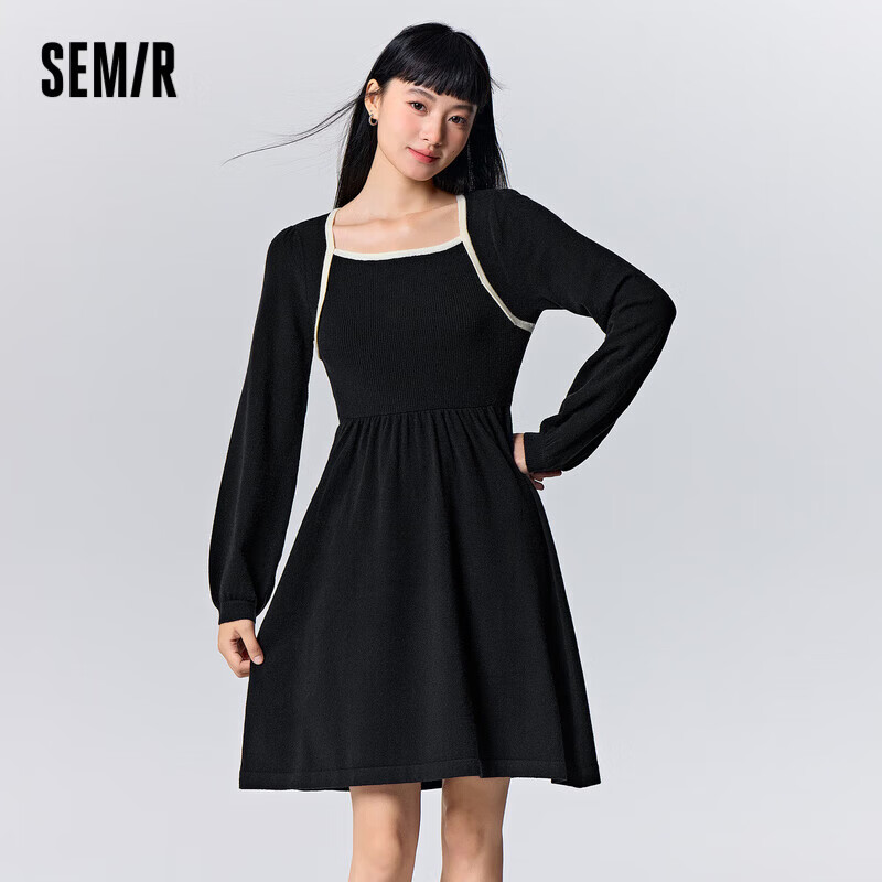 森马(Semir)【跨晚同款】连衣裙女撞色方领针织裙法式优雅冬季修身打底裙气质 黑色90001 M 160/84A