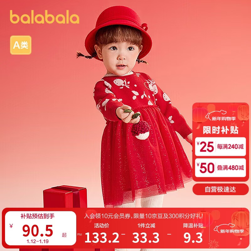 巴拉巴拉童装婴儿连衣裙宝宝公主裙网纱裙假两件拼接甜美喜庆年服 红白色调00461 100