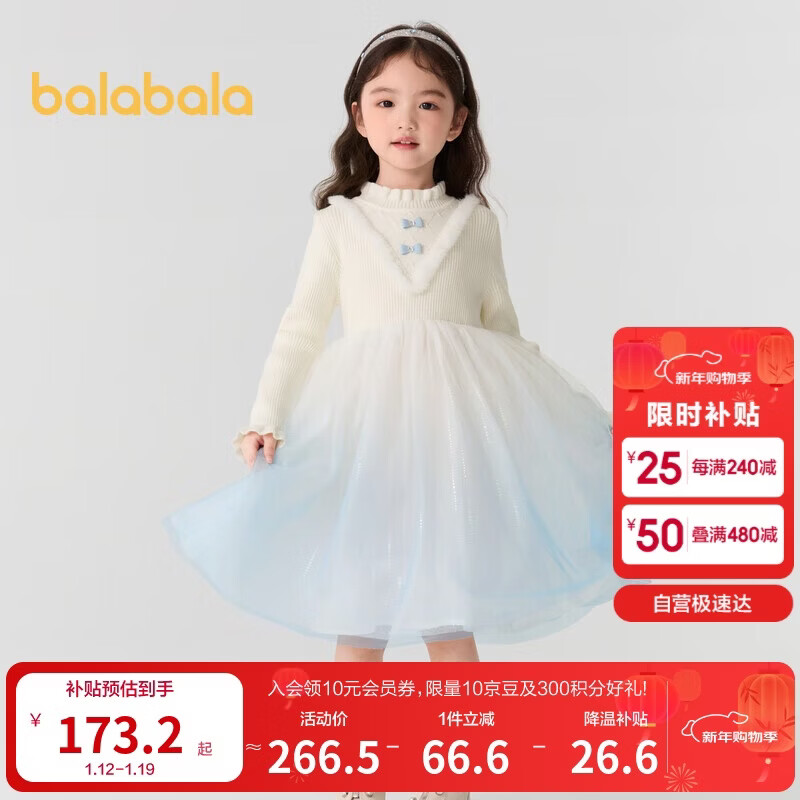 巴拉巴拉童装儿童连衣裙女童秋冬装公主裙渐变网纱裙针织拼接洋气 白蓝色调00318 110