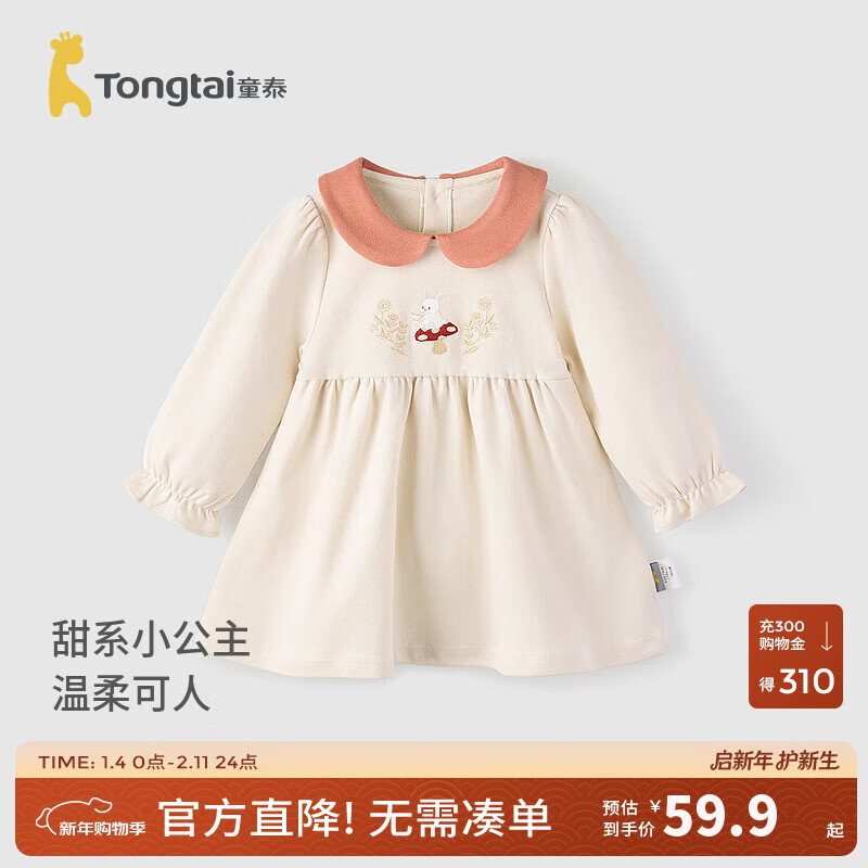 童泰婴儿连衣裙春秋纯棉女宝宝裙子儿童翻领蓬蓬裙女童外出公主裙 米白 110 cm