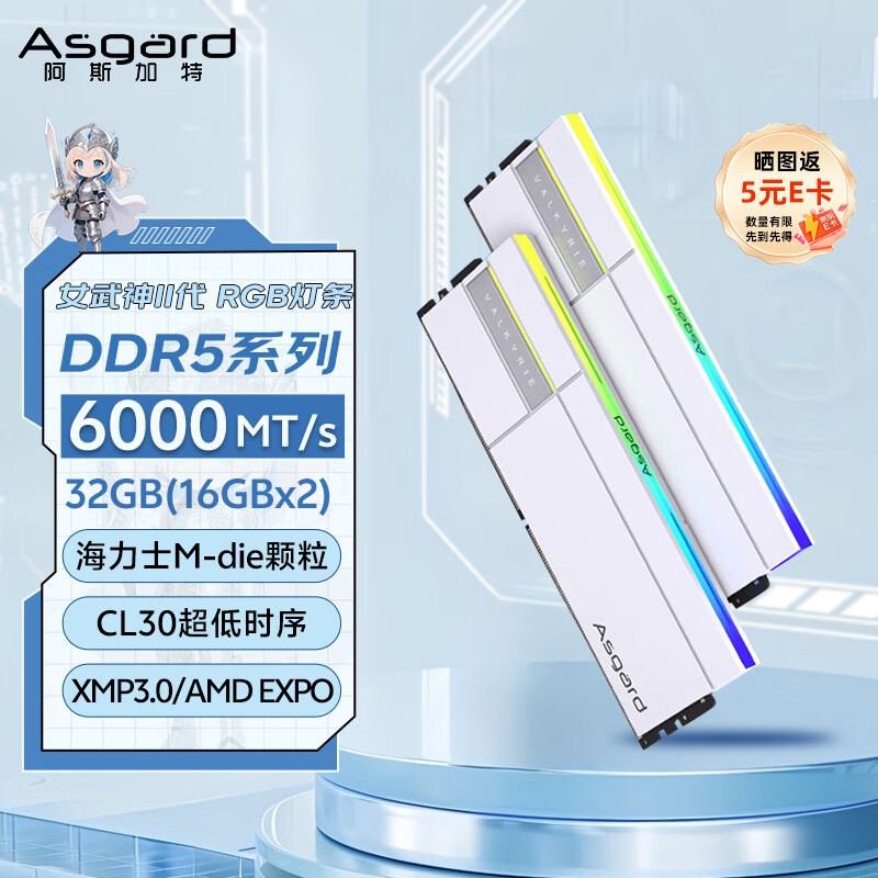 阿斯加特(Asgard)32GB(16GBx2) DDR5 6000 台式机内存条 女武神·瓦尔基里II代 RGB灯条 海力士M-die CL30 极地白