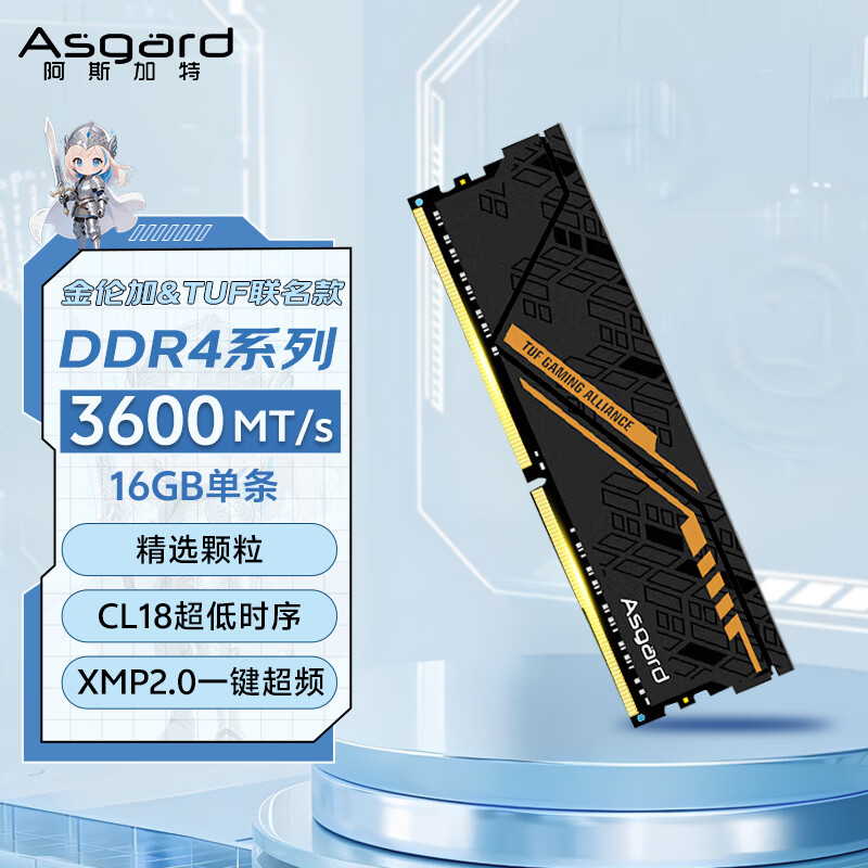 阿斯加特(Asgard)16GB DDR4 3600 台式机内存条 金伦加&TUF联名款 马甲条 精选颗粒 CL18 黑橙甲