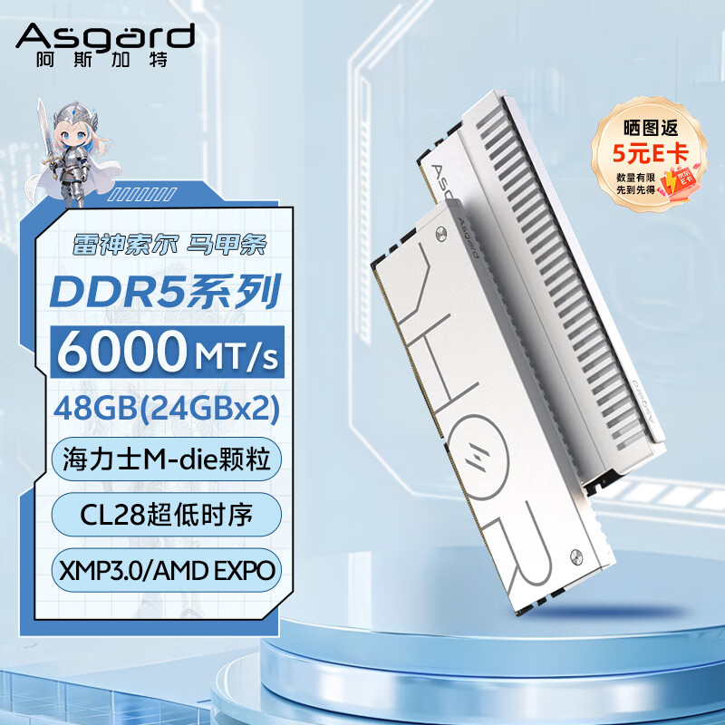 阿斯加特(Asgard)48GB(24GBx2) DDR5 6000 台式机内存条 雷神索尔 马甲条 海力士M-die CL28 星光银