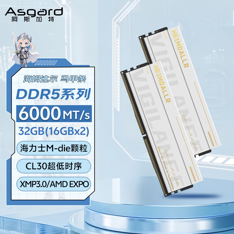 阿斯加特(Asgard)32GB(16GBx2) DDR5 6000 台式机内存条 海姆达尔 马甲条 海力士M-die CL30 极地白