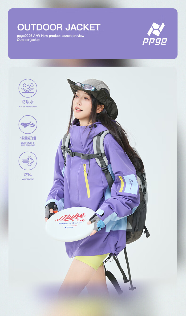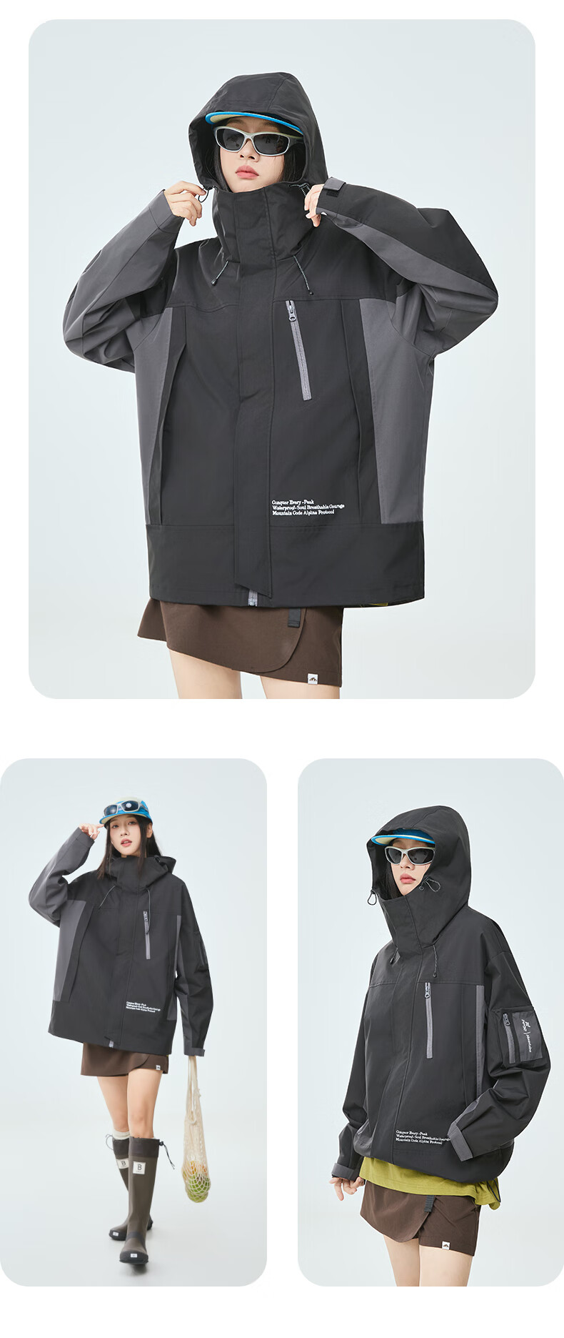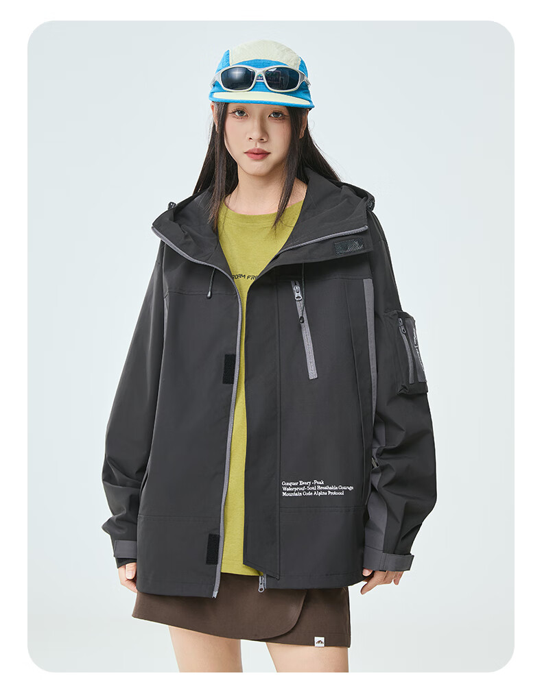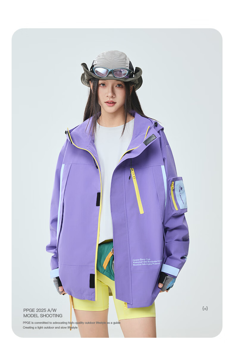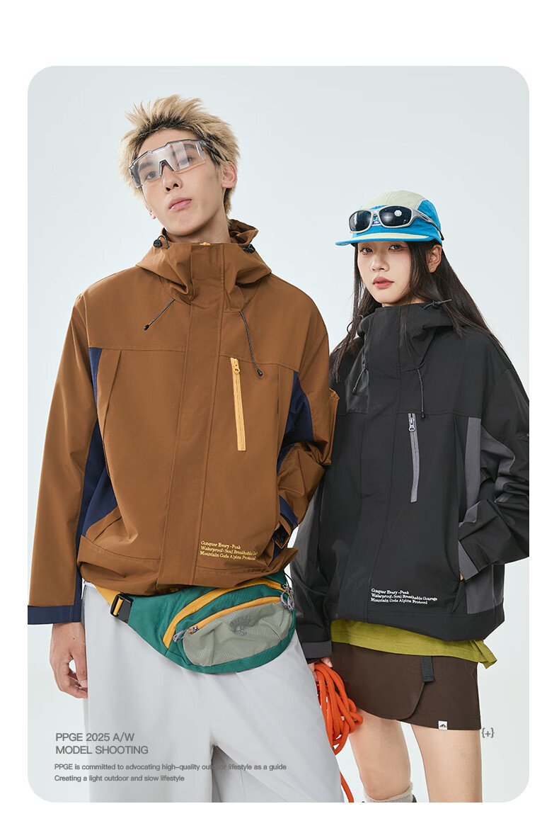 PPGE冲锋夹克防风防泼水户外外套登山衣服男女同款可调节抽绳运动夹克 墨陨黑 2XL