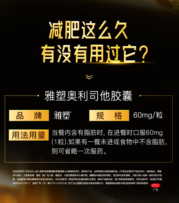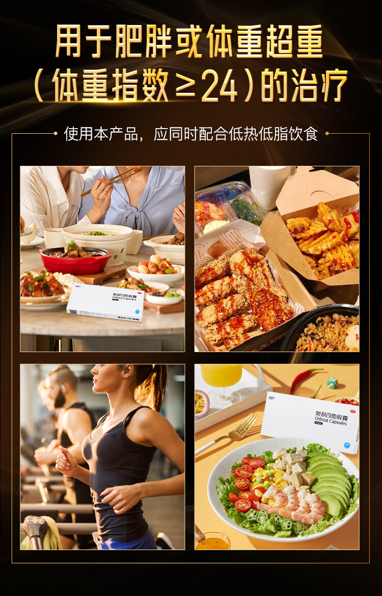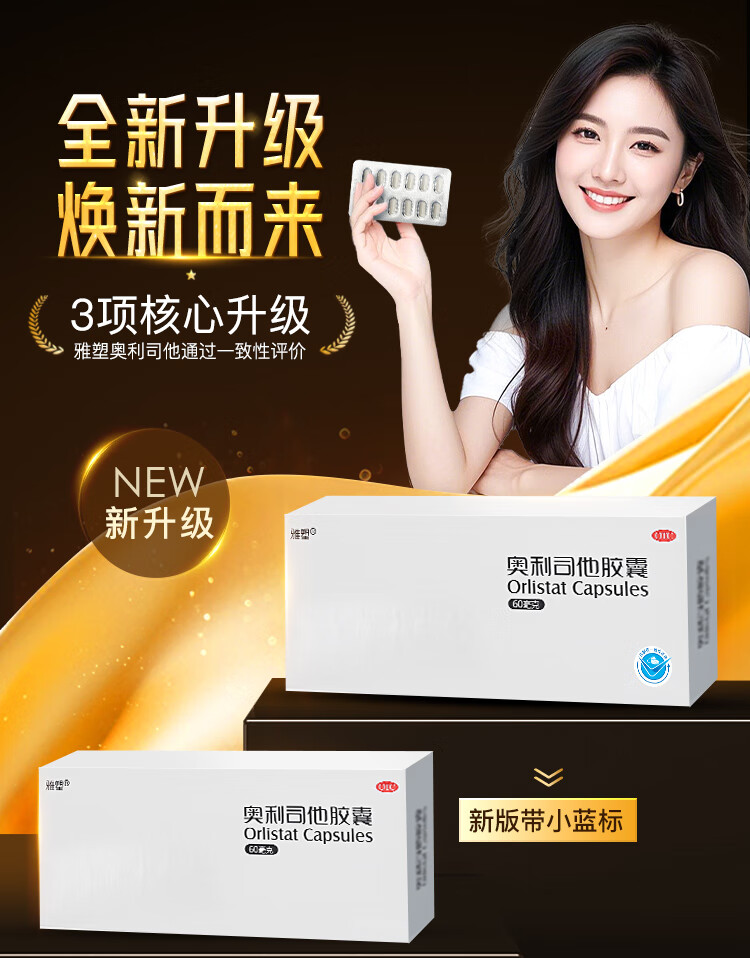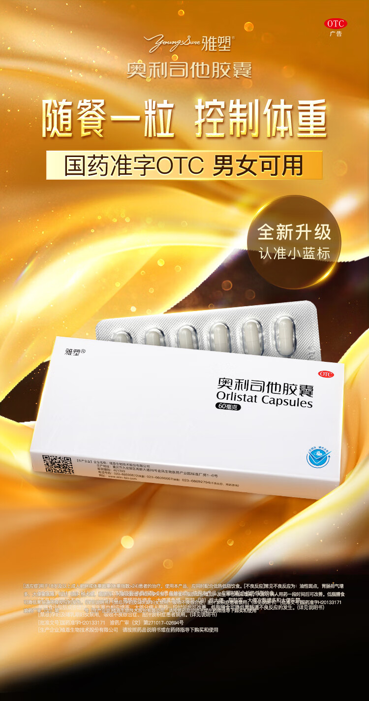 [雅塑]奥利司他胶囊 60mg*4粒 3盒装 奥利司他胶囊60mg减肥减重减脂治疗肥胖患者减肥药国药准字OTC 共发12粒