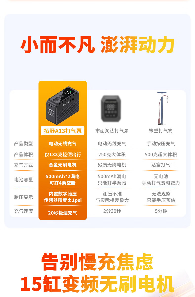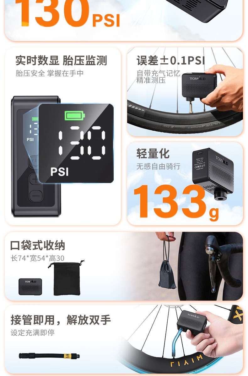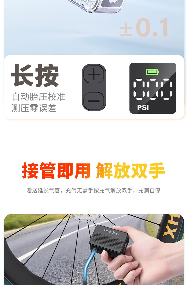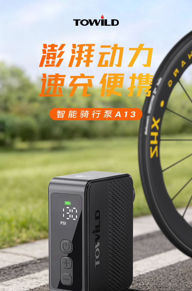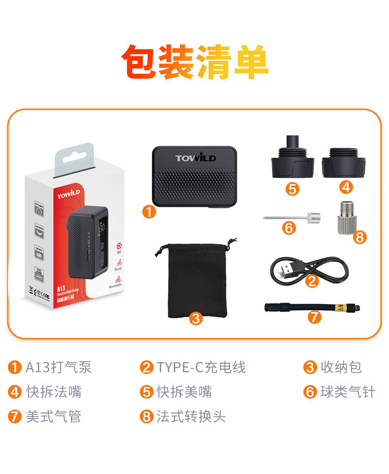 TOWILD拓野A13自行车打气筒电动高压屏显LED便携无线充气泵美法嘴 A13充气泵(含美嘴法嘴气针等)