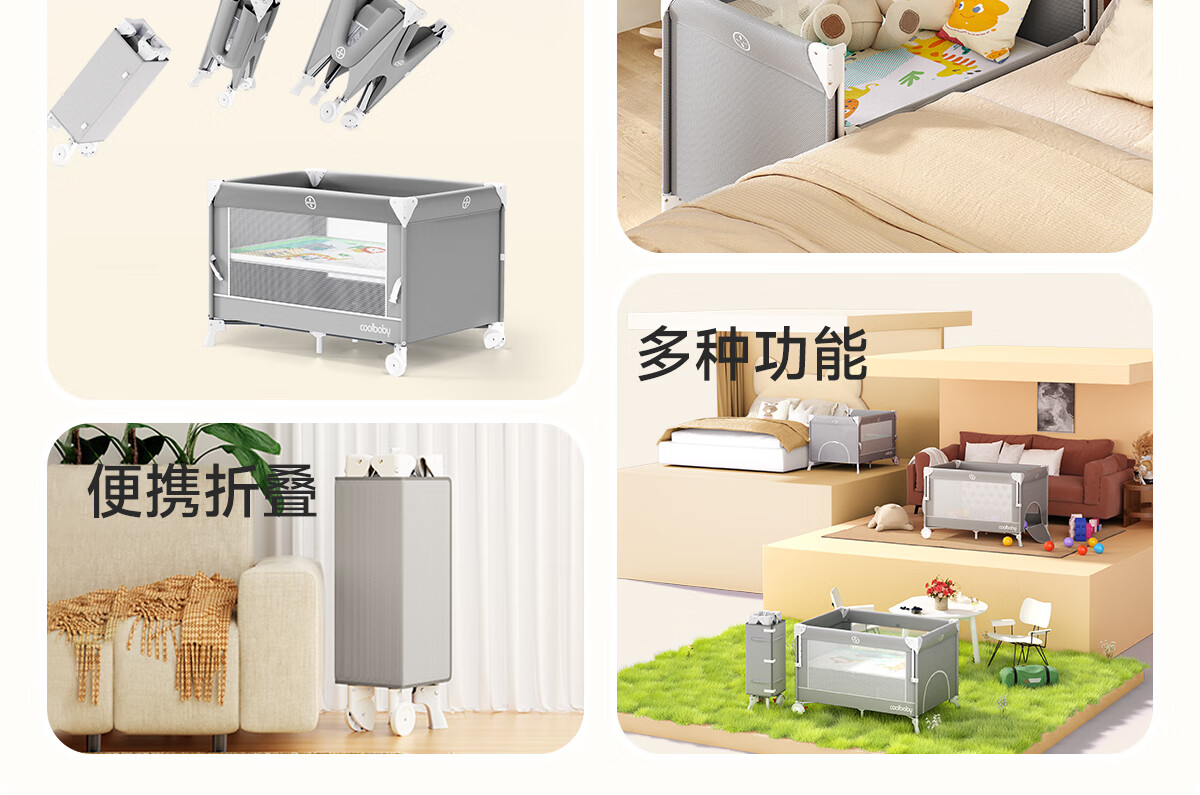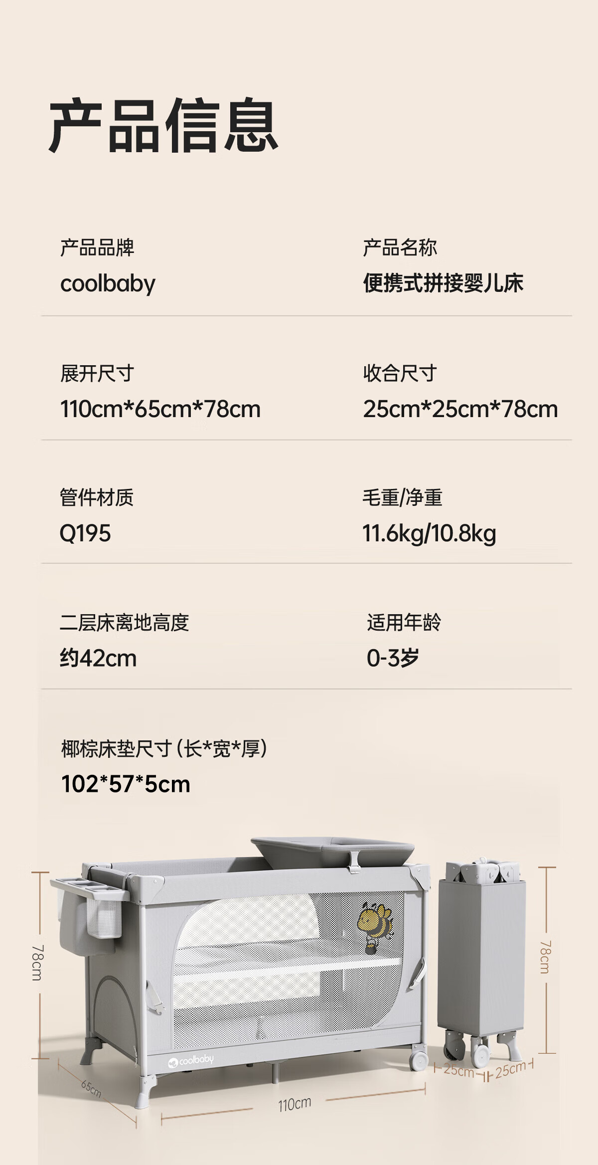 coolbaby婴儿床多功能可折叠可移动拼接床带尿布台蚊帐宝宝床 全家桶