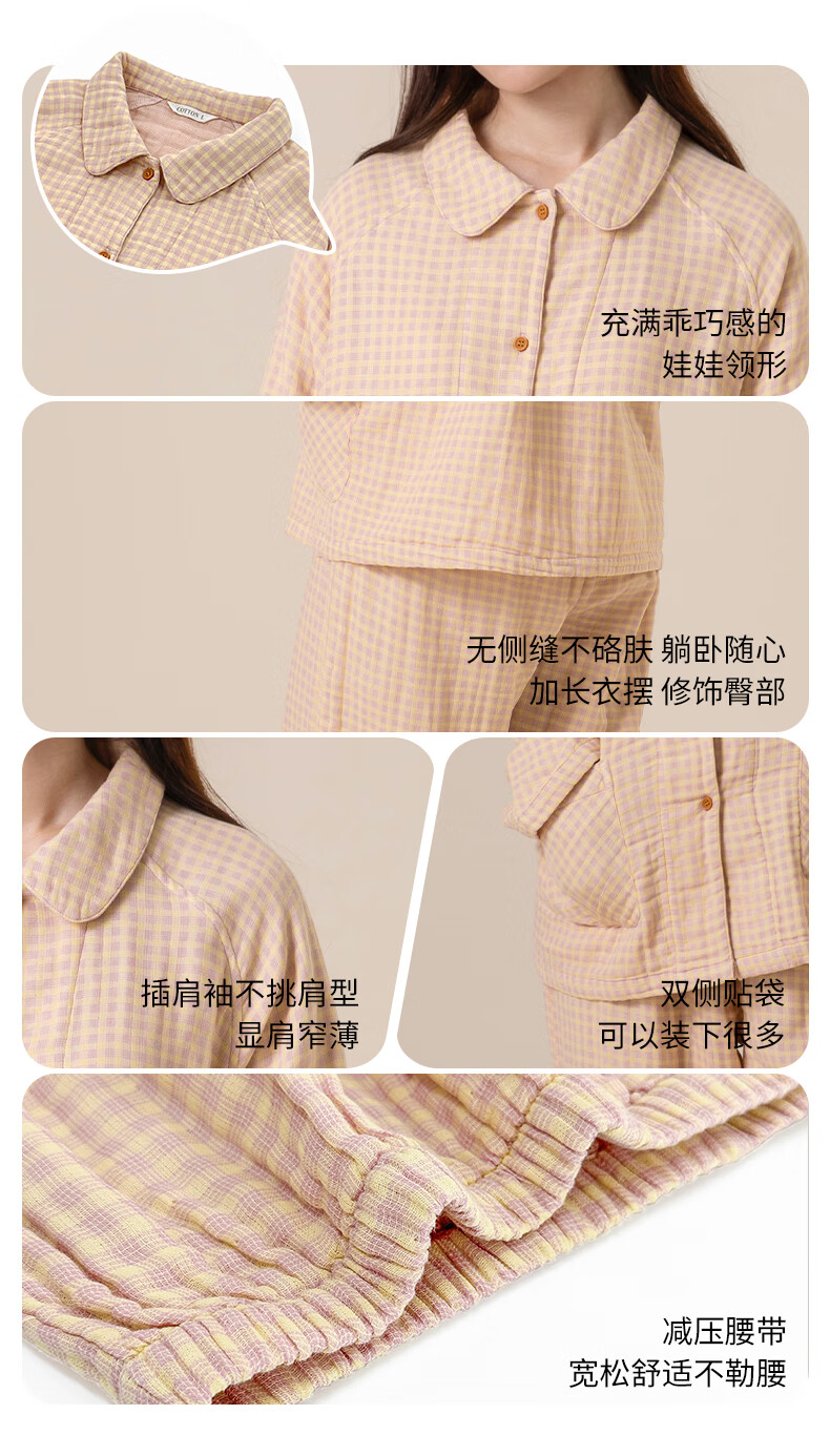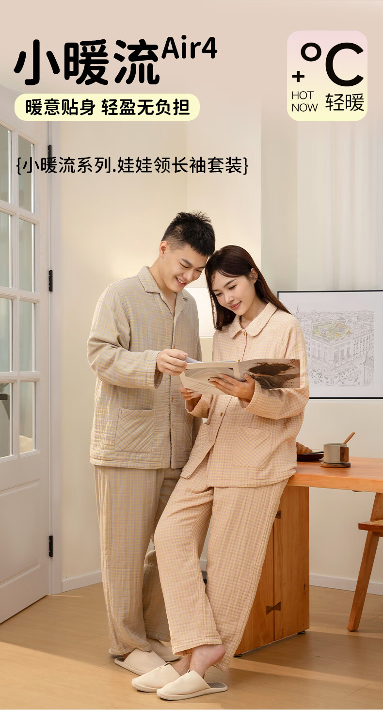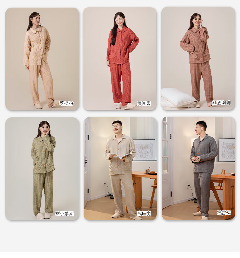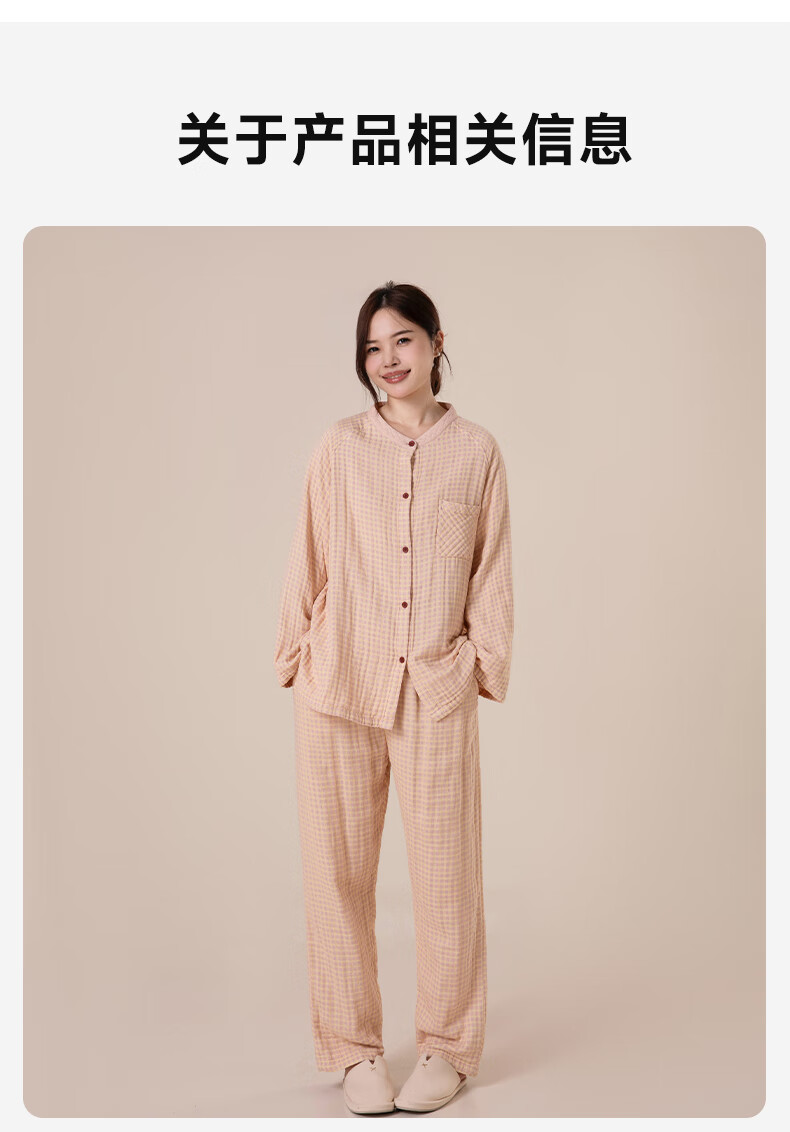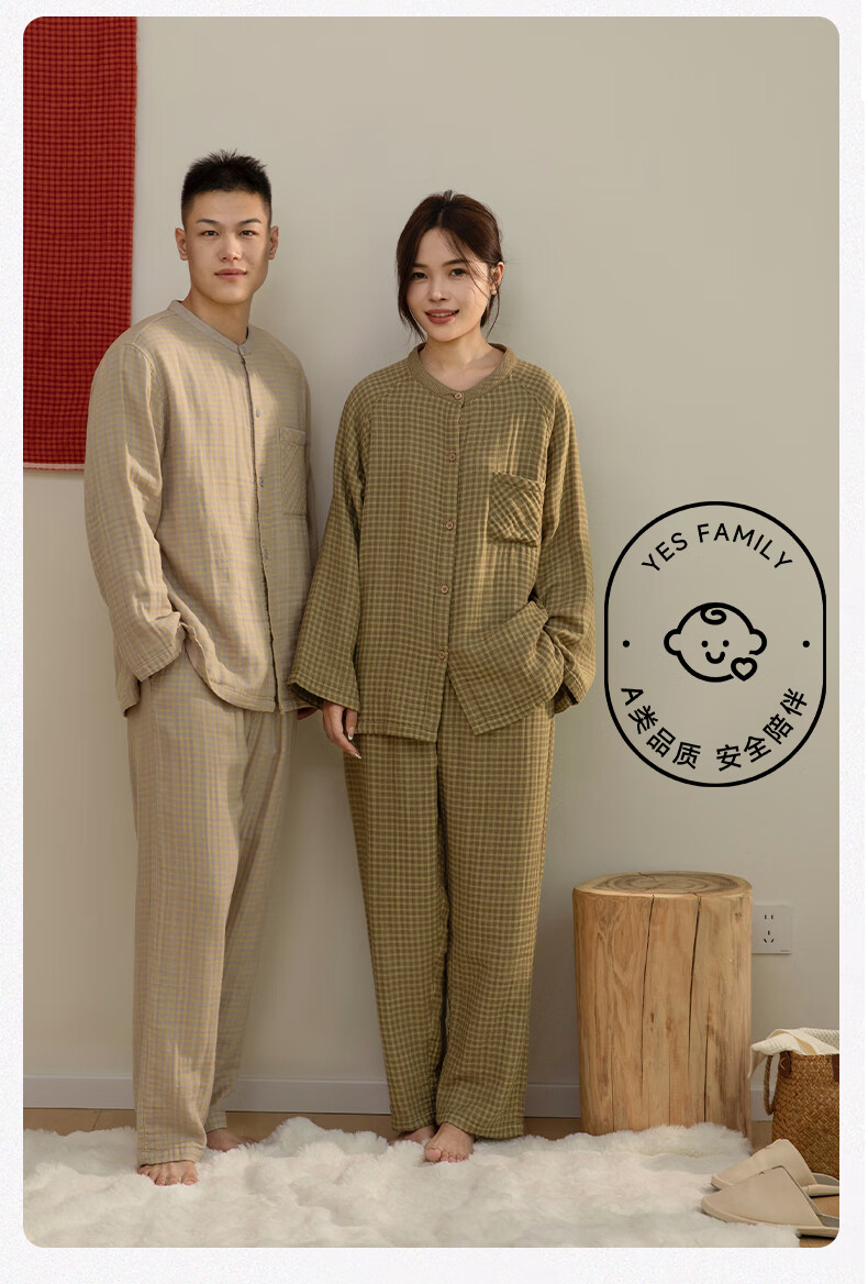 宜色家纯棉睡衣四层棉纱家居服 春季长袖长裤男女士情侣居家服套装宽松 四层纱立领-杏仁米 男款 M