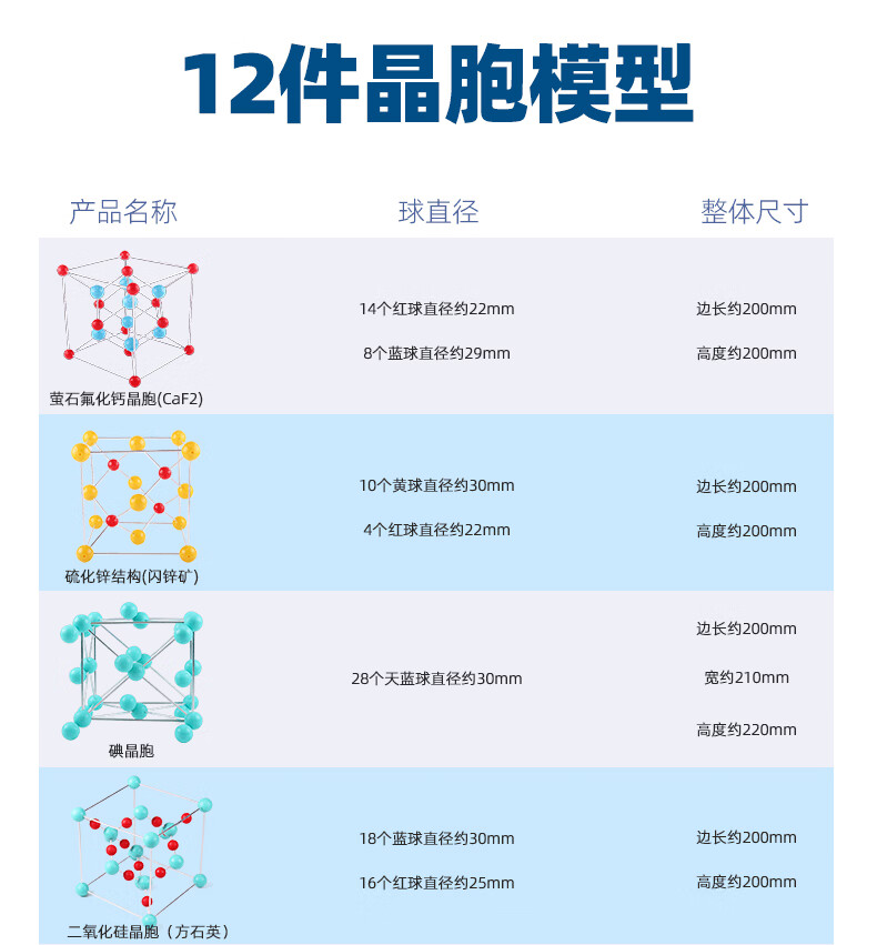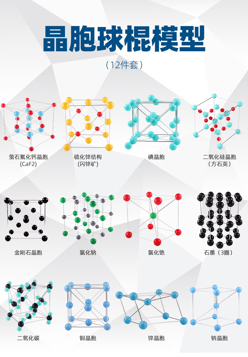 可普(kepu)高中大学常见晶胞球棍化学模型12件套分子原子球棍大号不锈钢教学演示摆件金刚石碘二氧化钠锌石墨