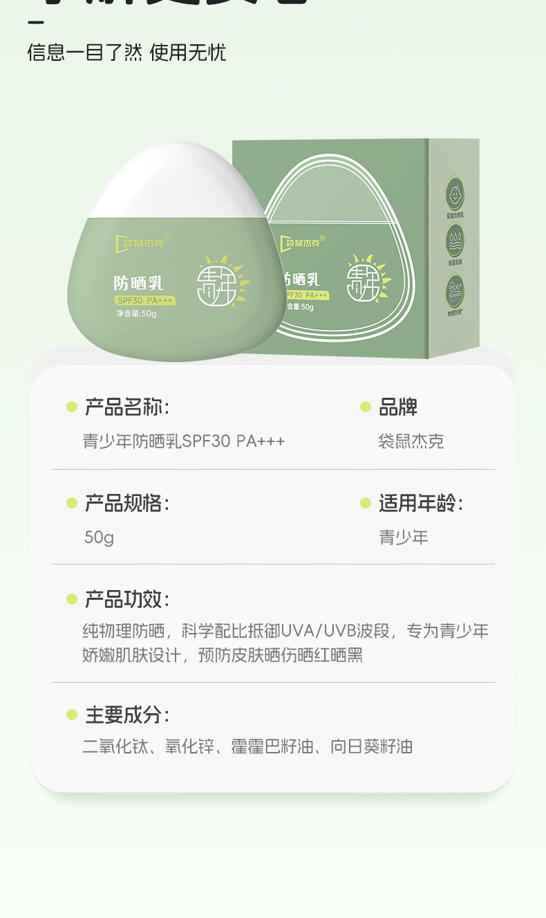 袋鼠杰克青少年儿童防晒霜海边/户外/日常物理防紫外线防晒乳清爽不油腻 【日常护肤首选】青少年防晒霜*2