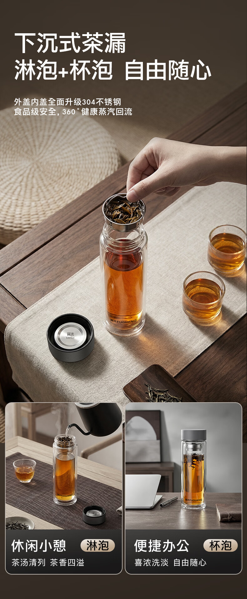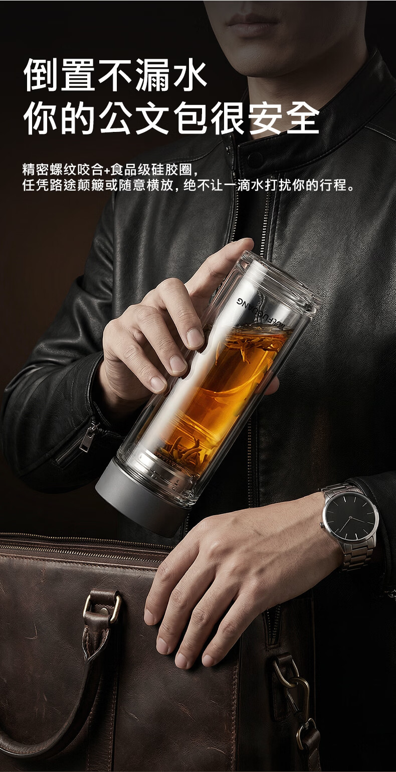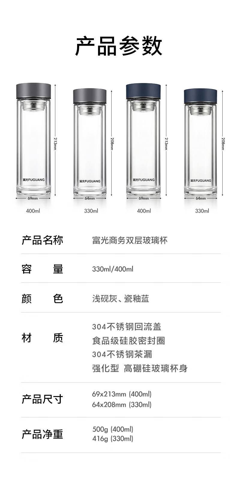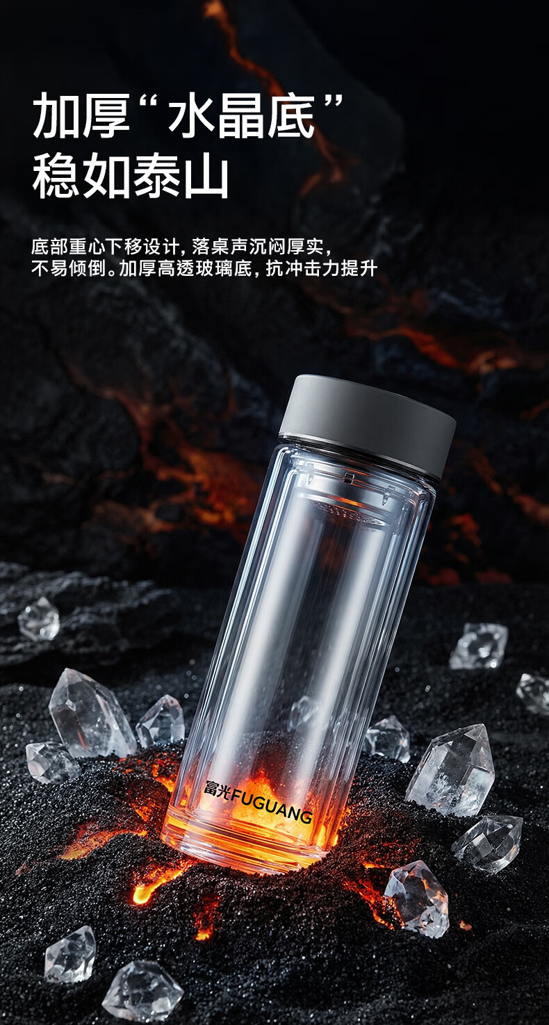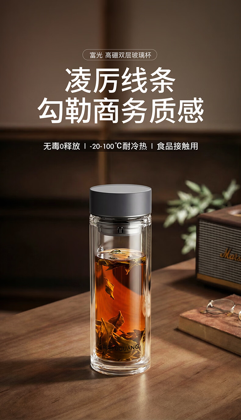 富光双层玻璃杯高硼硅 便携办公隔热杯 茶水分离泡茶杯 双层加厚便携防烫 400ML瓷釉蓝