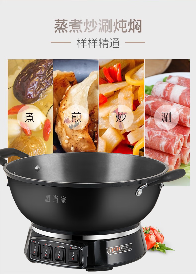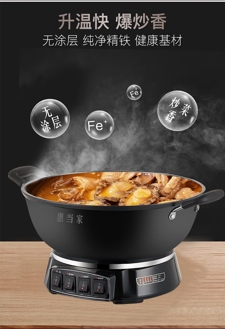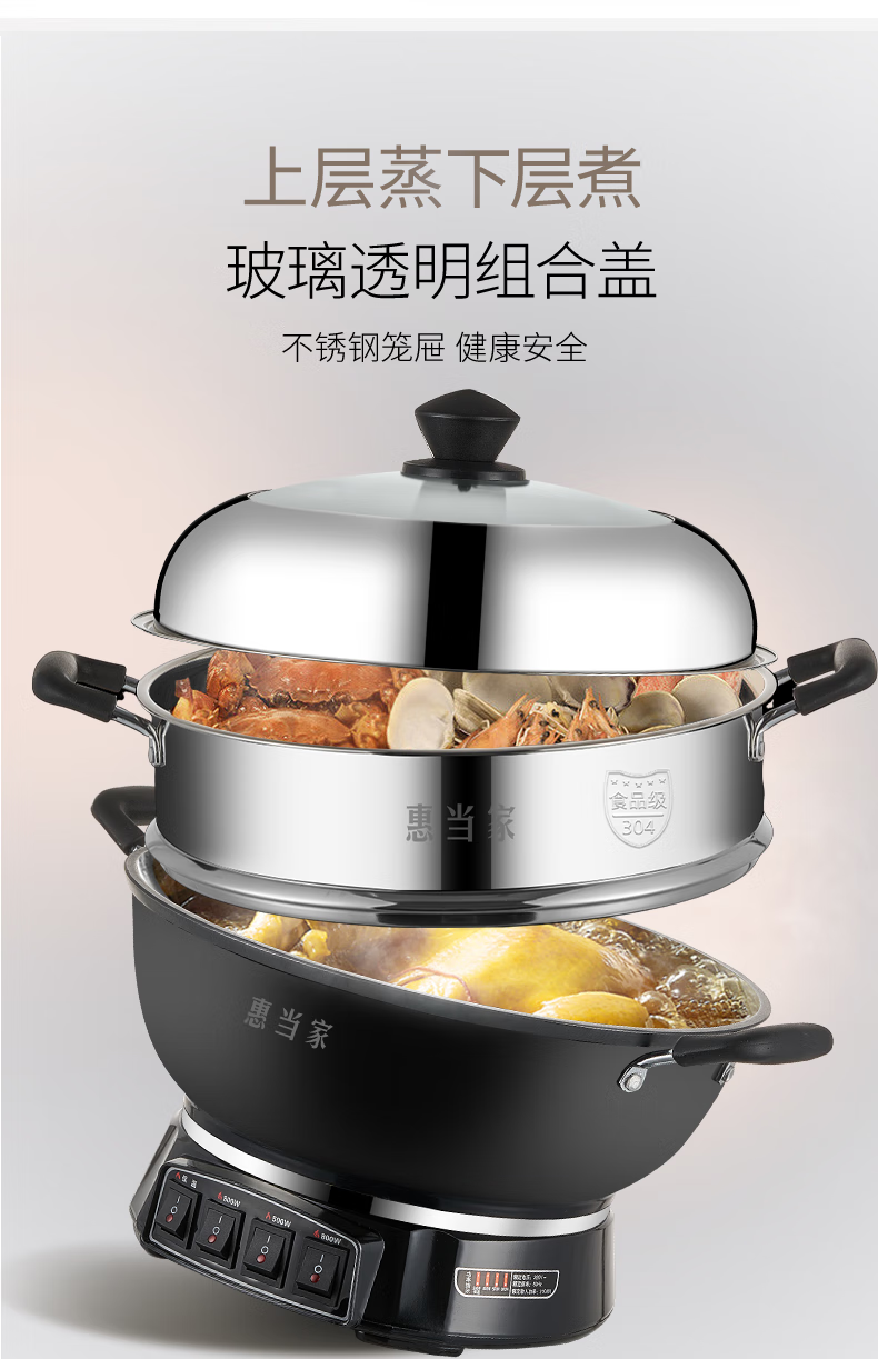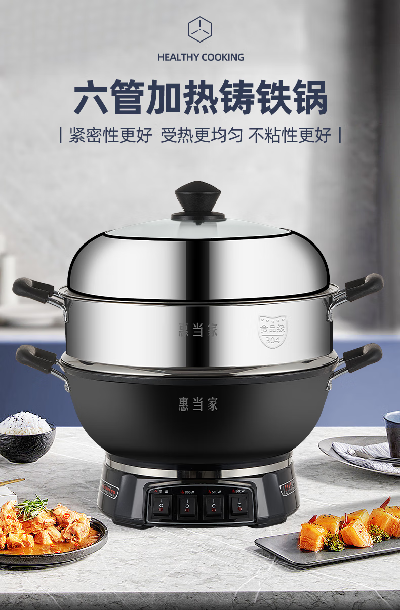 惠当家(Hui Dang Jia)六管加热铸铁电热锅 电炒锅电煮锅电蒸锅多功能锅家用一体式加厚炒煮锅电火锅炖锅多用途锅 【升级6管加热】38cm加深款+304钢单蒸笼