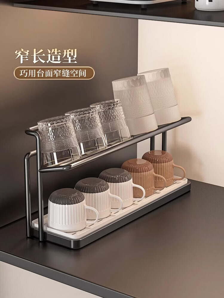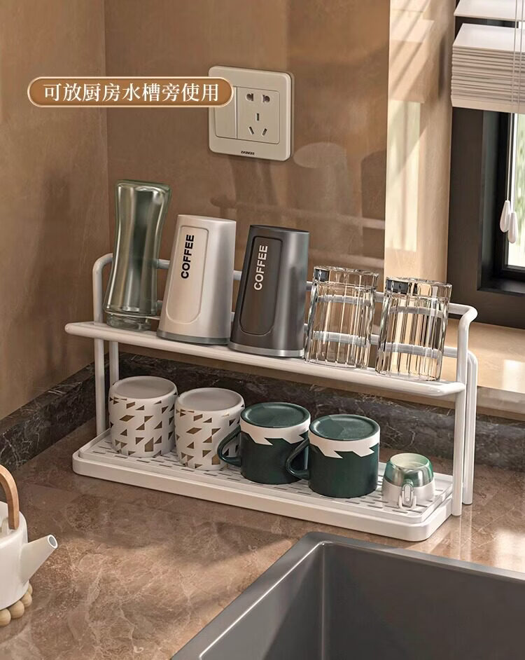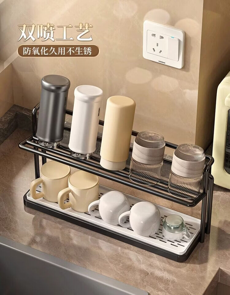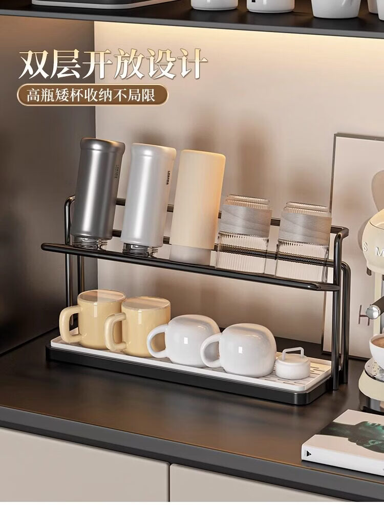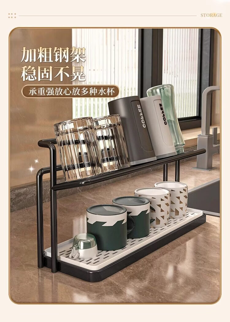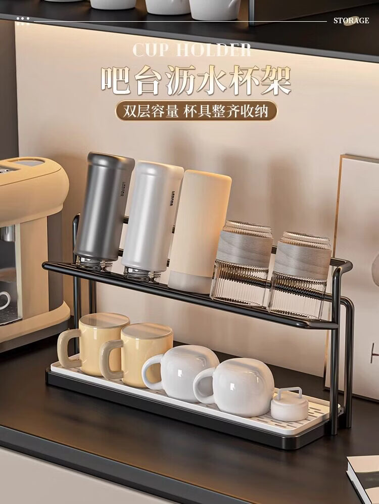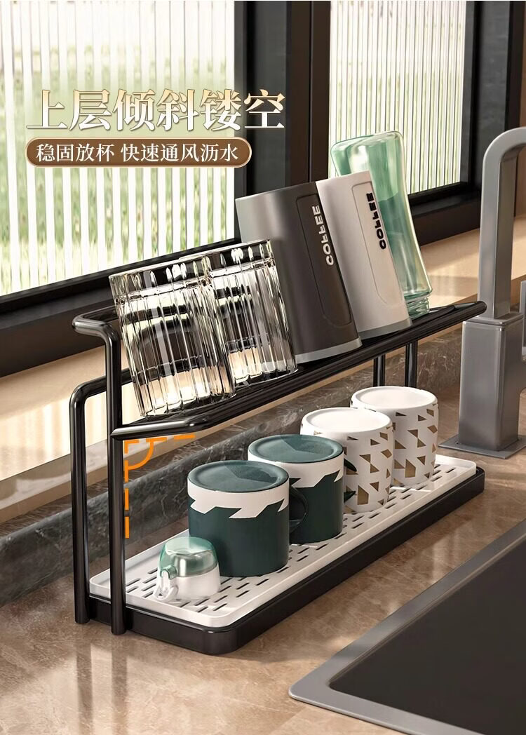 艾仕可(ASCOR)杯架双层沥水托盘架厨房餐桌台面玻璃杯子茶杯咖啡杯子收纳置物架 【黑色】双层沥水杯架