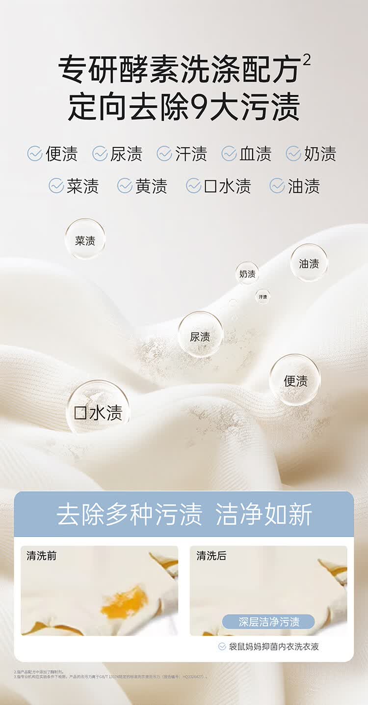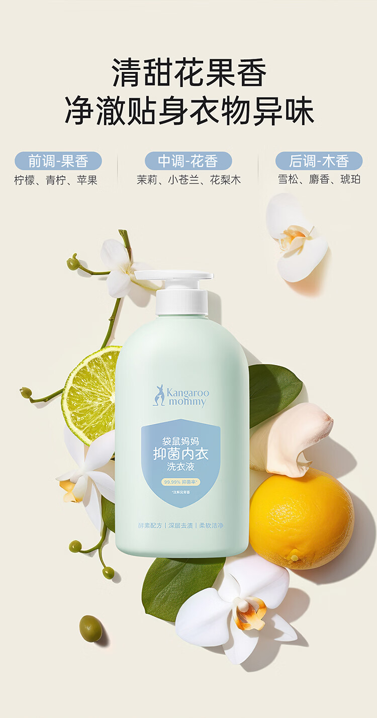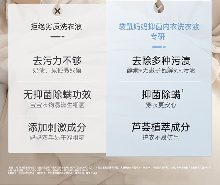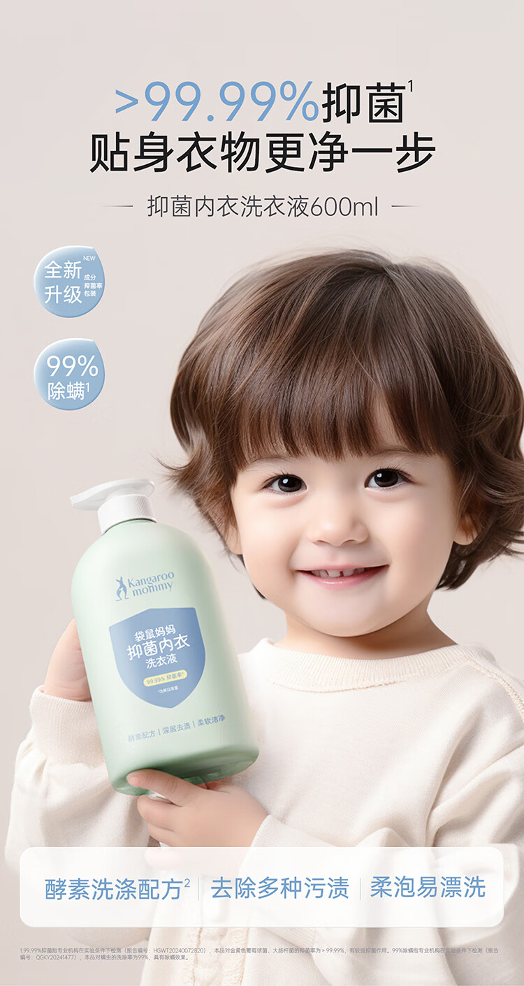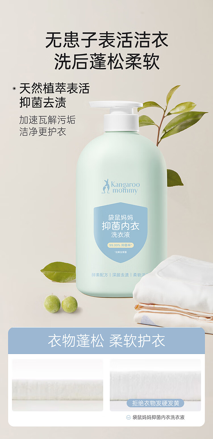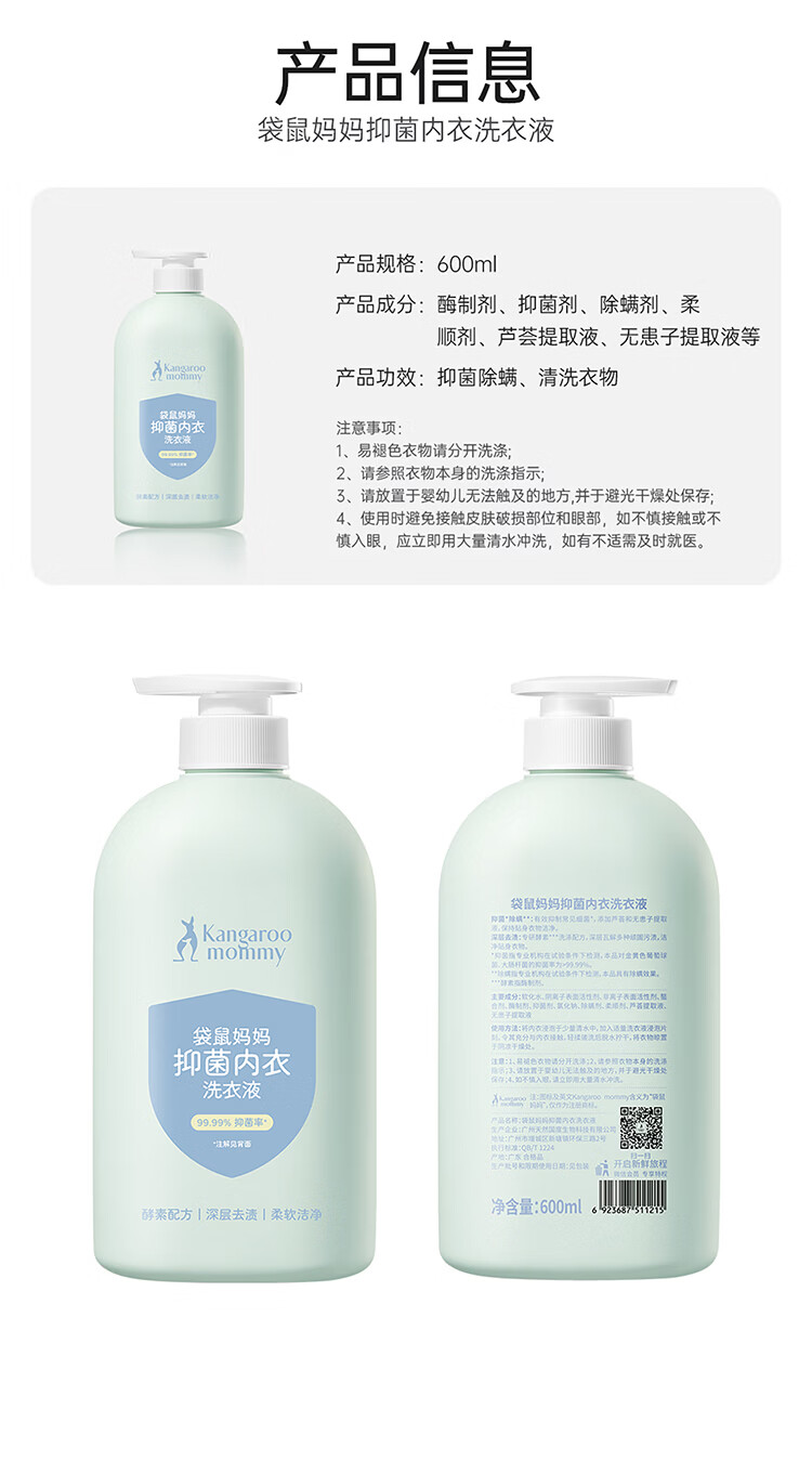 袋鼠妈妈婴儿洗衣液宝宝专用新生婴幼儿内衣裤去污渍酵素抑菌除螨清洗液 抑菌洗衣液600ml