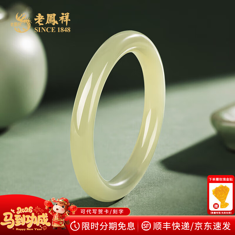 老凤祥翠青色和田玉圆条手镯平安镯玉镯子送女友老婆新年生日礼物 和田玉圆条翠青手镯(#56-58)