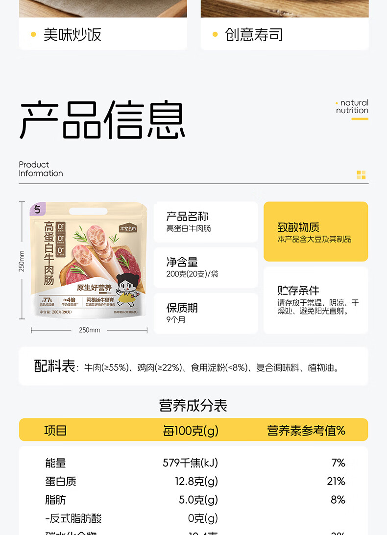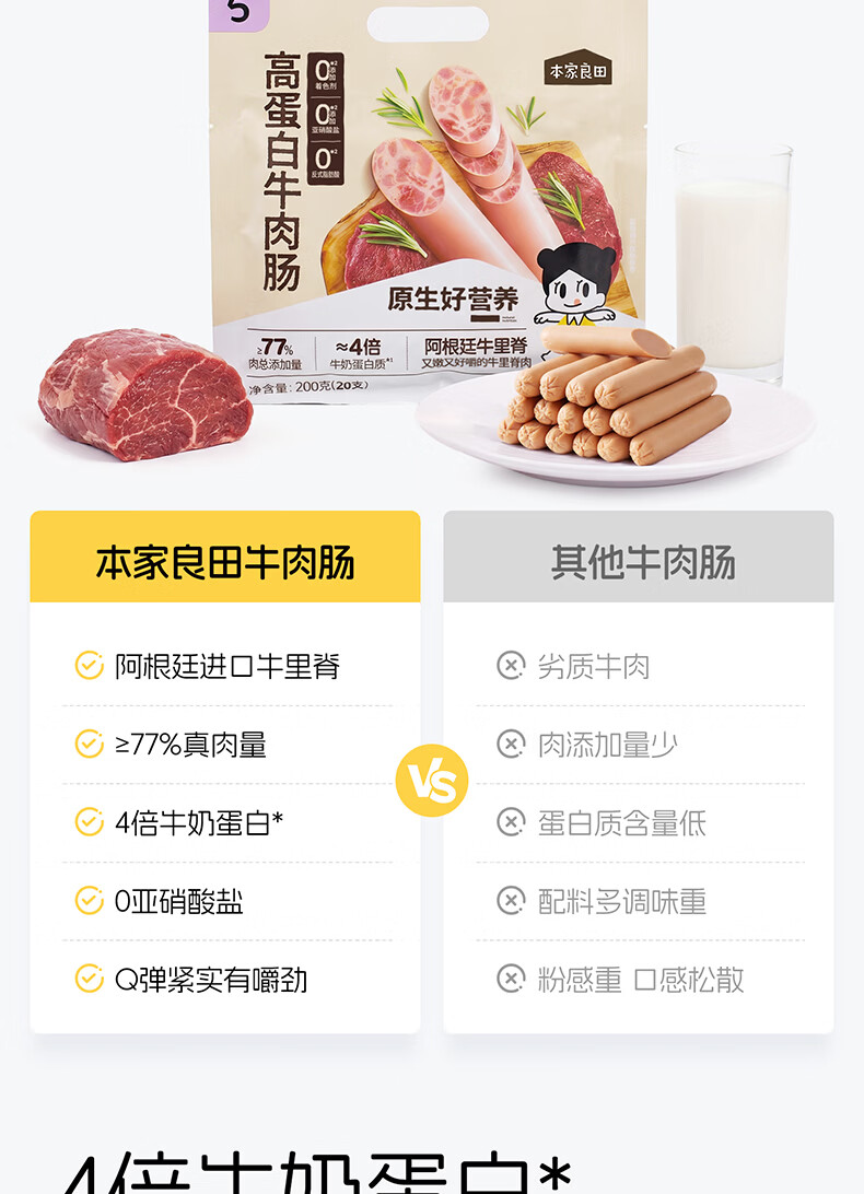 本家良田高蛋白营养牛肉肠200g无添加猪肉火腿肠宝宝儿童零食即食肉肠