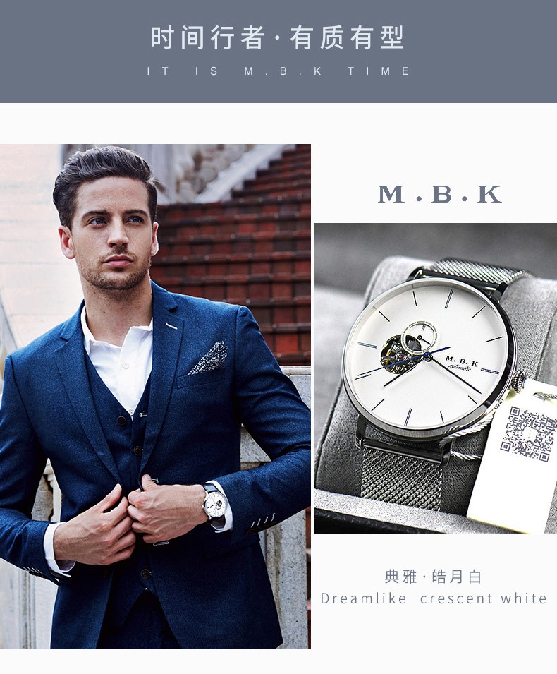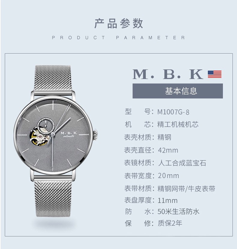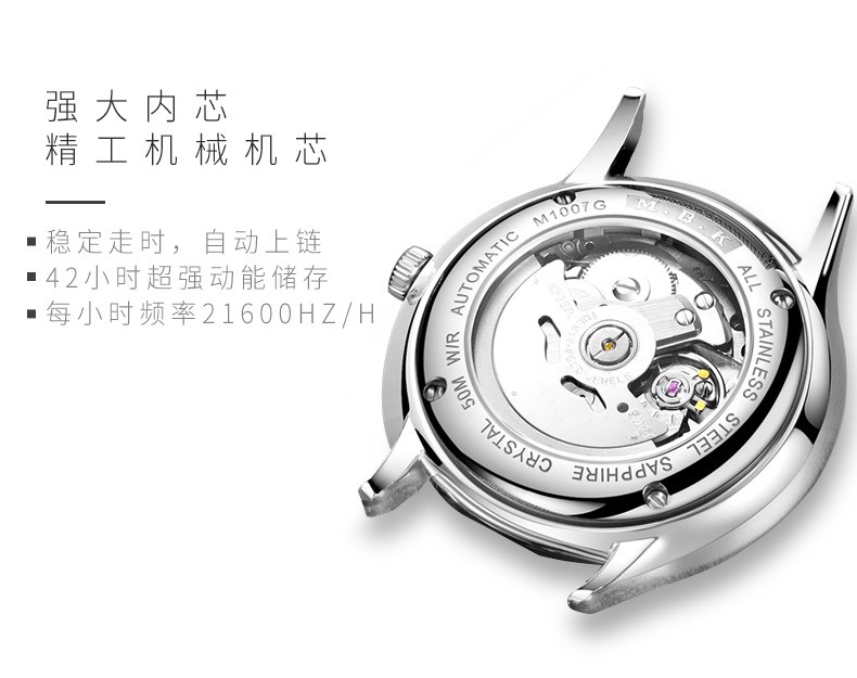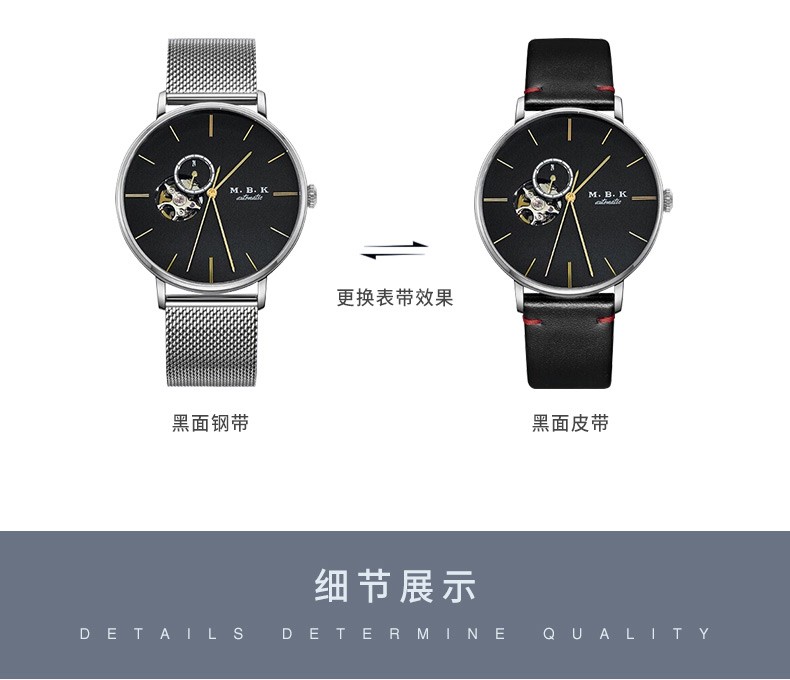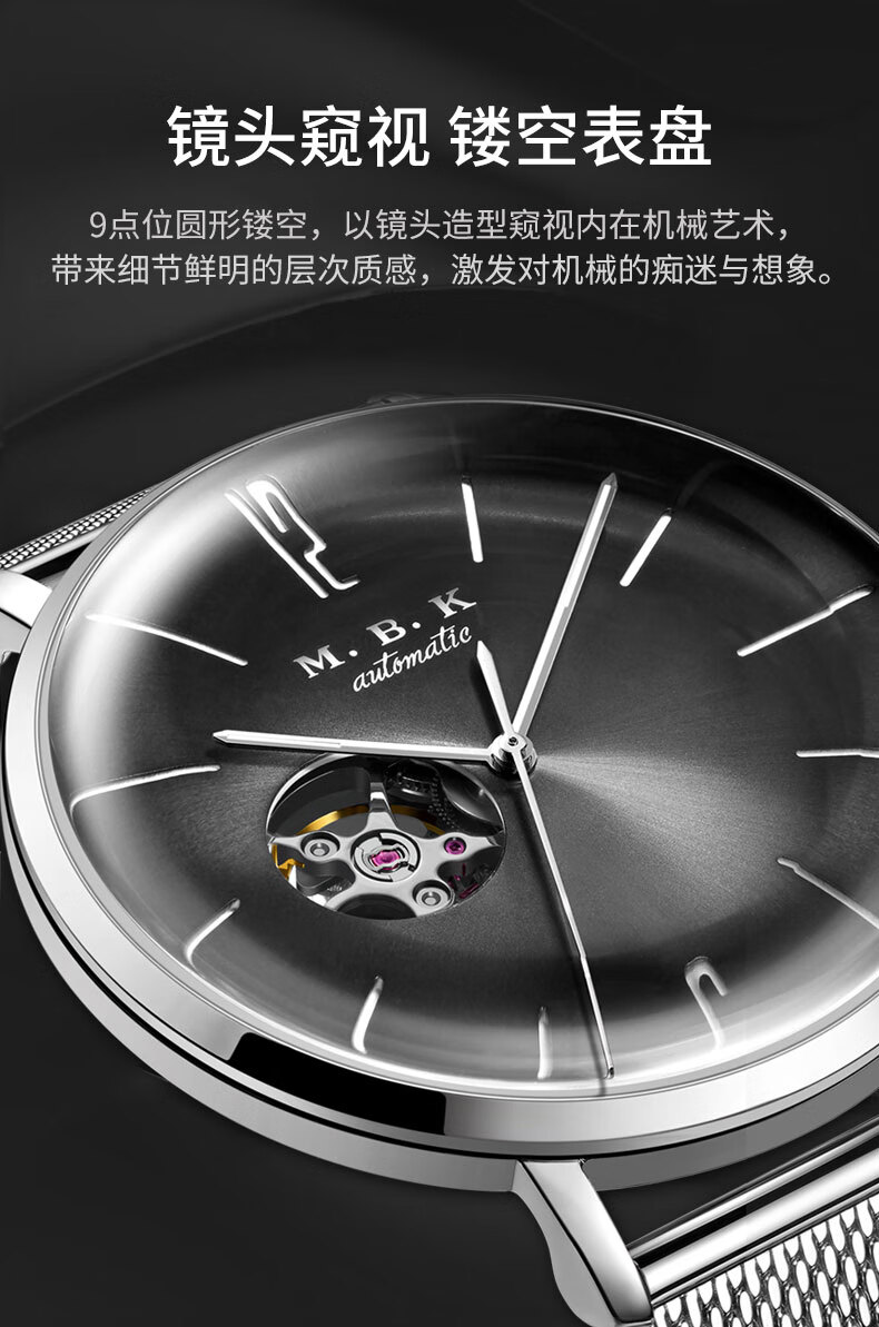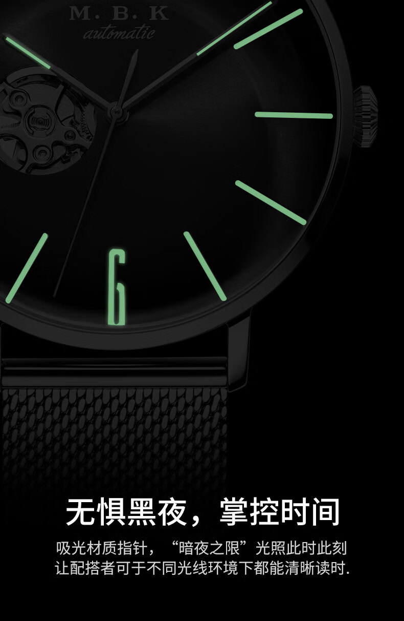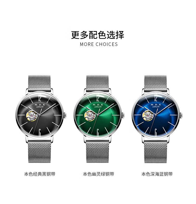 M.B.K美国品牌进口手表男士全自动机械表镂空弧面夜光防水十大男士腕表 M1009G1碧玉绿面皮带进口机芯
