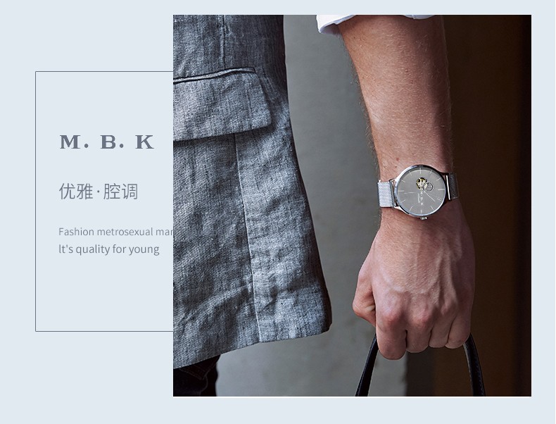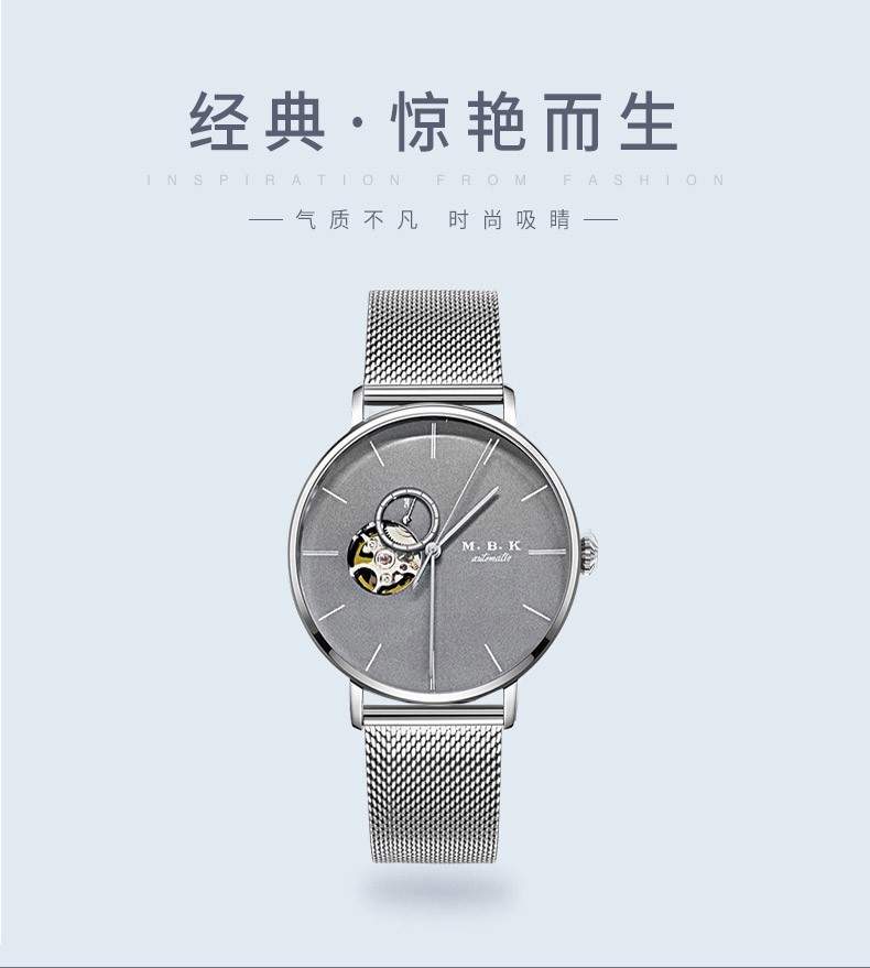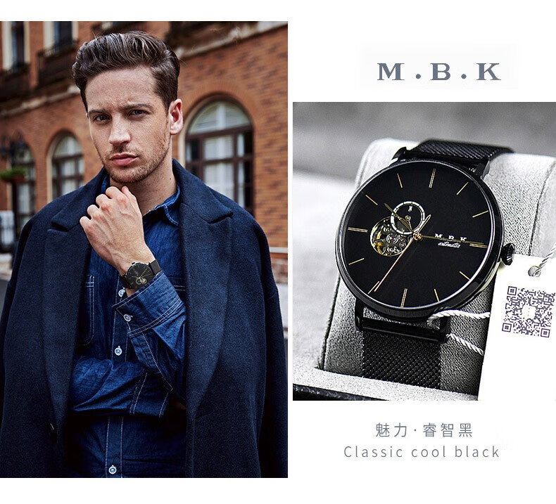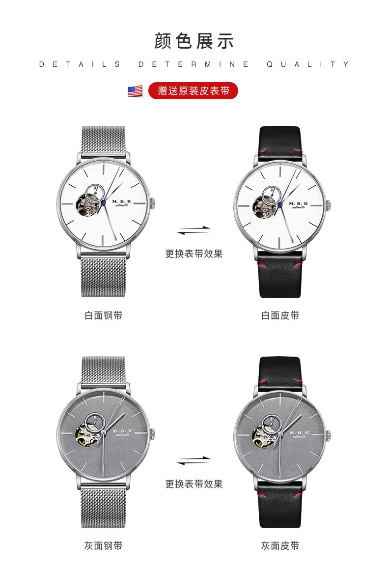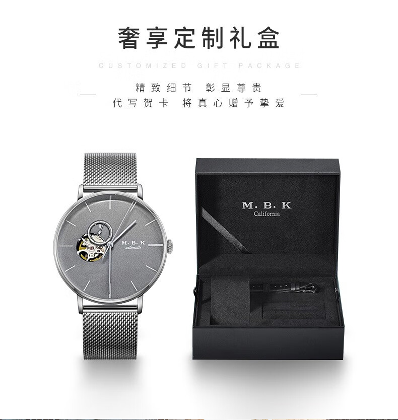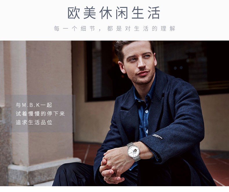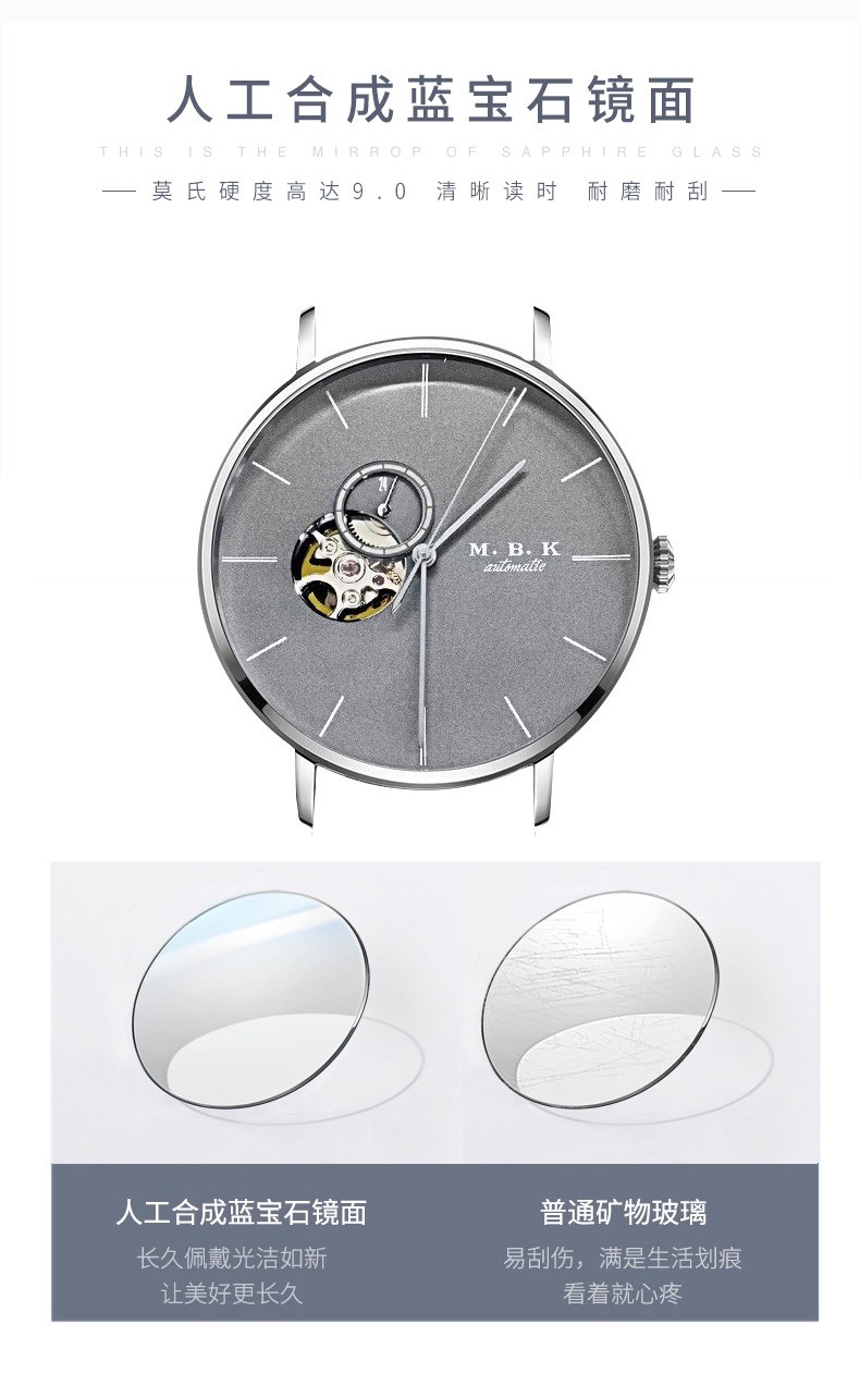 M.B.K美国品牌进口手表男士全自动机械表镂空弧面夜光防水十大男士腕表 M1009G1碧玉绿面皮带进口机芯