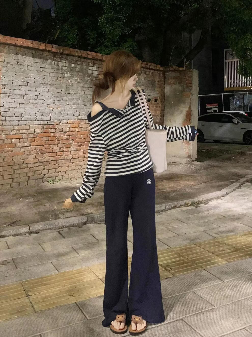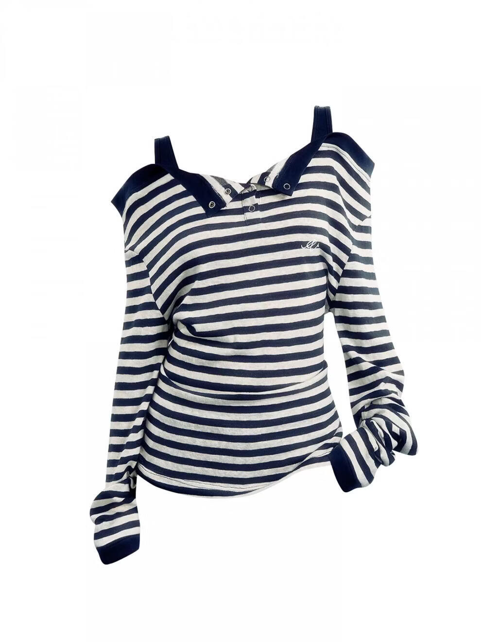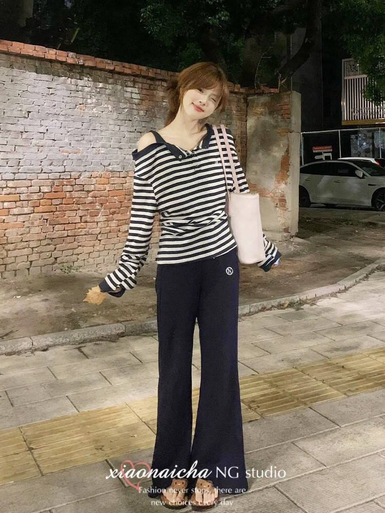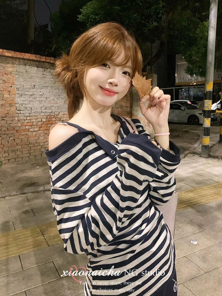 MODX美式甜辣风条纹一字肩长袖恤女2025秋季新款假两件休闲吊带上衣 藏青色条纹假两件 XL 建议120-135斤