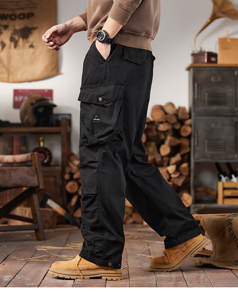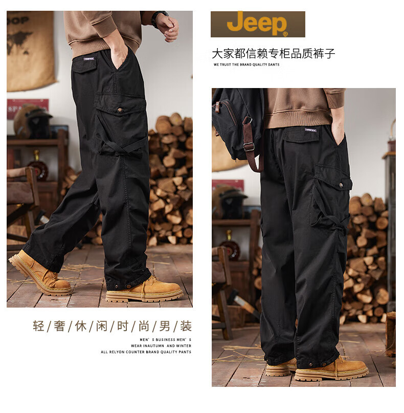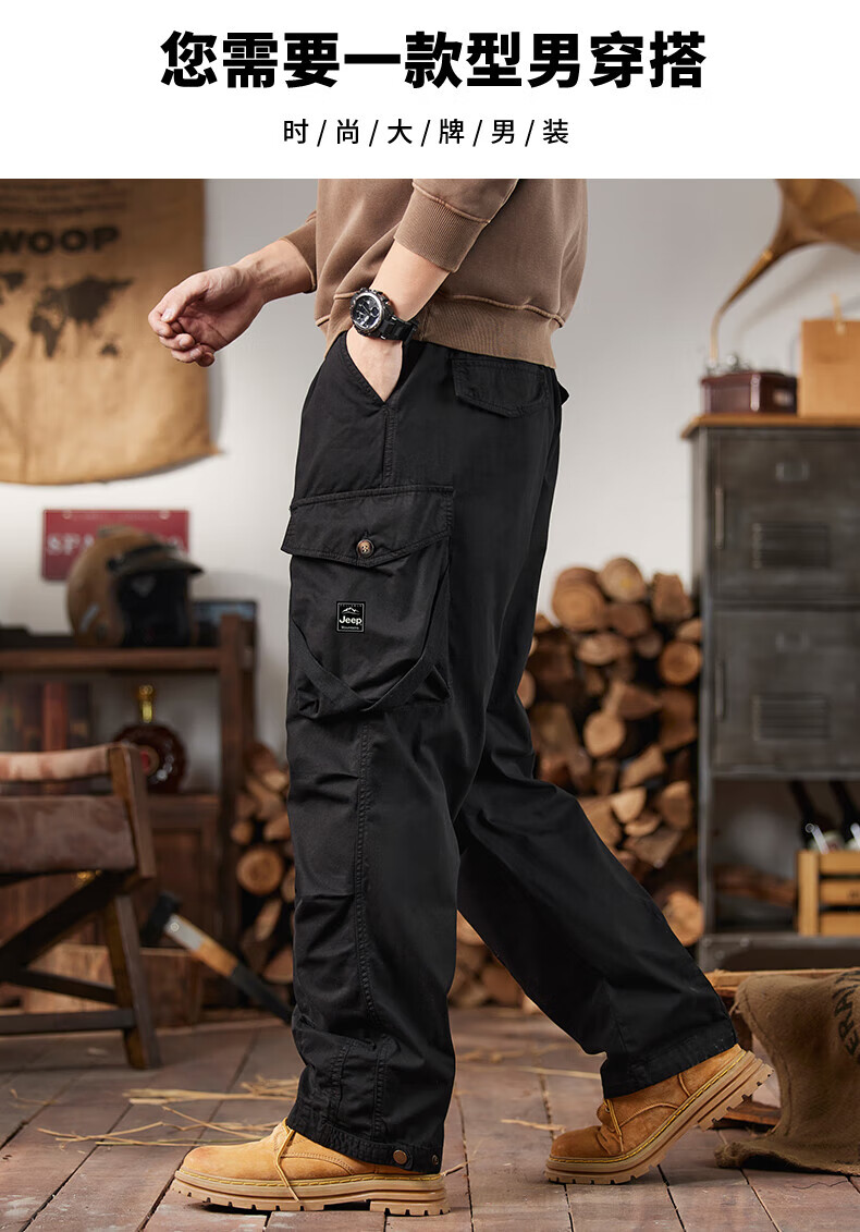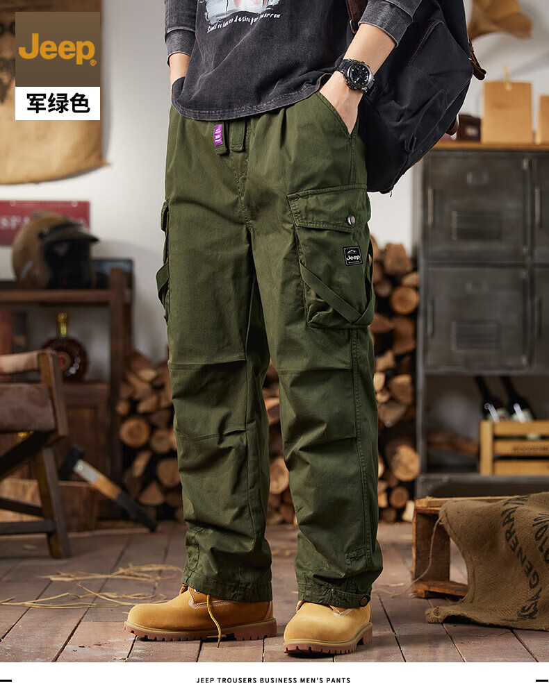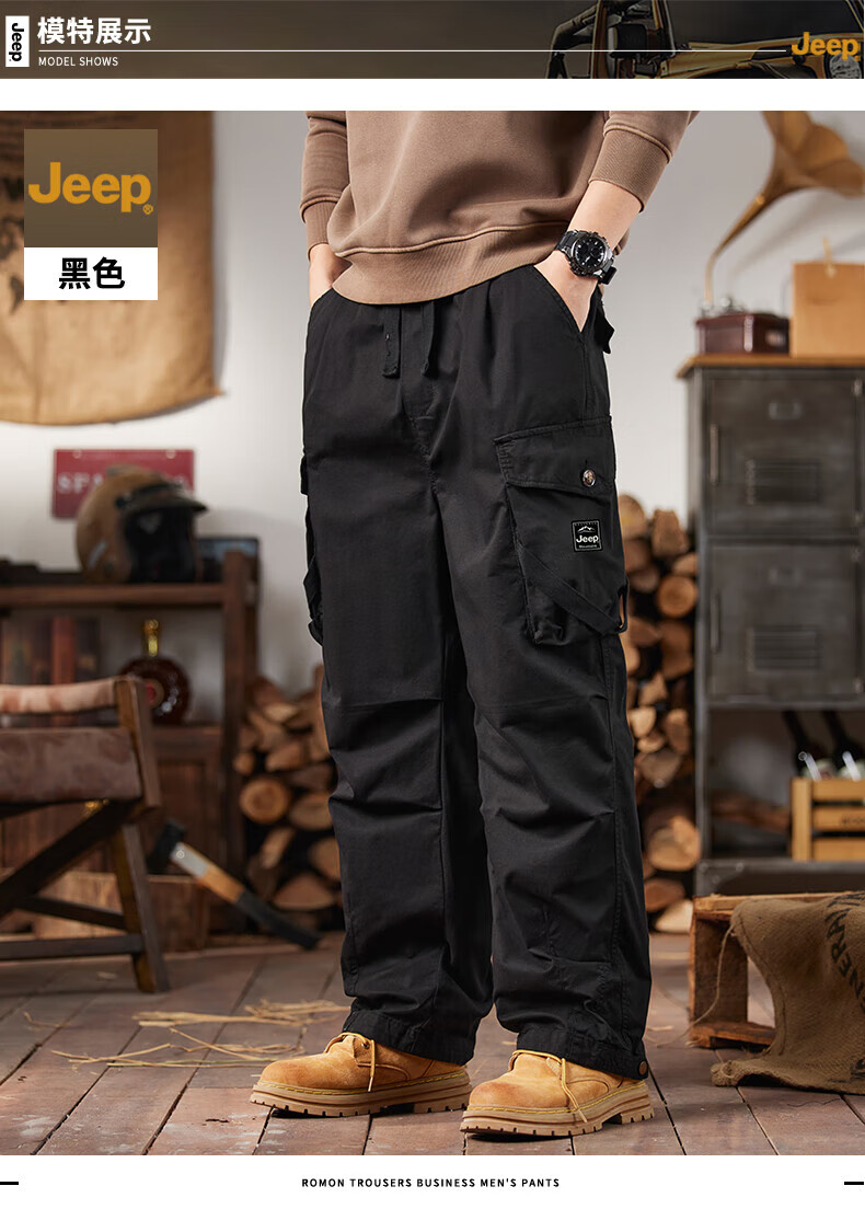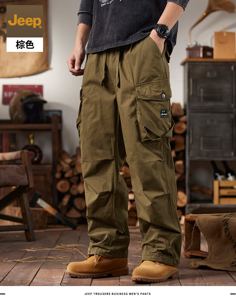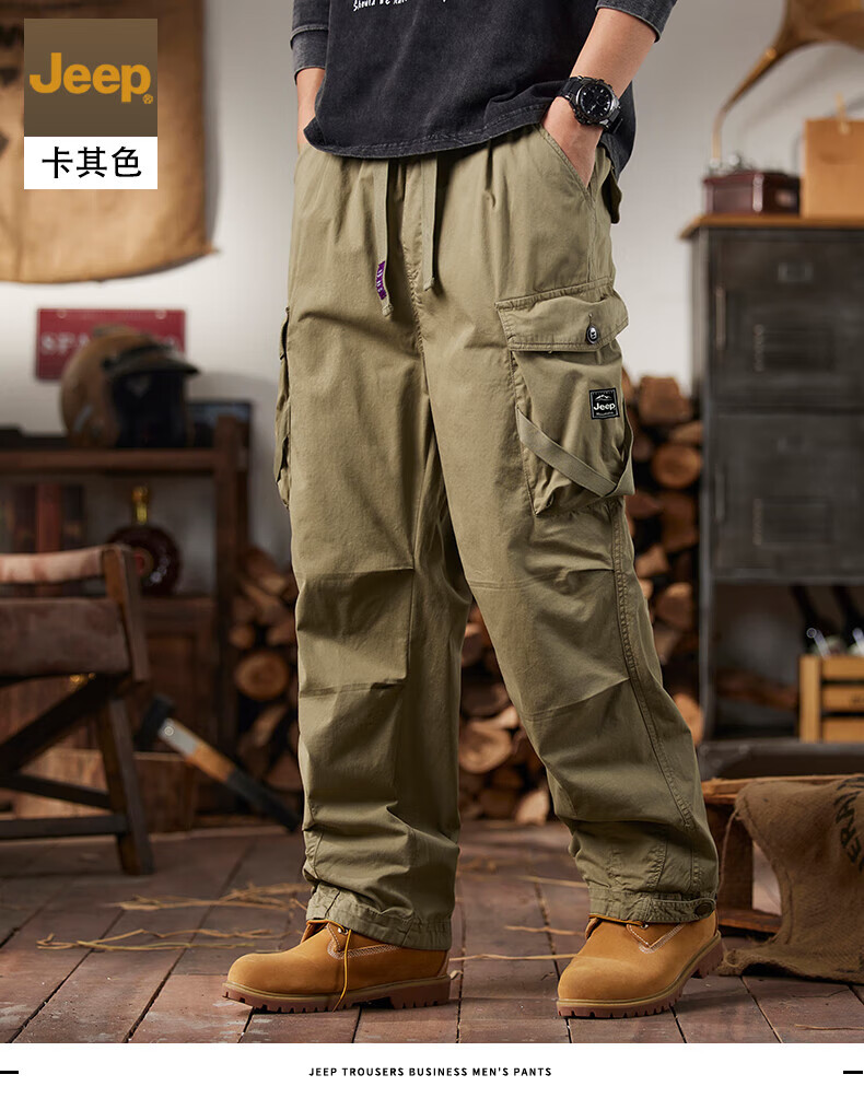 JEEP美国正品Jeep高端纯棉工装休闲裤春秋男士户外宽松多口袋阔腿长裤 1723卡其色 【官方正品】 3XL 【推荐体重180-200斤】