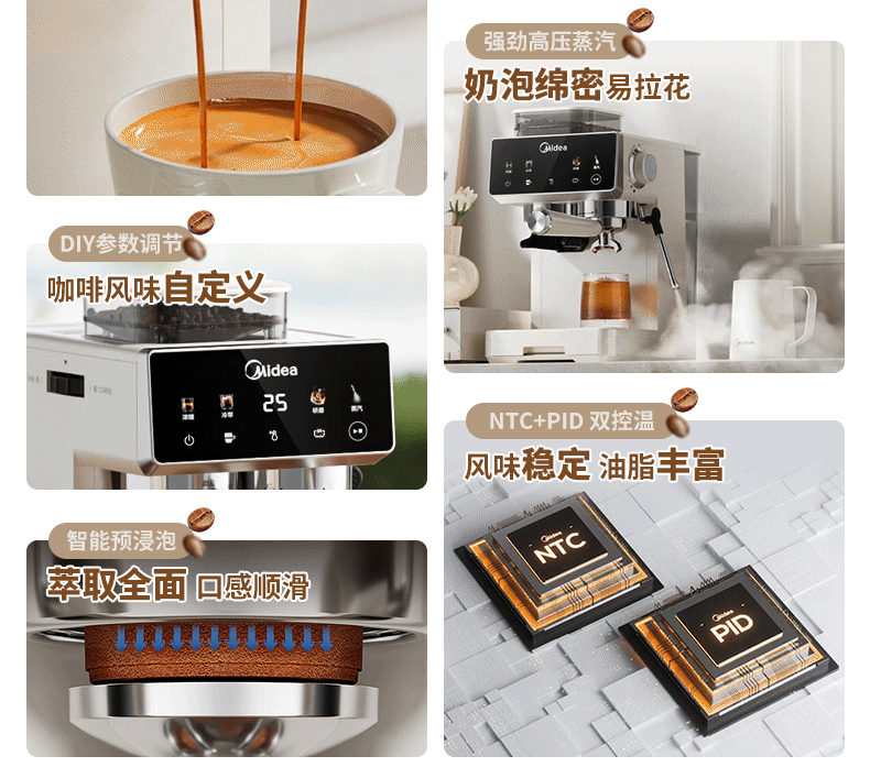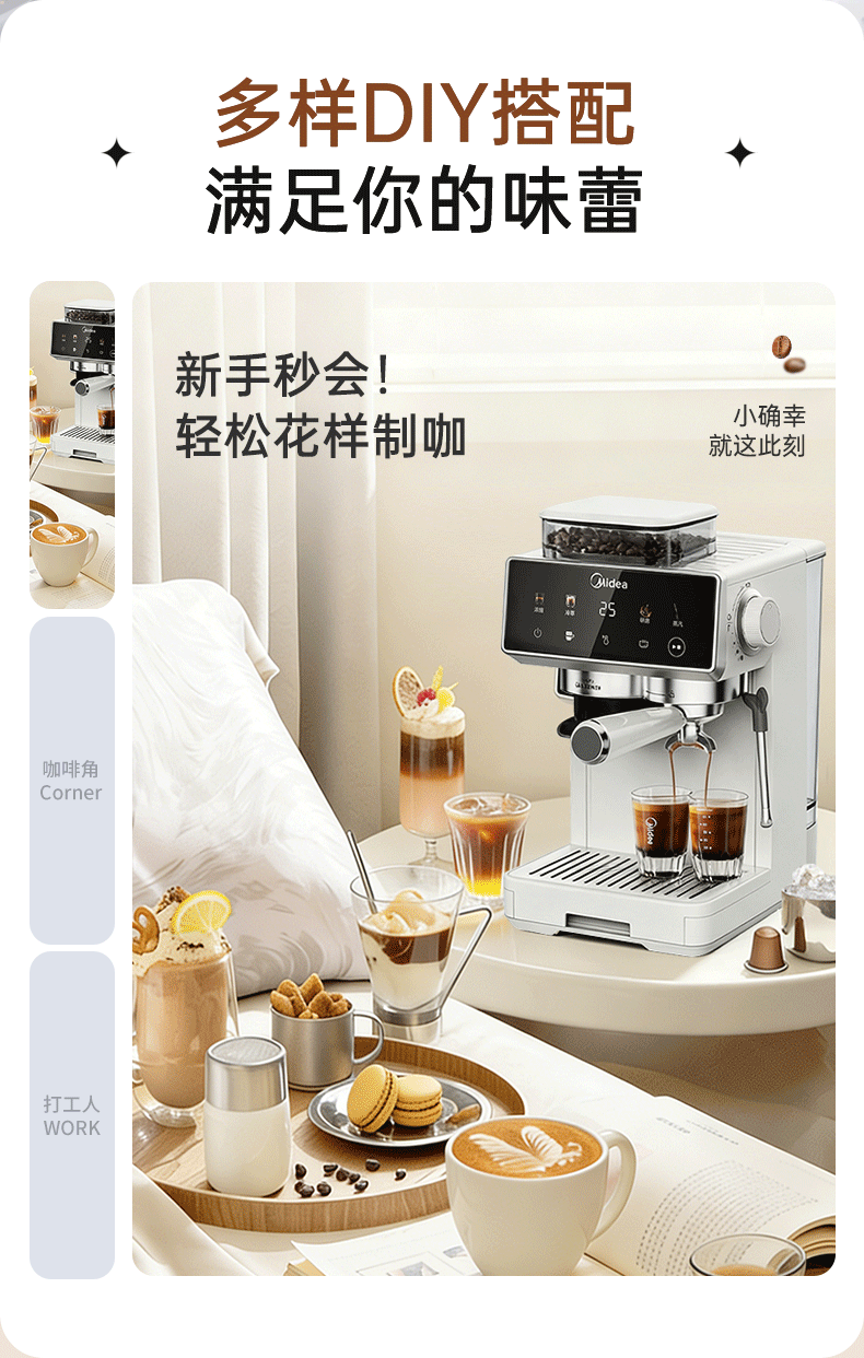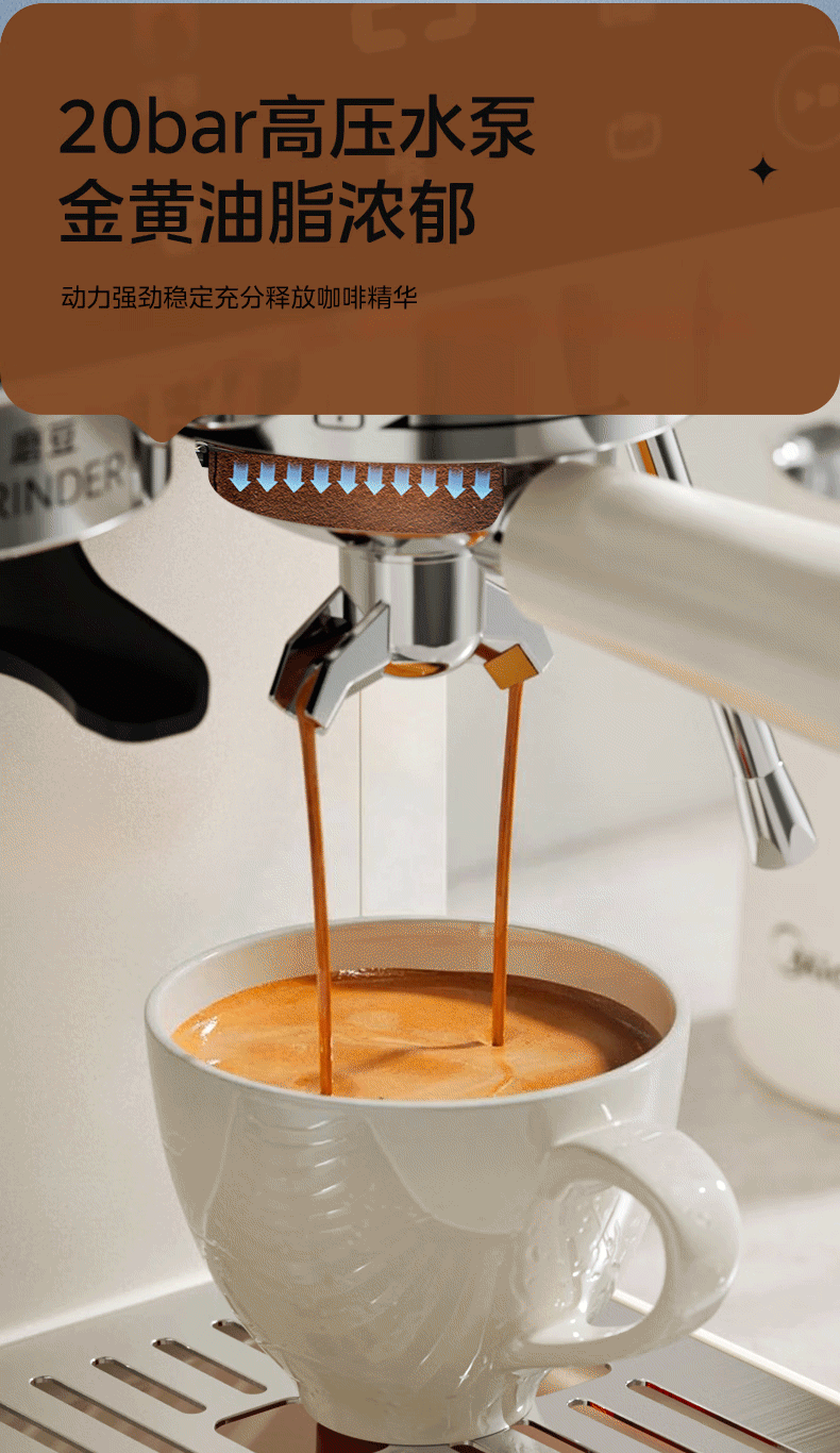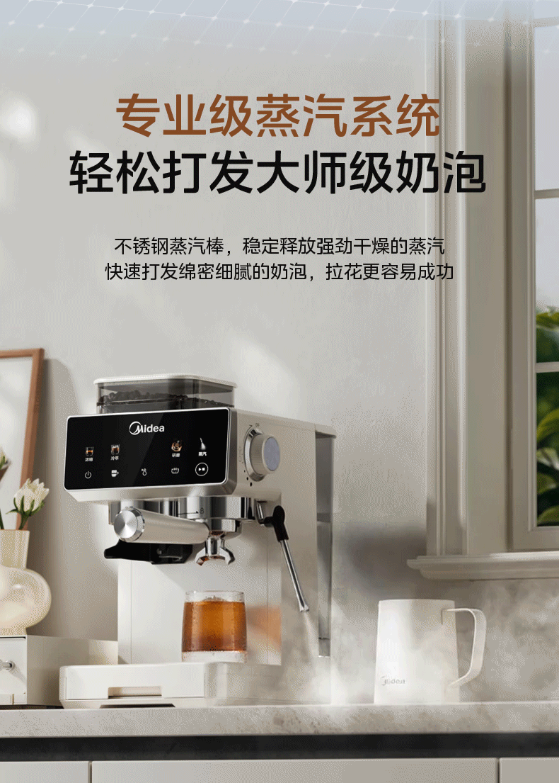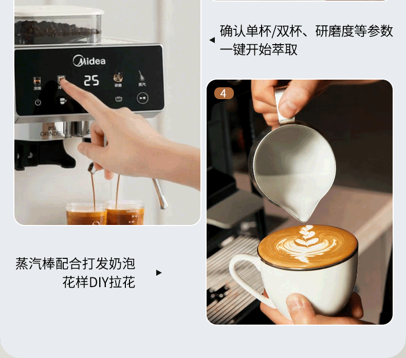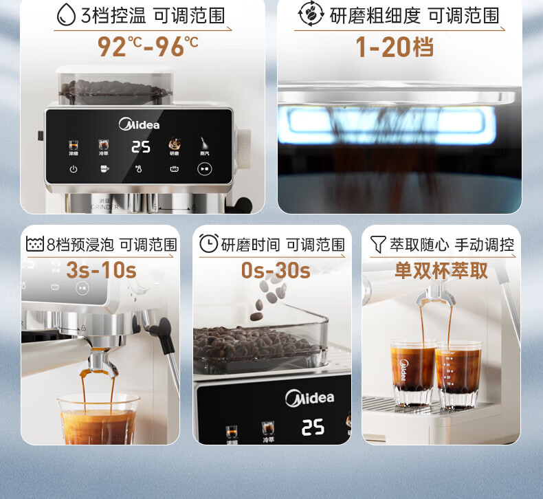 美的(Midea)意式半自动咖啡机冷热双萃研磨一体机全自动家用磨豆咖啡机可打奶泡MA-GE5110