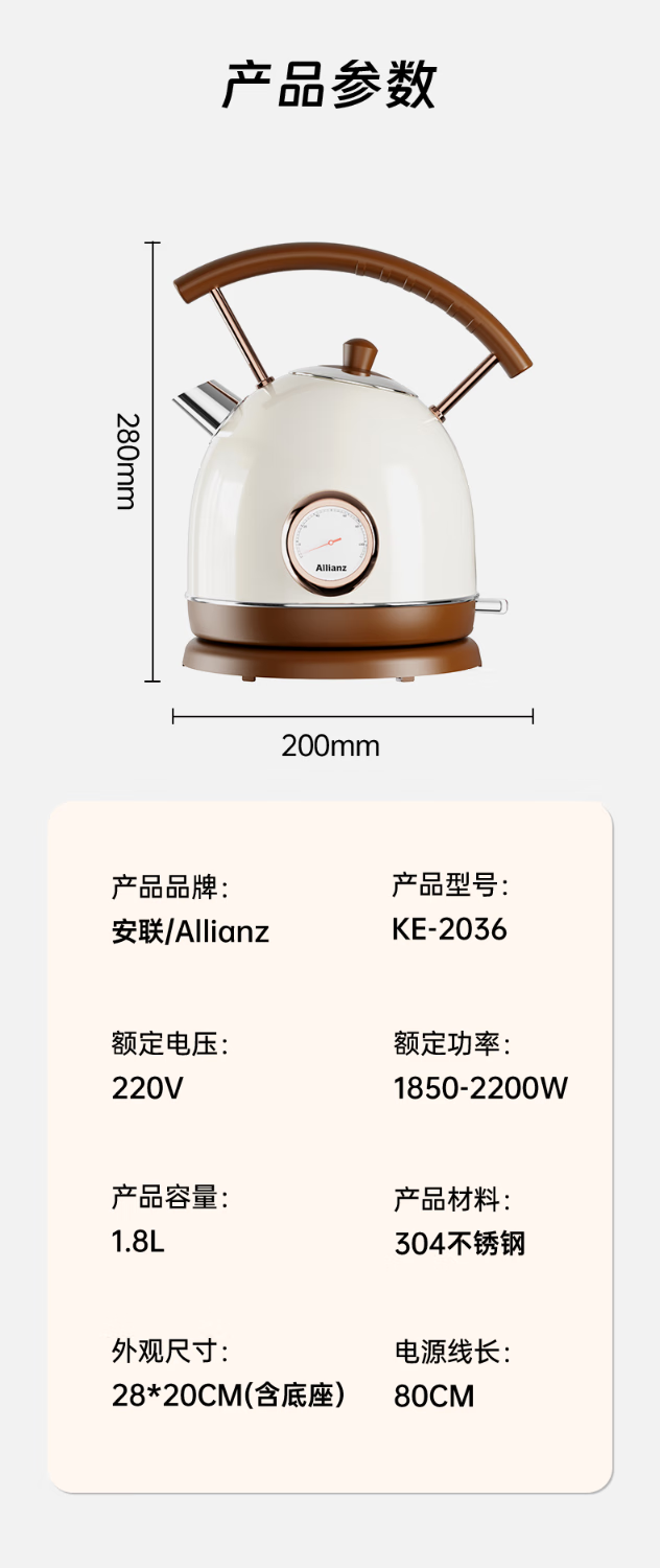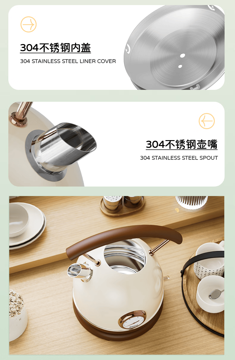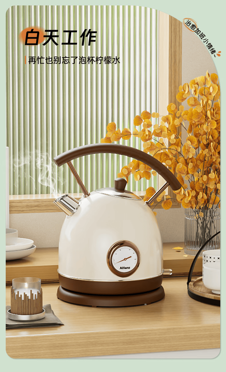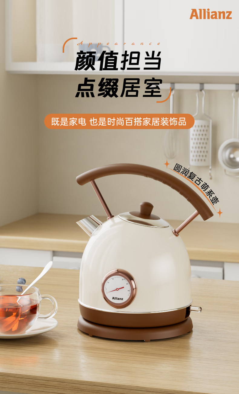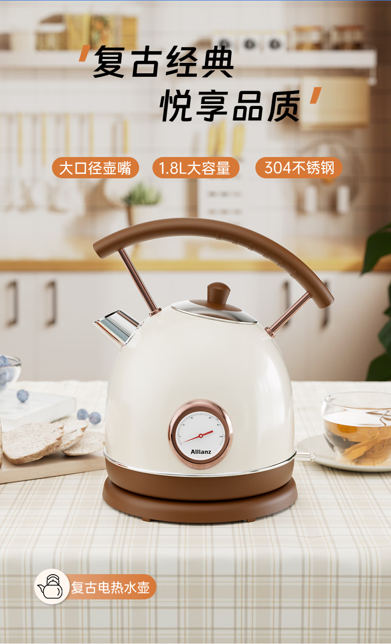 安联电热水壶大容量家用烧水壶304不锈钢自动断电热开水壶茶壶泡茶专用 复古米黄-手柄棕
