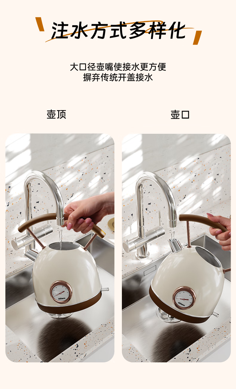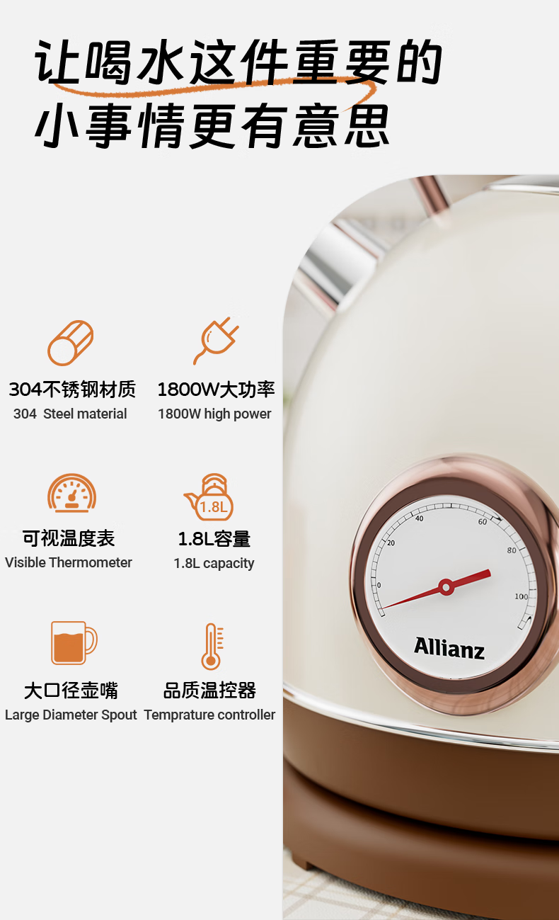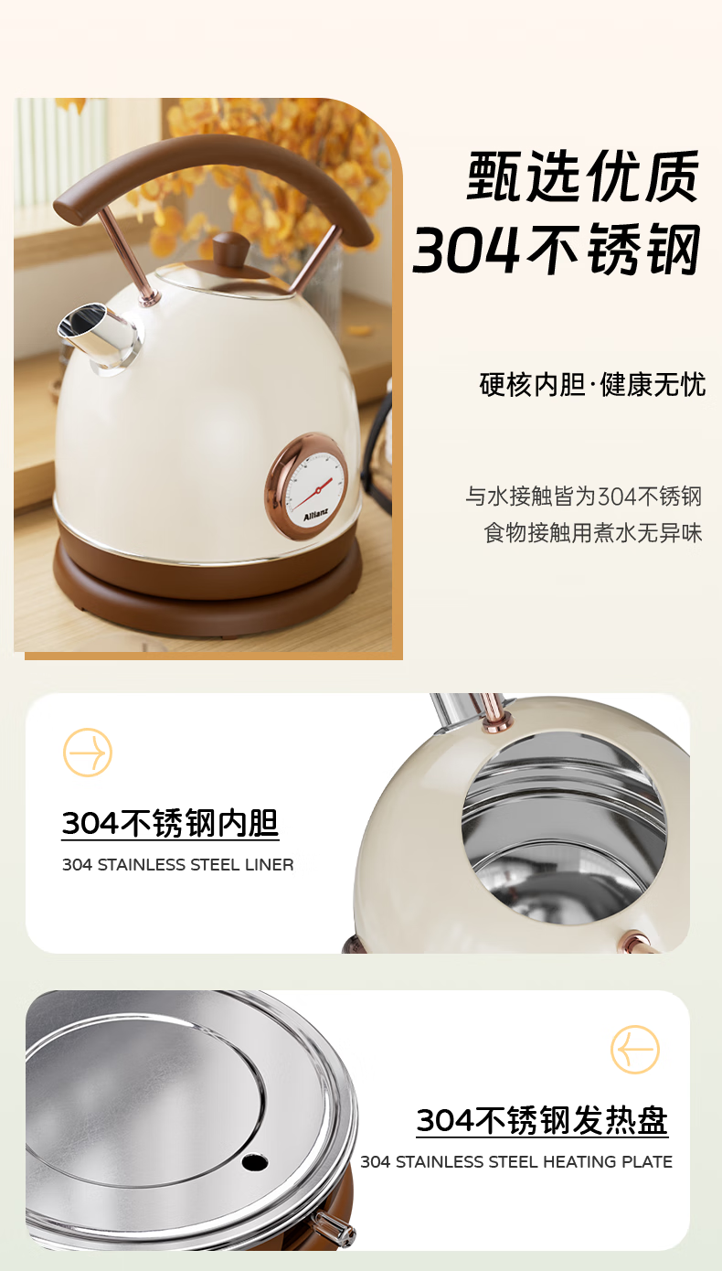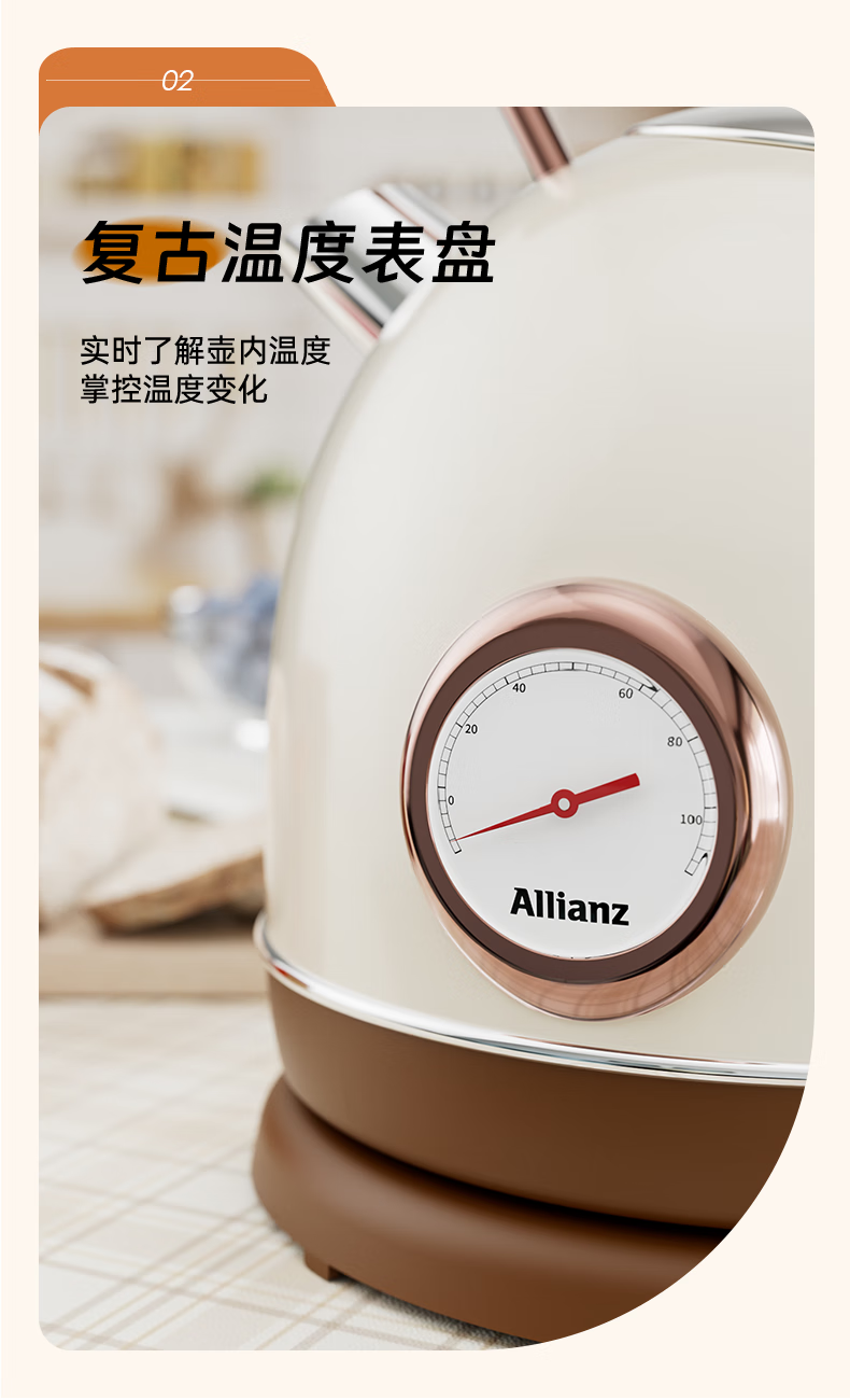 安联电热水壶大容量家用烧水壶304不锈钢自动断电热开水壶茶壶泡茶专用 复古米黄-手柄棕