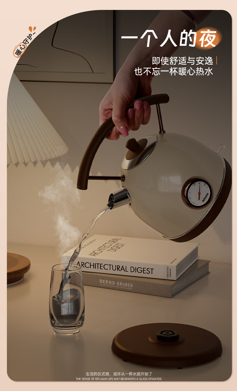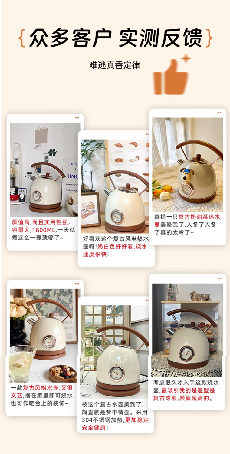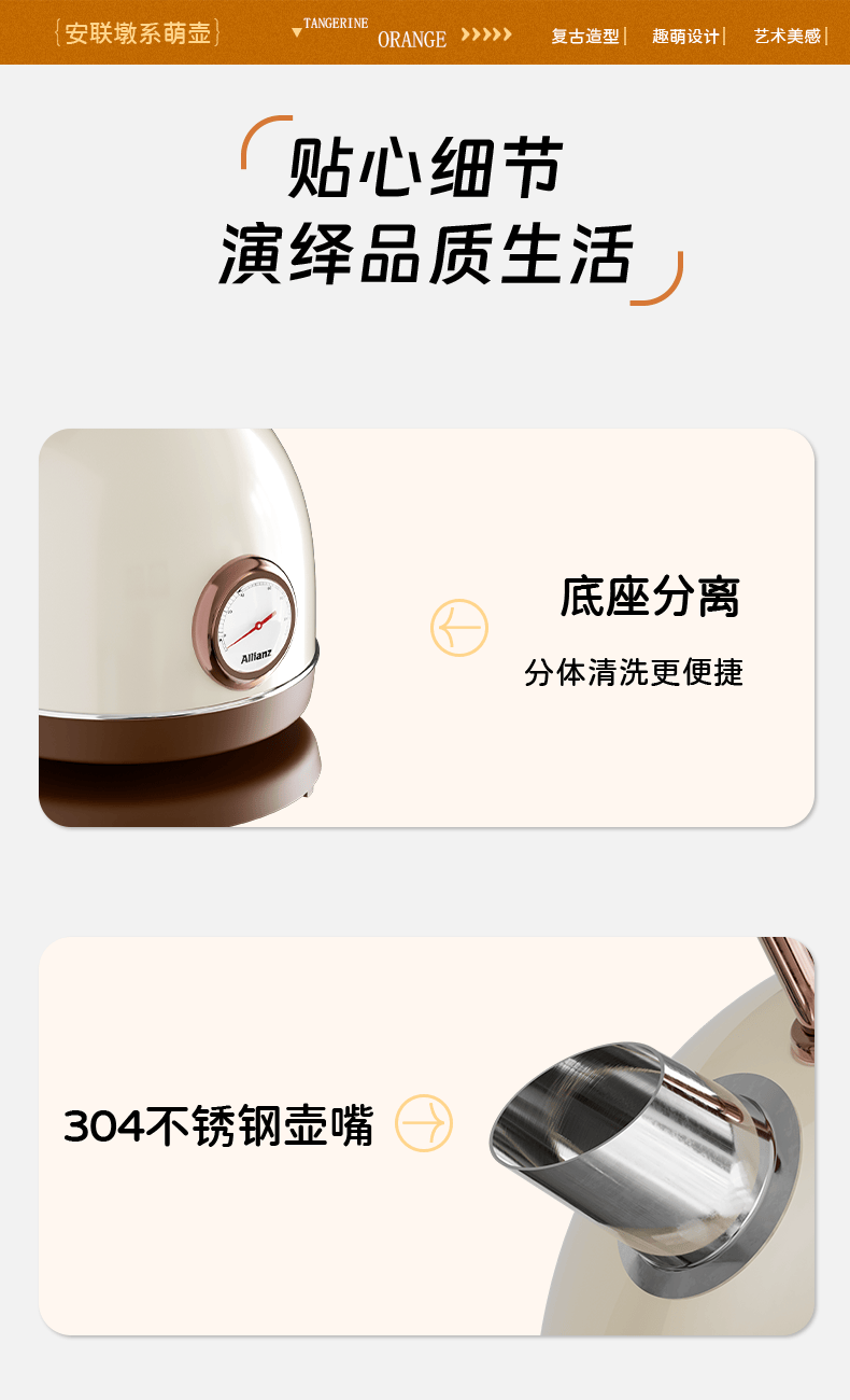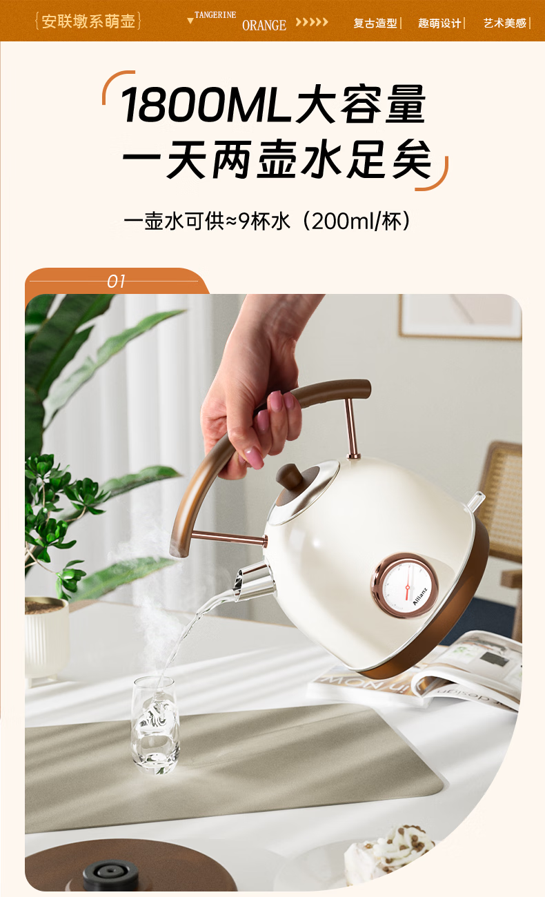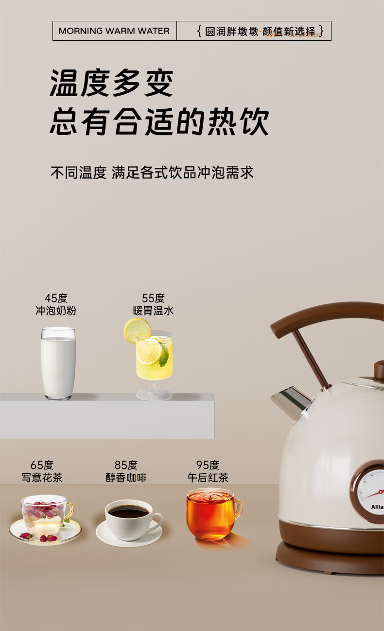 安联电热水壶大容量家用烧水壶304不锈钢自动断电热开水壶茶壶泡茶专用 复古米黄-手柄棕