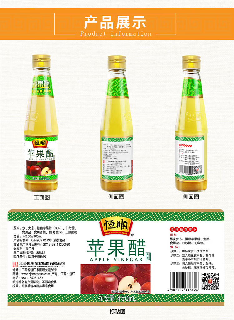 恒顺苹果醋 2.5度 450ml 中华老字号 春节大餐解腻
