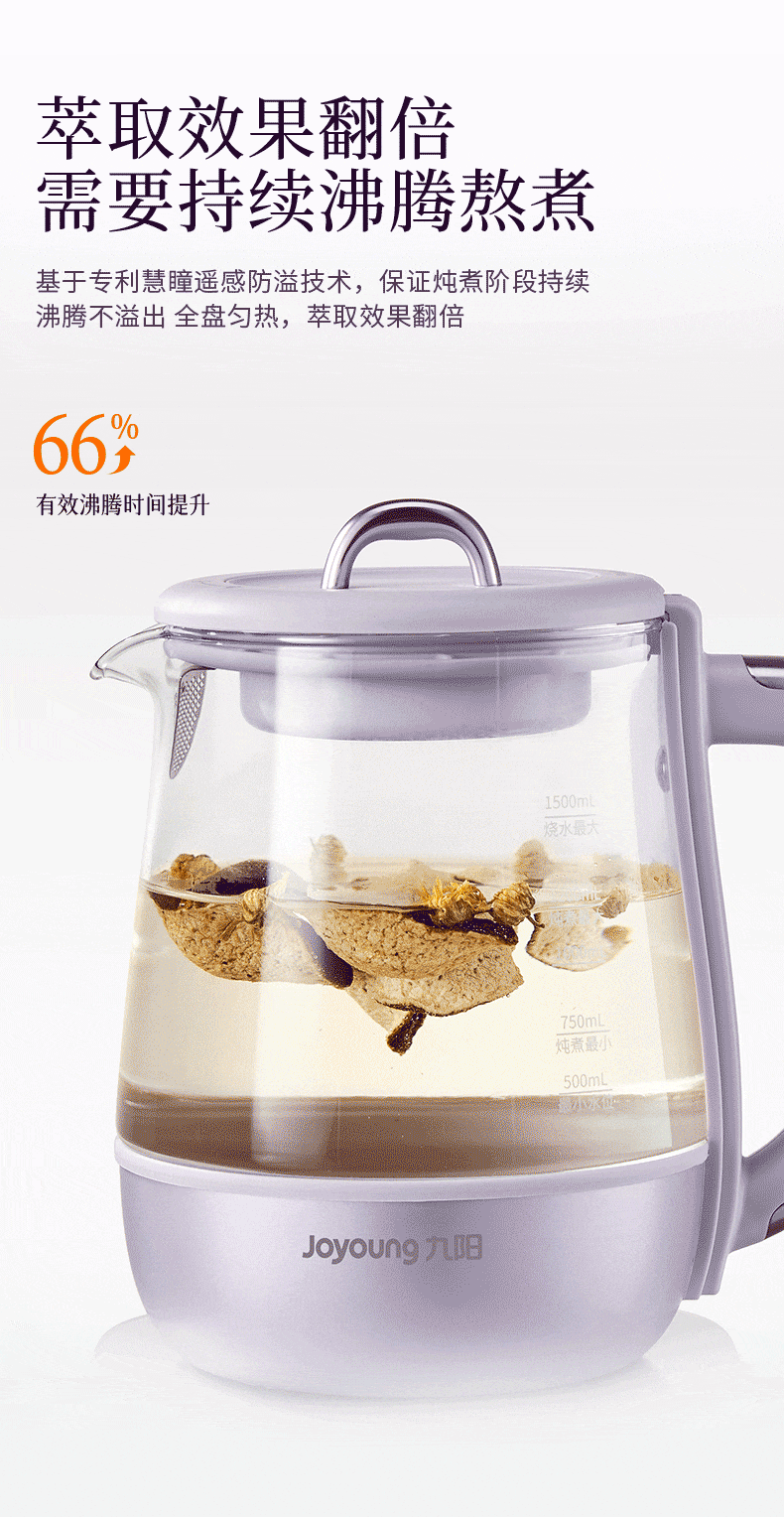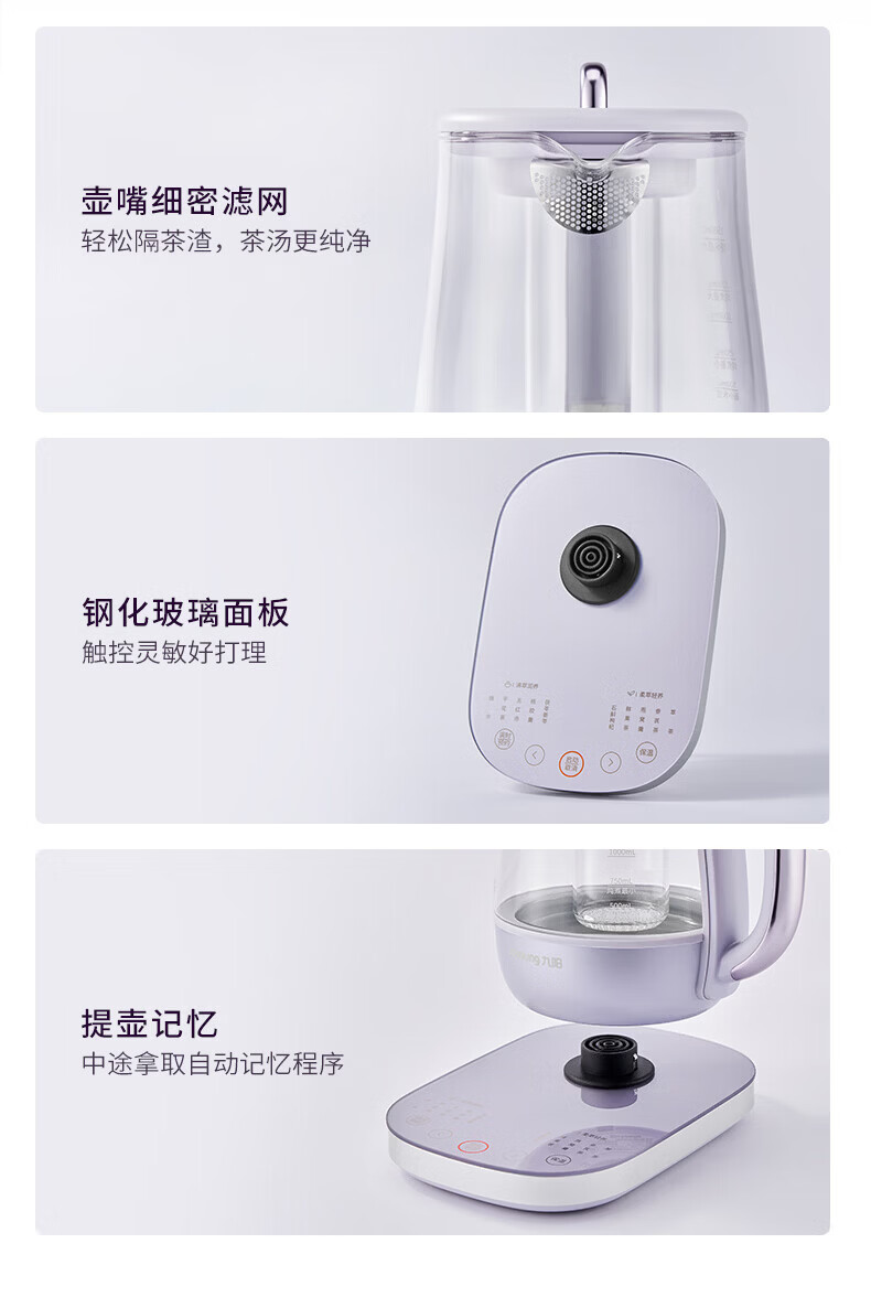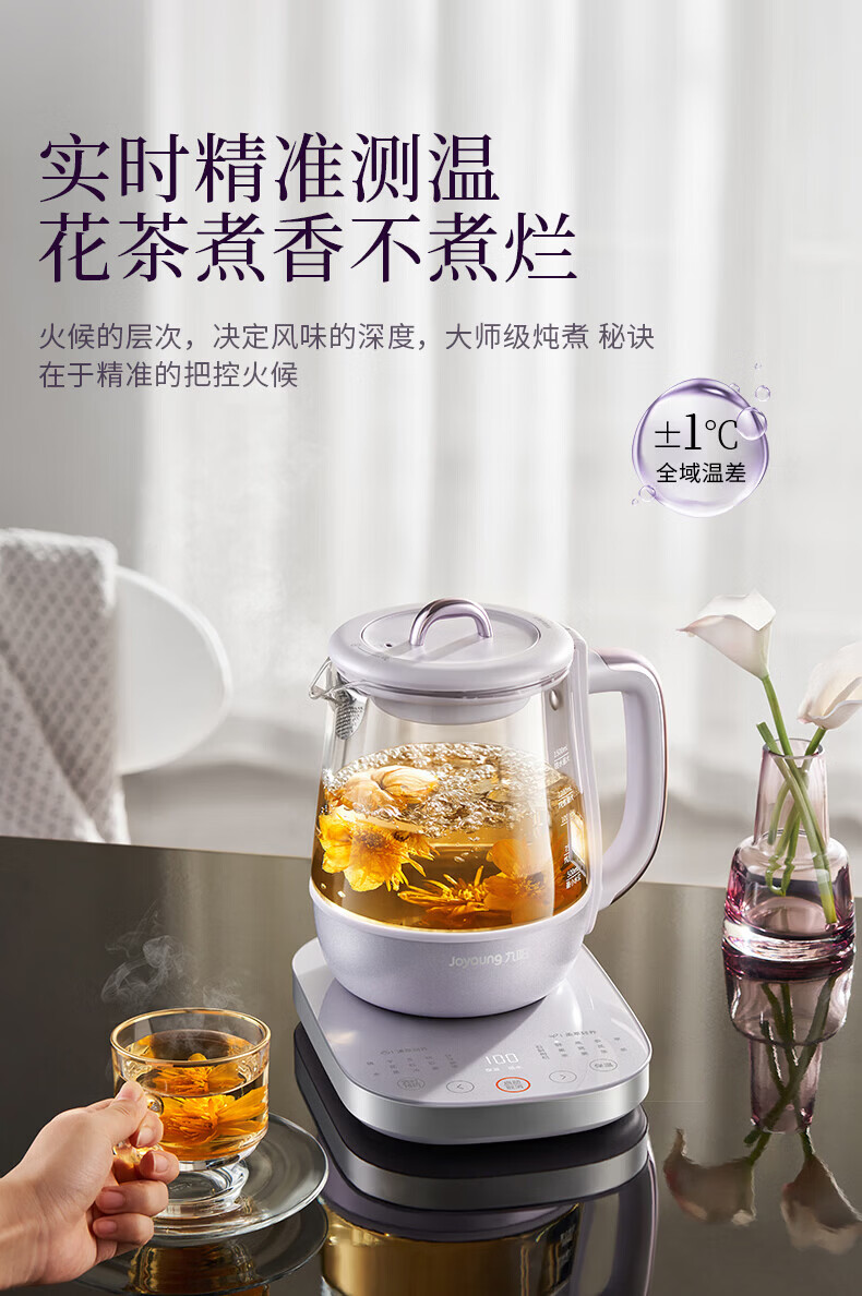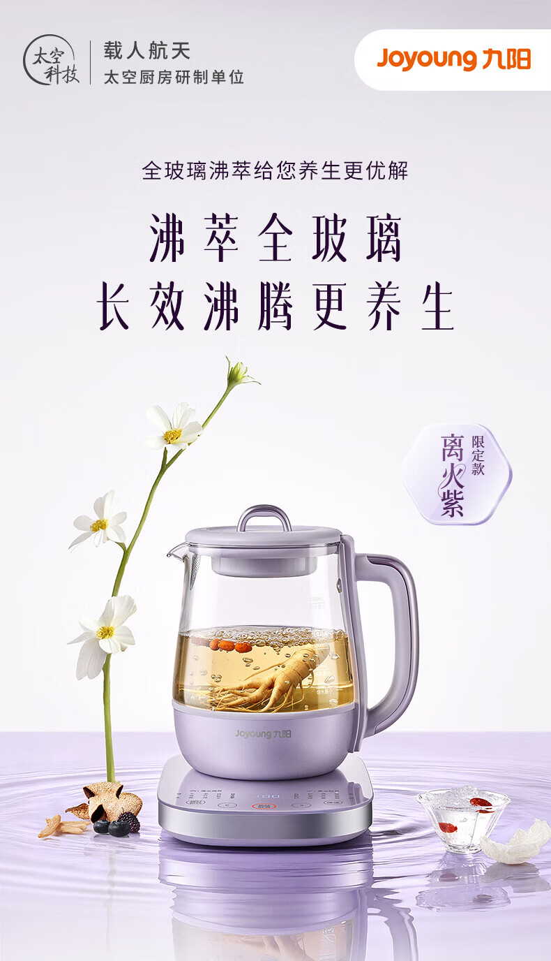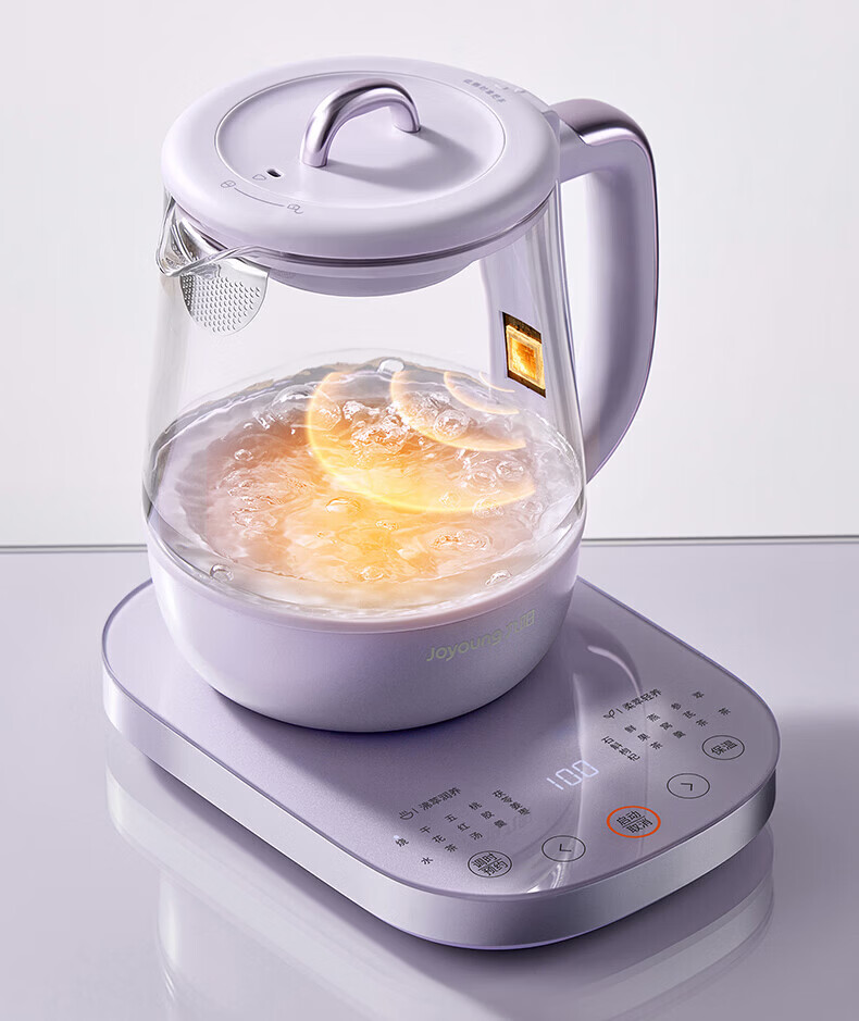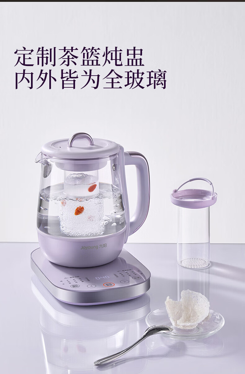 Joyoung全玻璃沸萃养生壶1.5L煮茶器 0胶水玻璃滤网炖盅 花茶壶烧水保温一体全自动恒温电热水壶15WY10J 1.5L 【全玻璃沸萃】限定离火紫