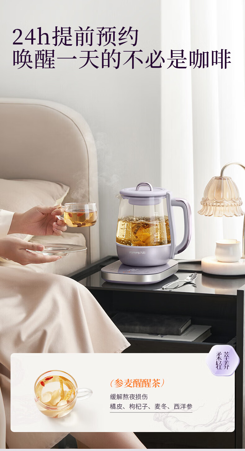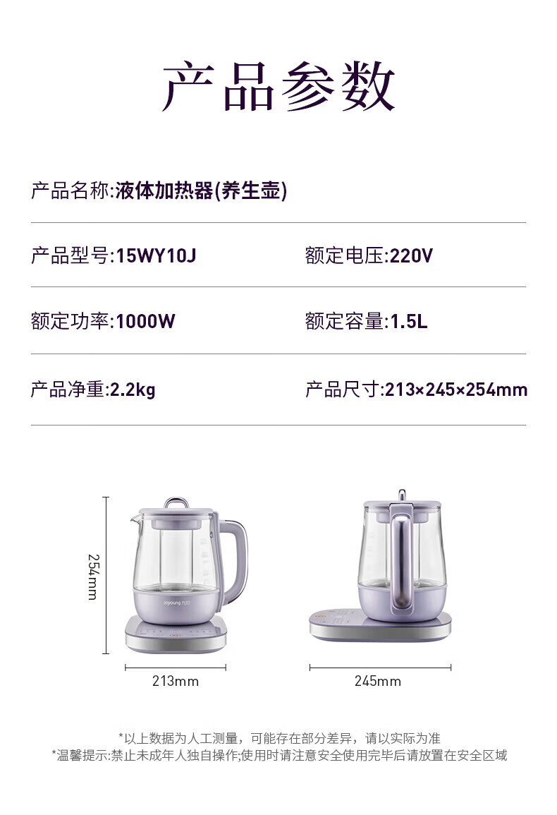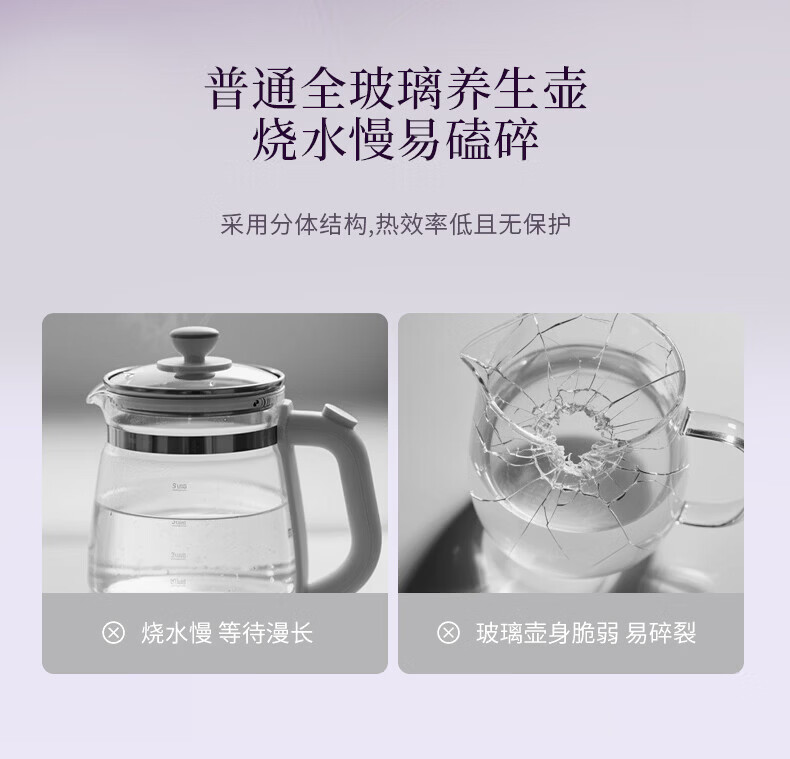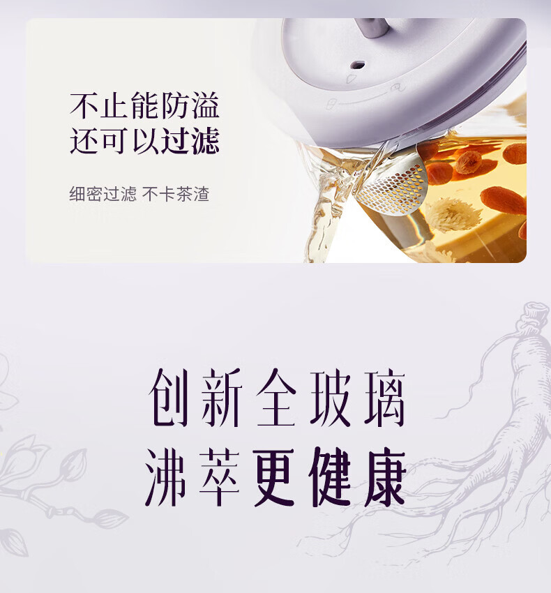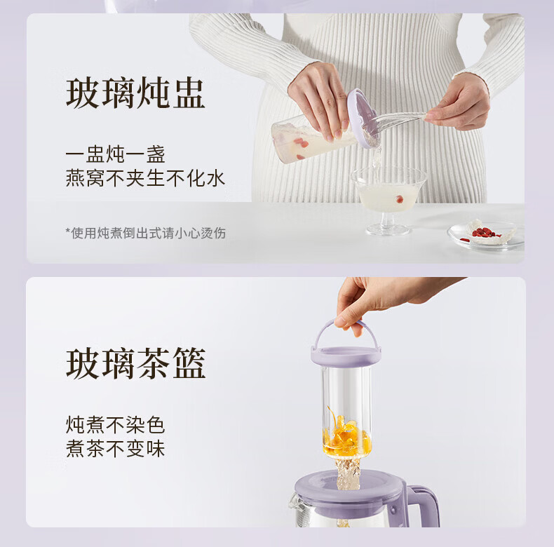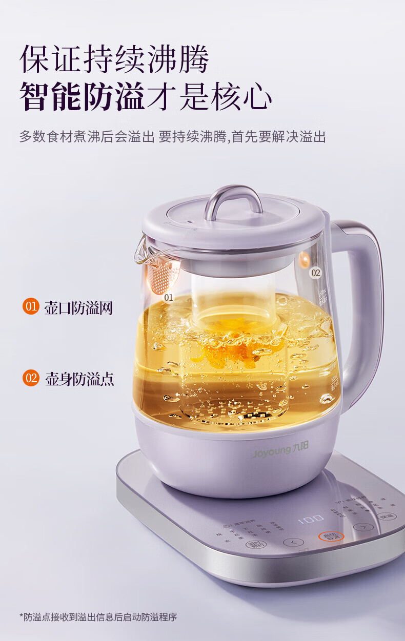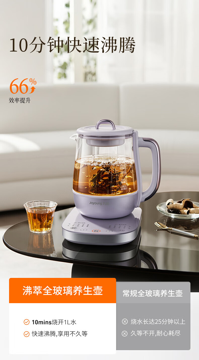 Joyoung全玻璃沸萃养生壶1.5L煮茶器 0胶水玻璃滤网炖盅 花茶壶烧水保温一体全自动恒温电热水壶15WY10J 1.5L 【全玻璃沸萃】限定离火紫