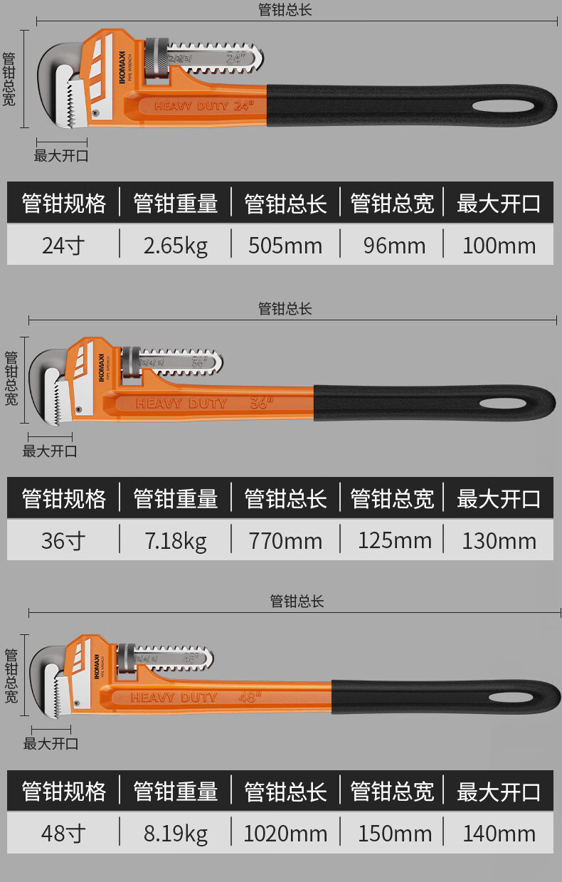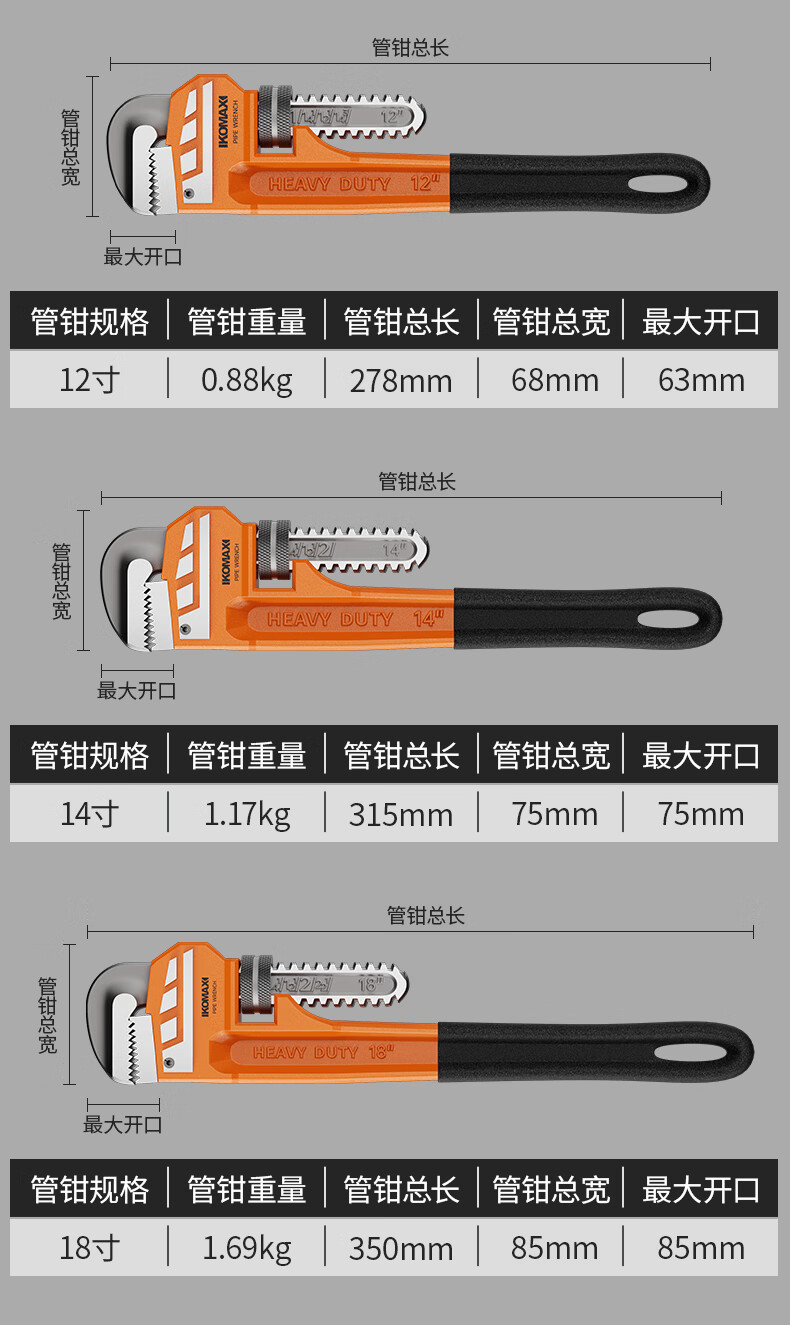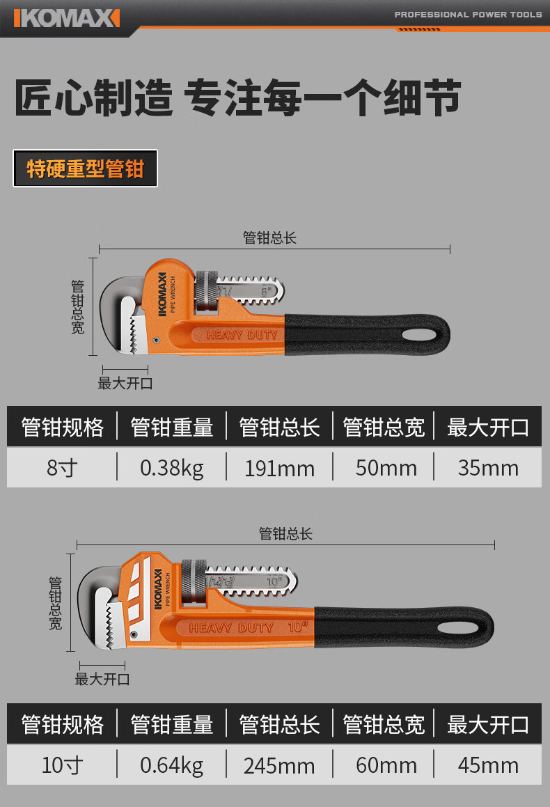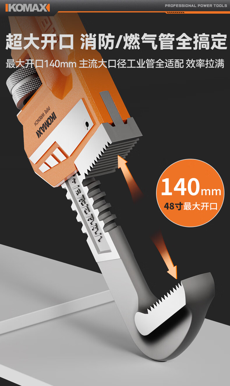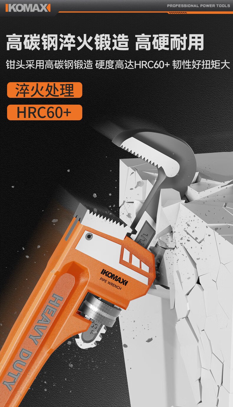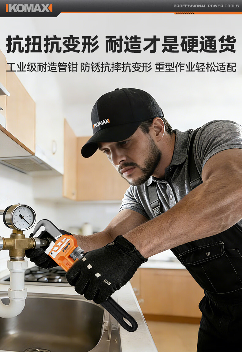 科麦斯(KOMAX)重型管钳管子钳扳手加强水管钳子 大开口紧喉钳多功能沾塑管钳 特硬重型管钳8寸