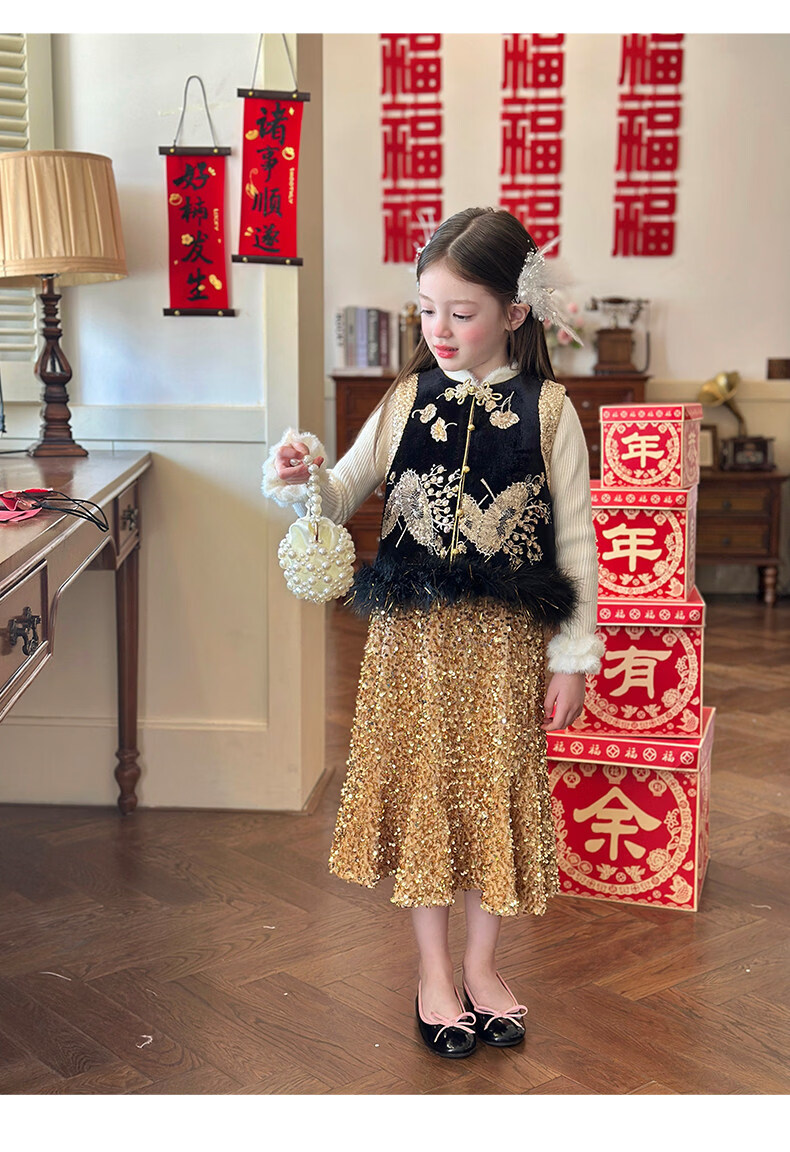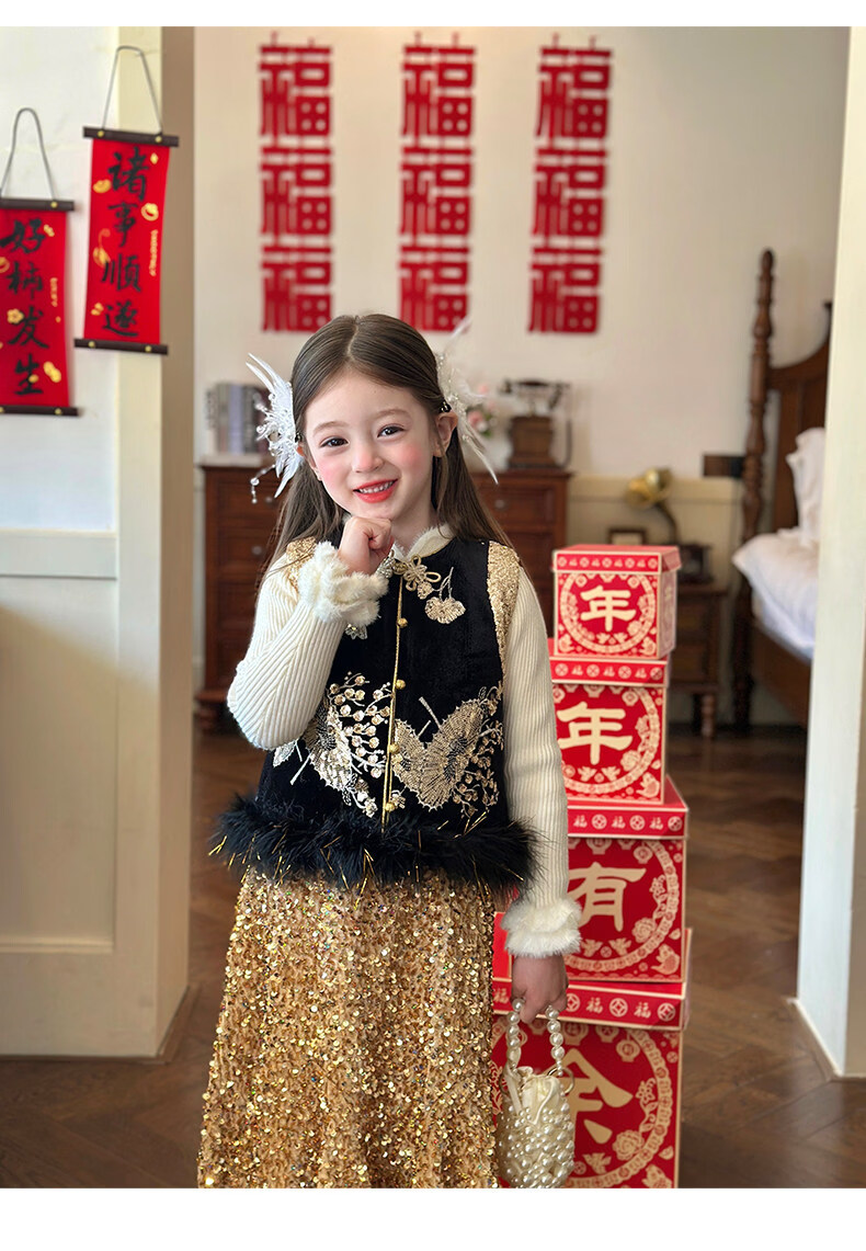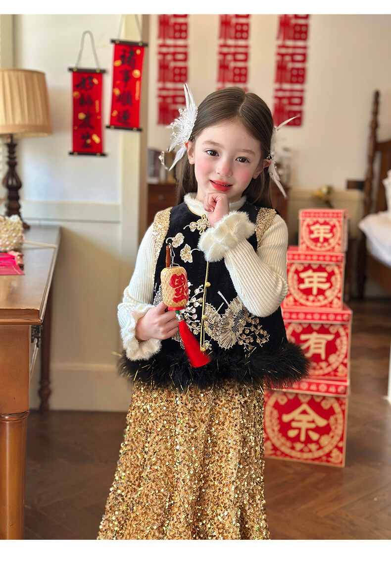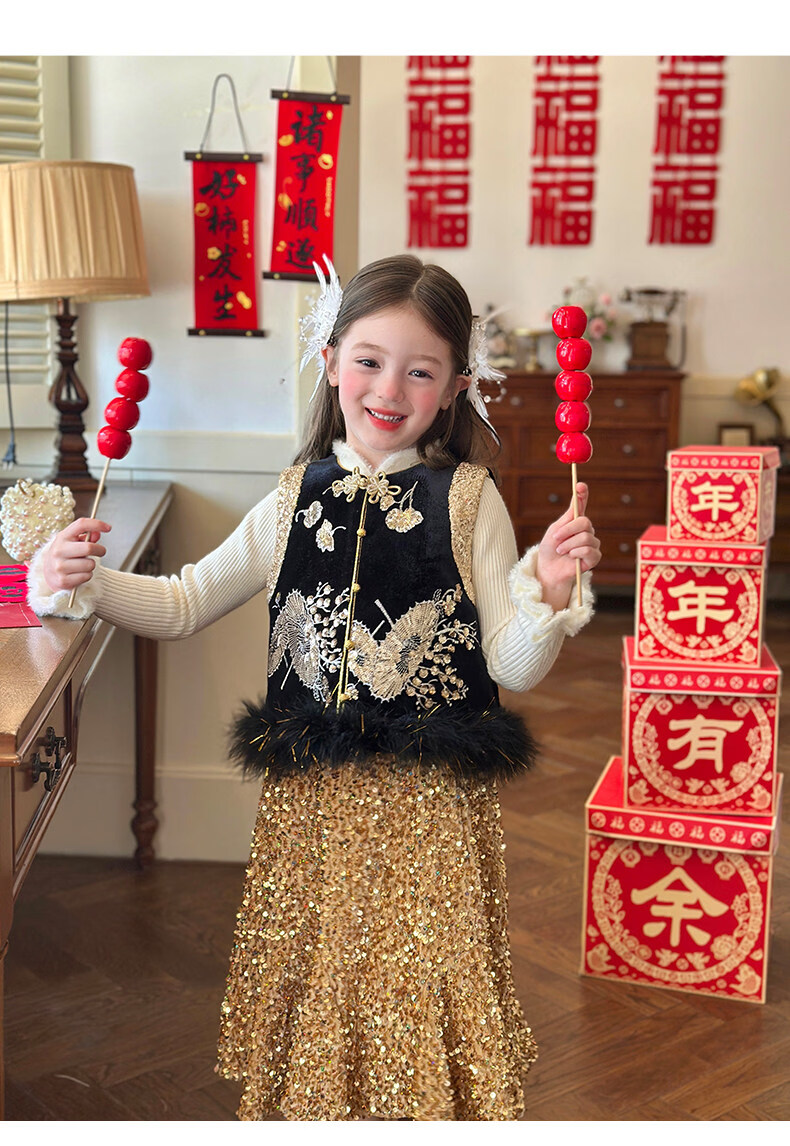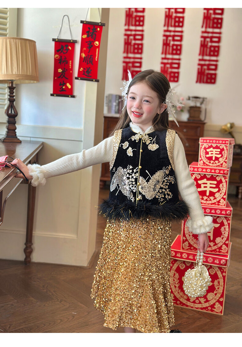 栀了成长记童装女童红色可爱亮片套装2025冬季儿童新年加绒两件套 红色 套装 100 cm