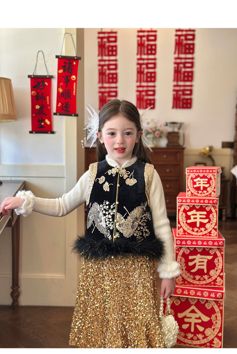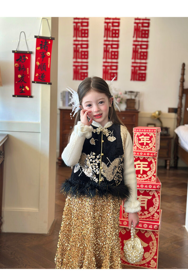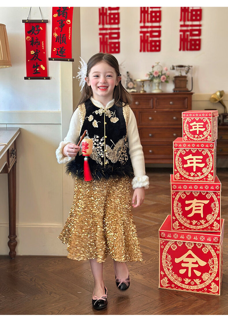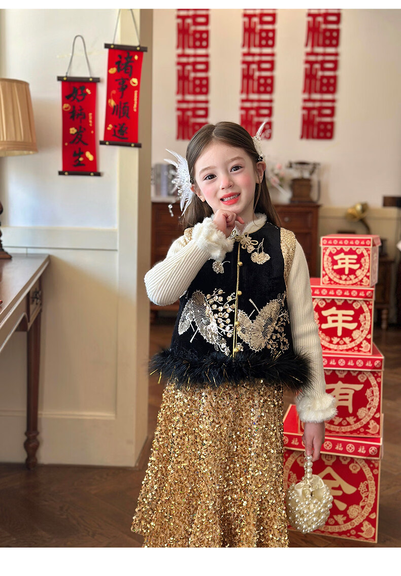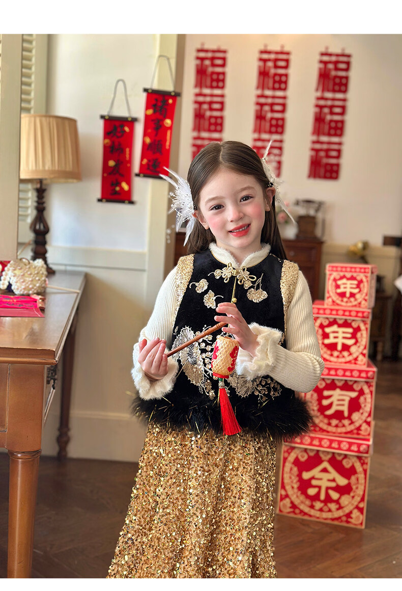 栀了成长记童装女童红色可爱亮片套装2025冬季儿童新年加绒两件套 红色 套装 100 cm