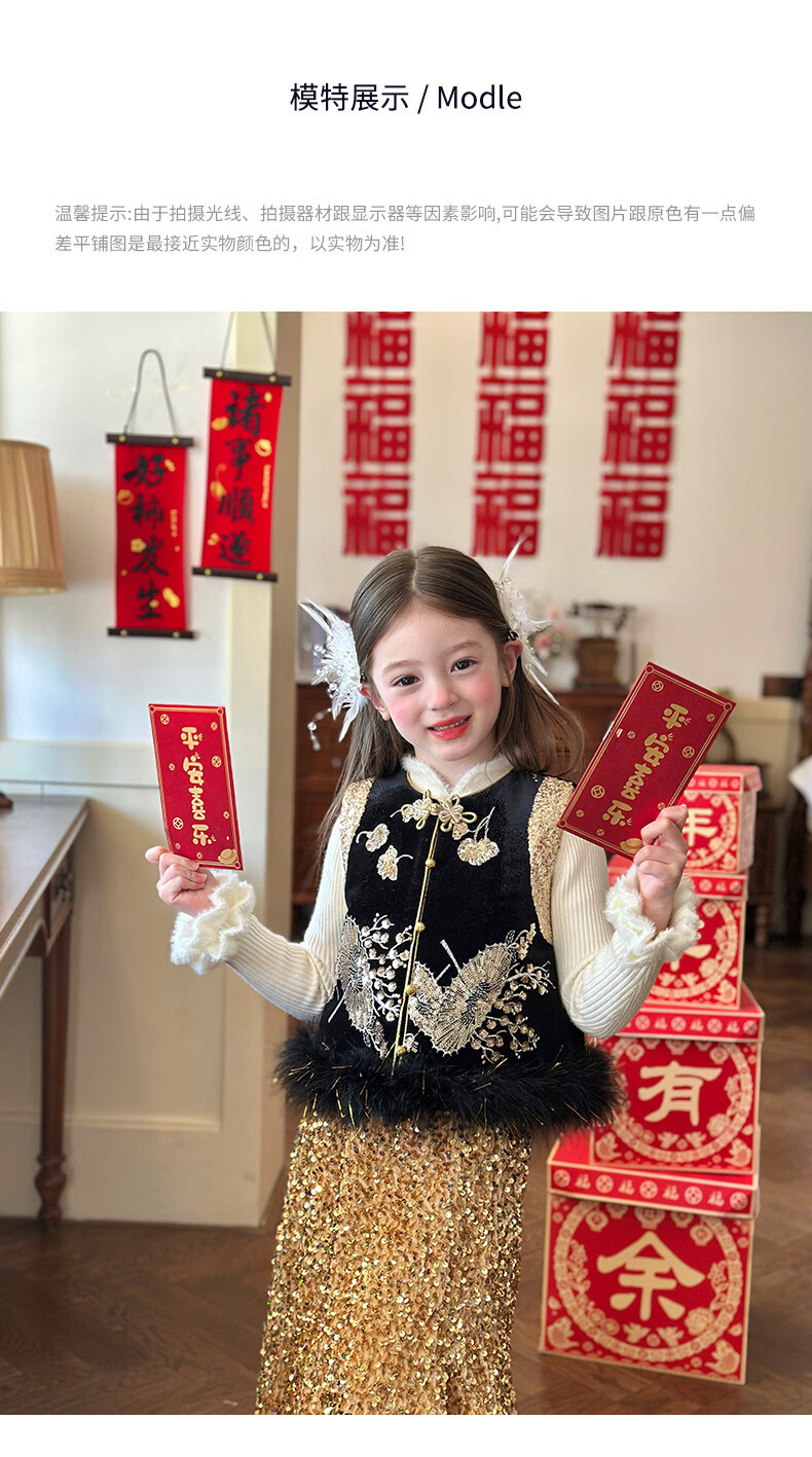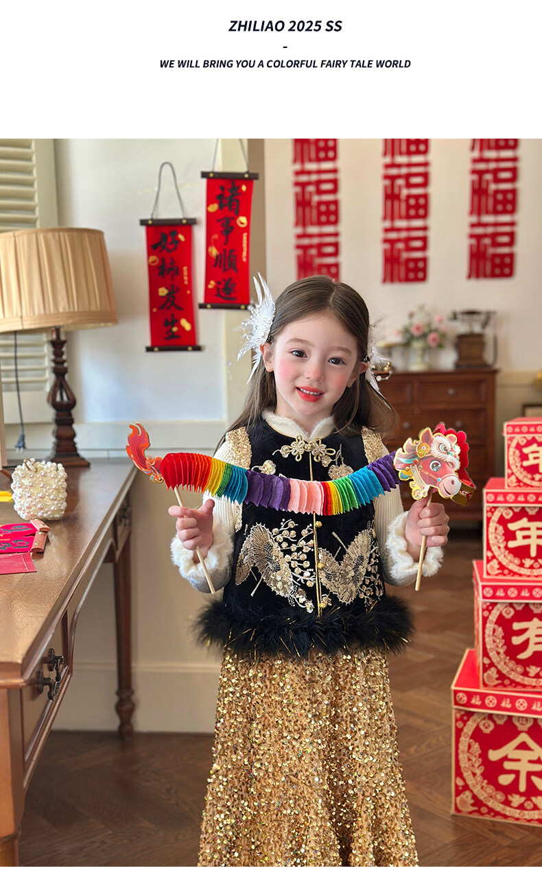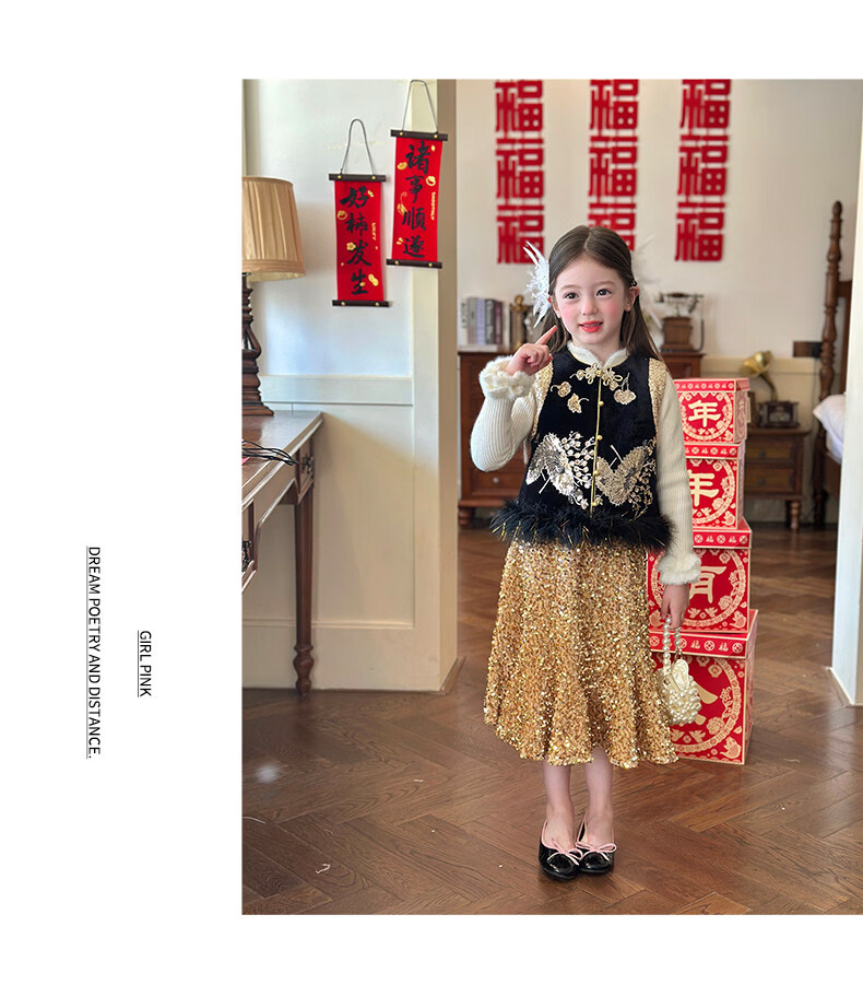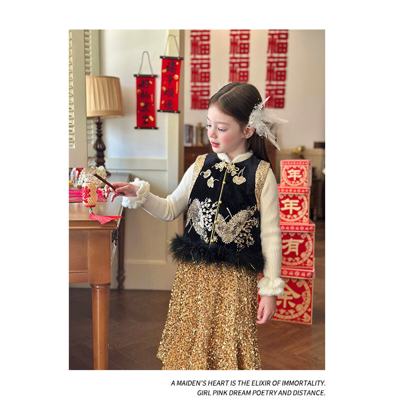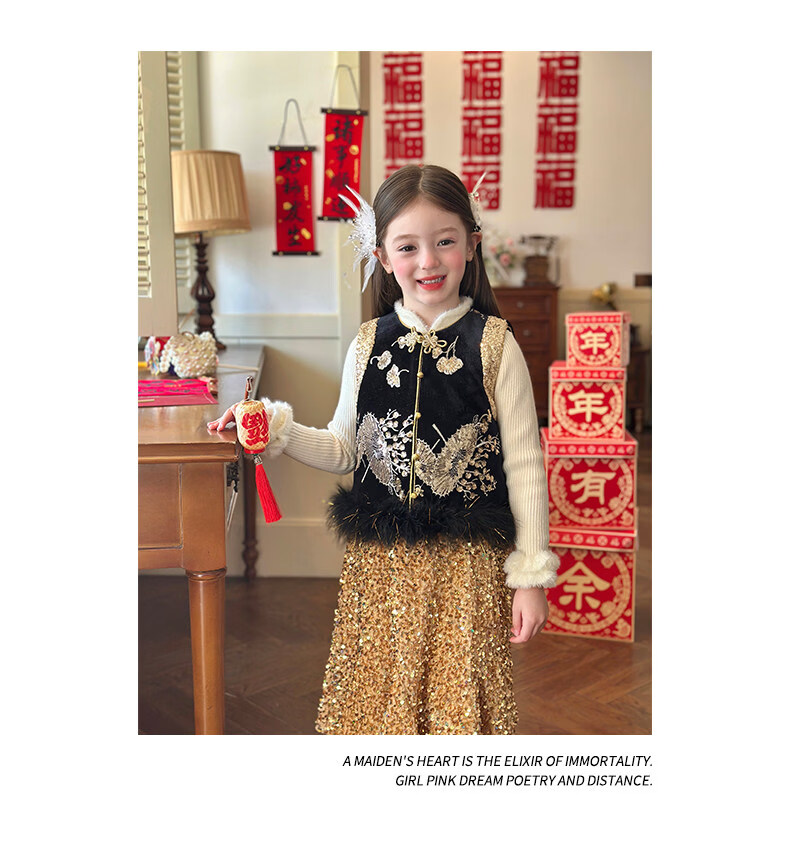 栀了成长记童装女童红色可爱亮片套装2025冬季儿童新年加绒两件套 红色 套装 100 cm