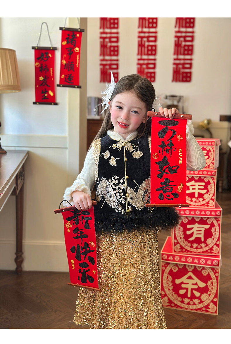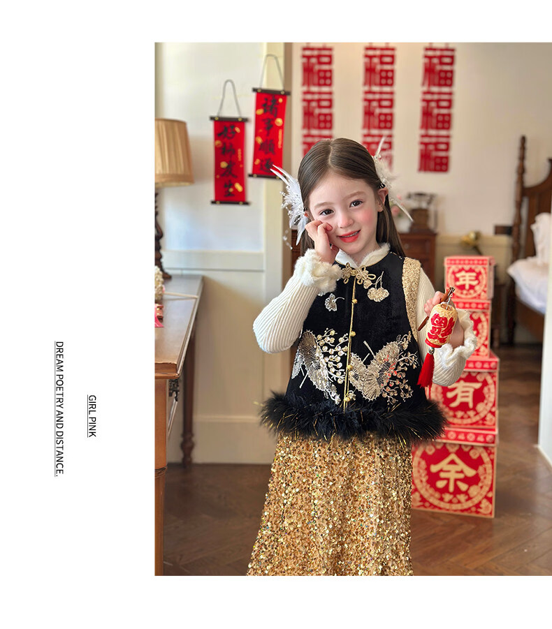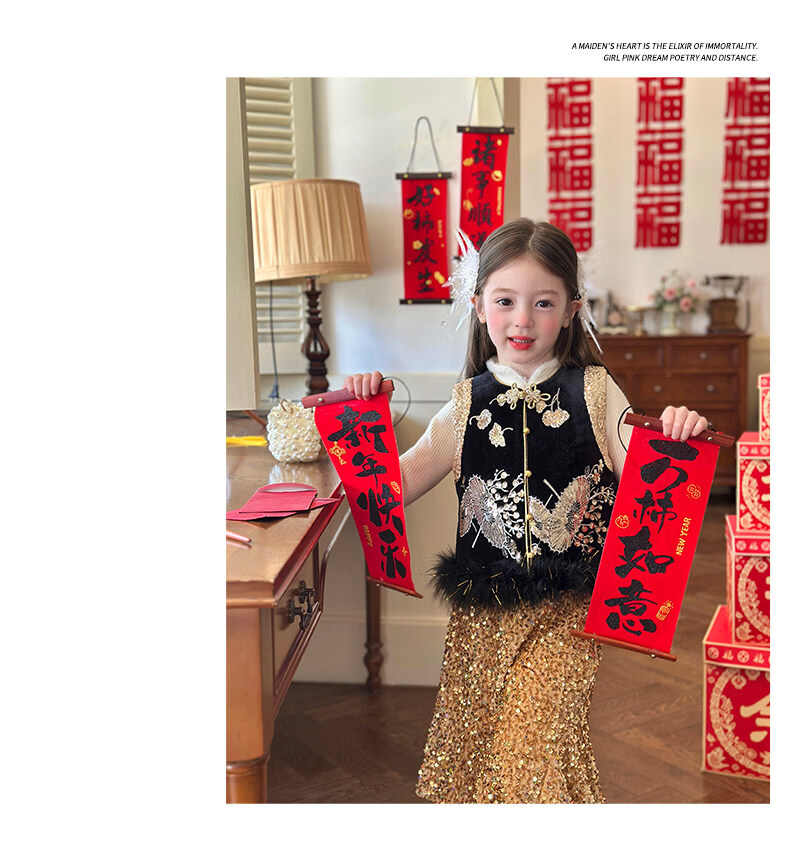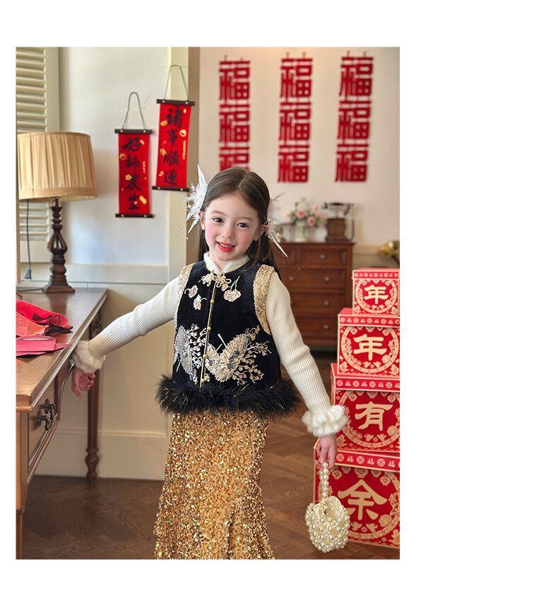 栀了成长记童装女童红色国风套装2025冬季儿童新年夹棉马甲两件套 红色 套装 100 cm