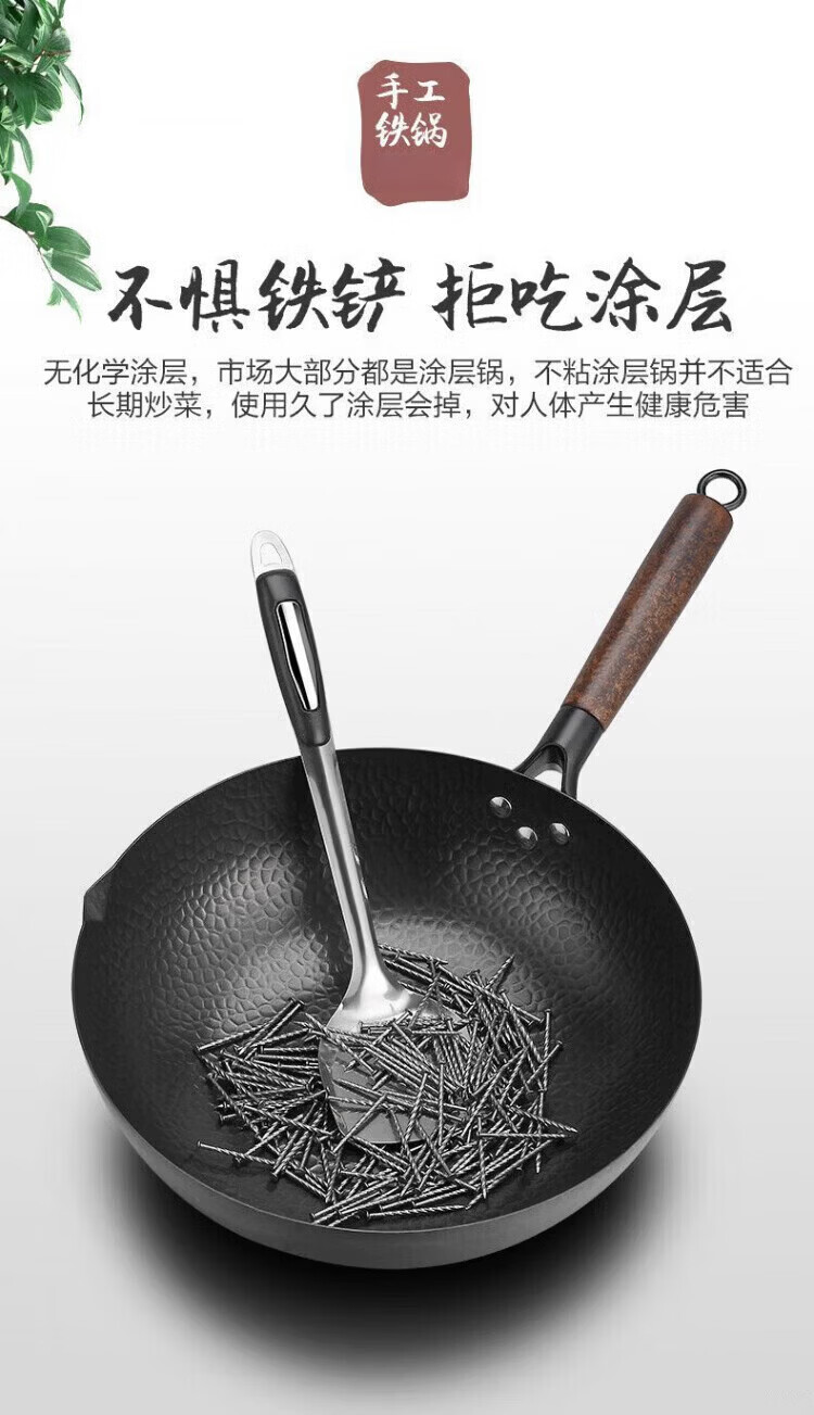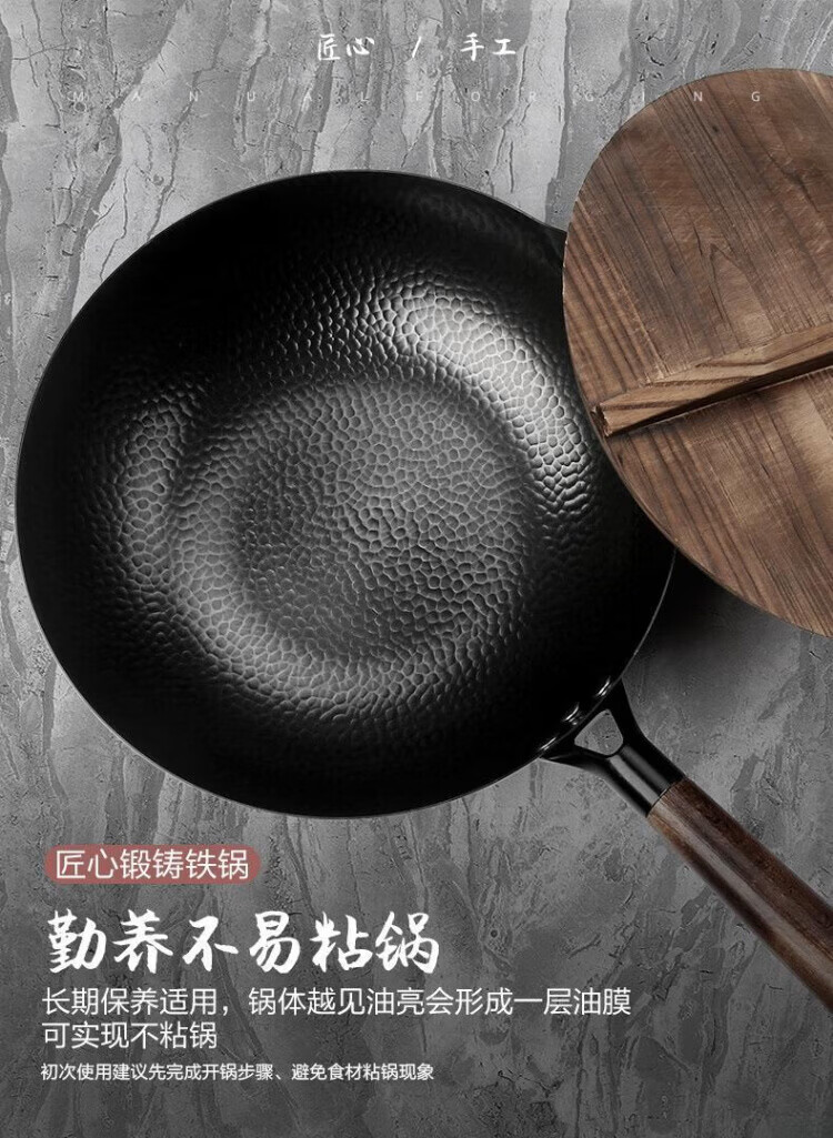 OCMOGO日本品牌炒锅家用铁锅锻打鱼鳞纹老式炒菜锅不粘锅燃气灶通用 圆底手打铁锅+杉木盖 32cm 标准