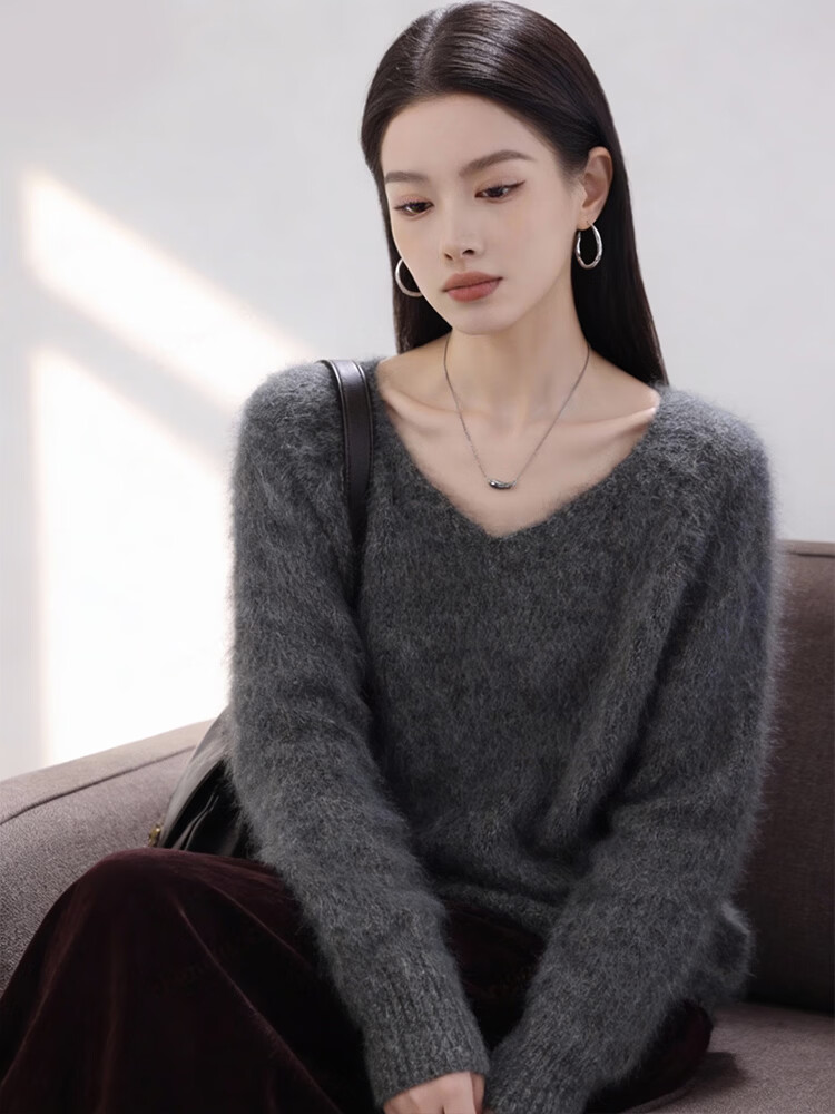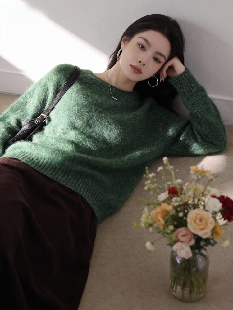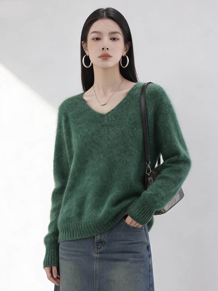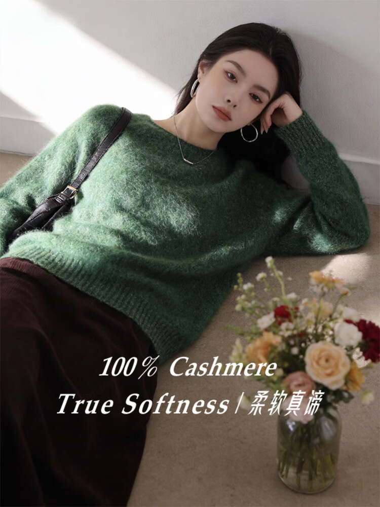 【达人专属】100%山羊绒柔软真谛拉毛冬女厚款针织毛衣套头 丛林绿-v领 L (110-140斤) 【3-15天发货】