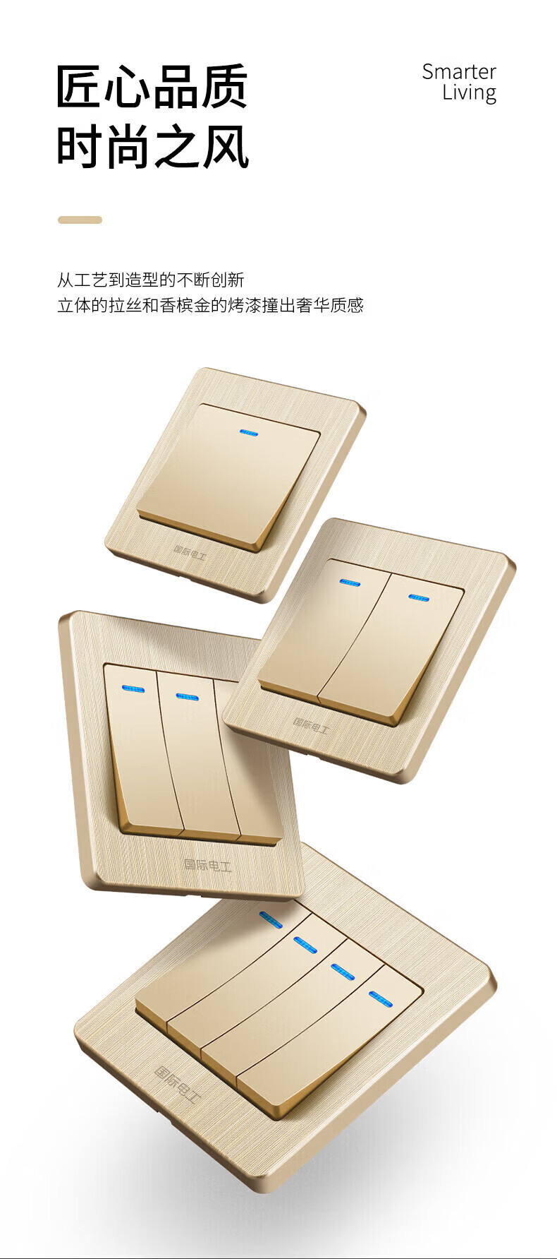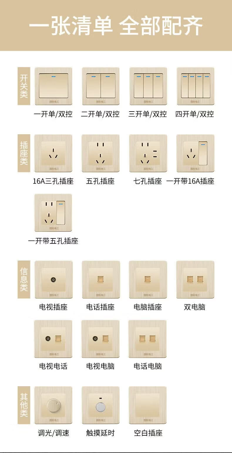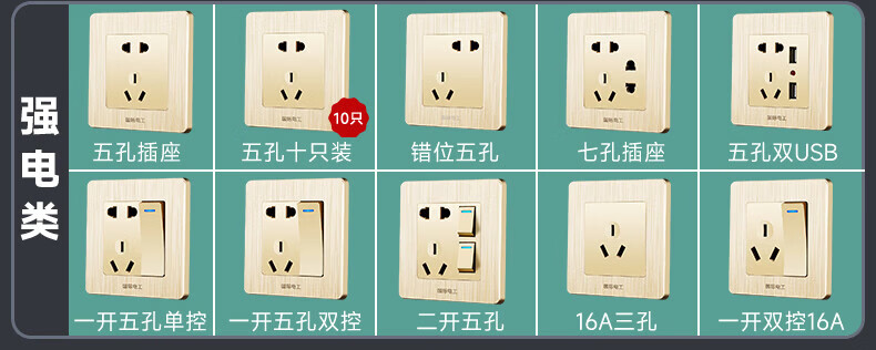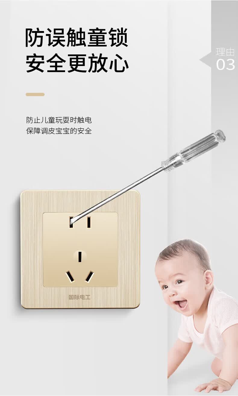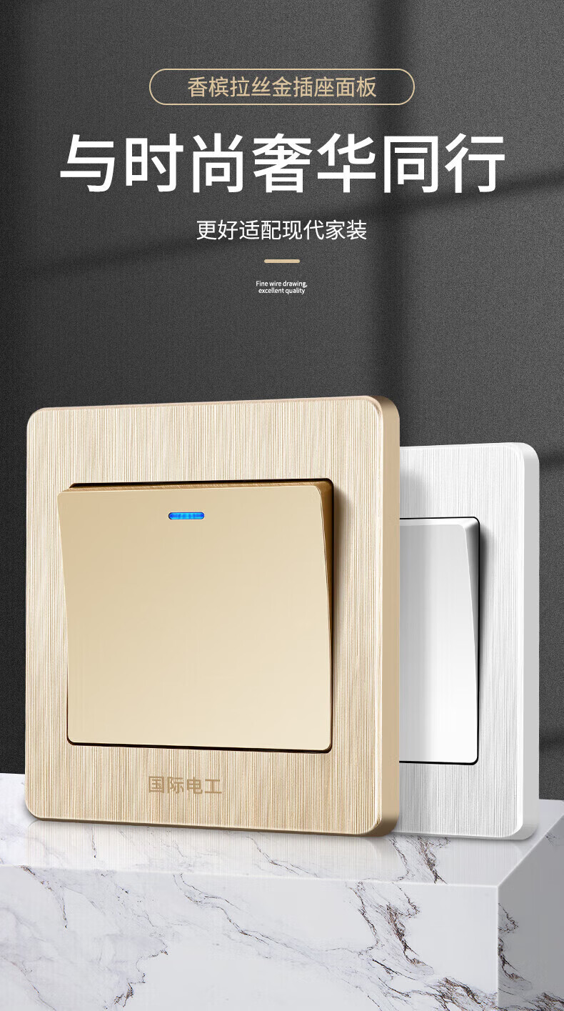 国际电工(FDD)86型暗装家用开关插座面板墙壁空调拉丝金色16A五孔网络电源插座 五孔 插座