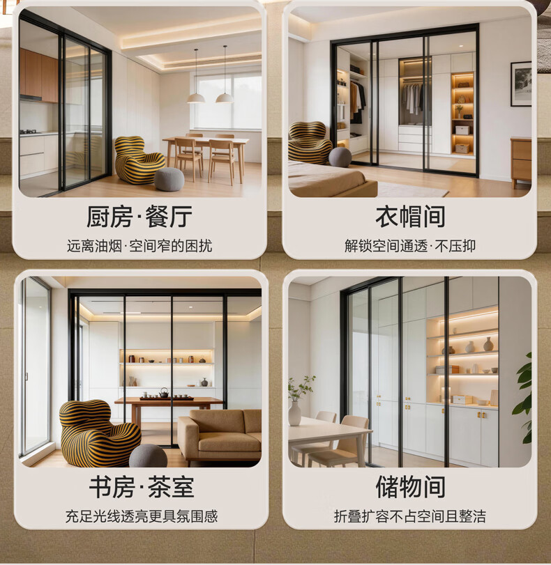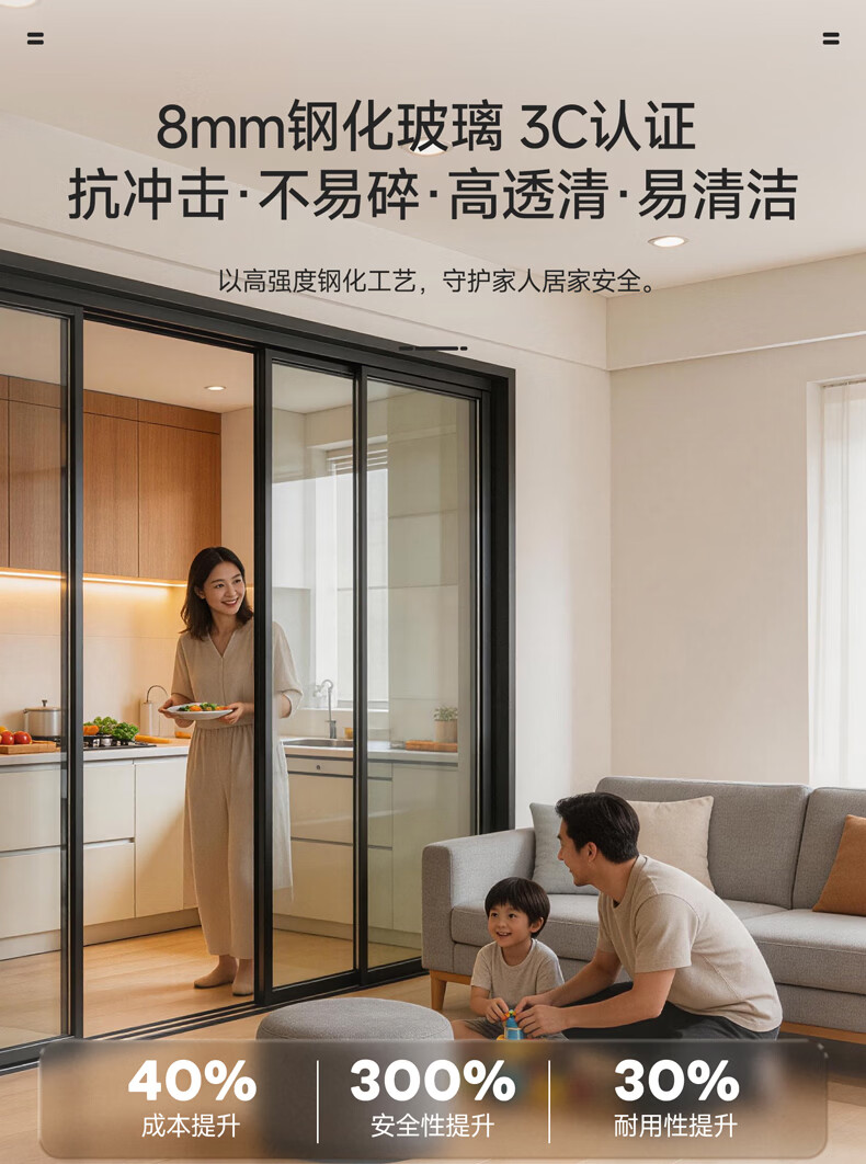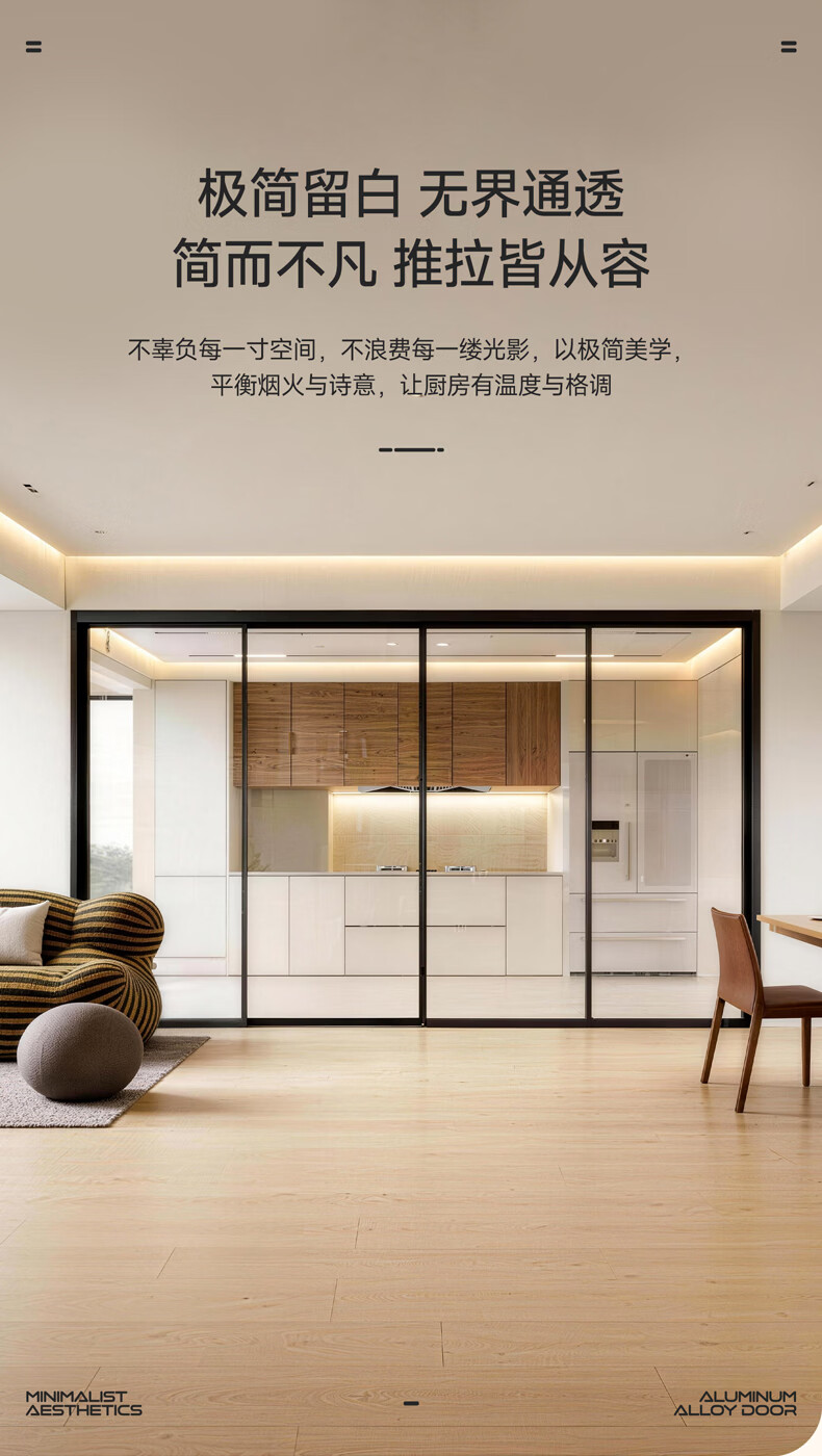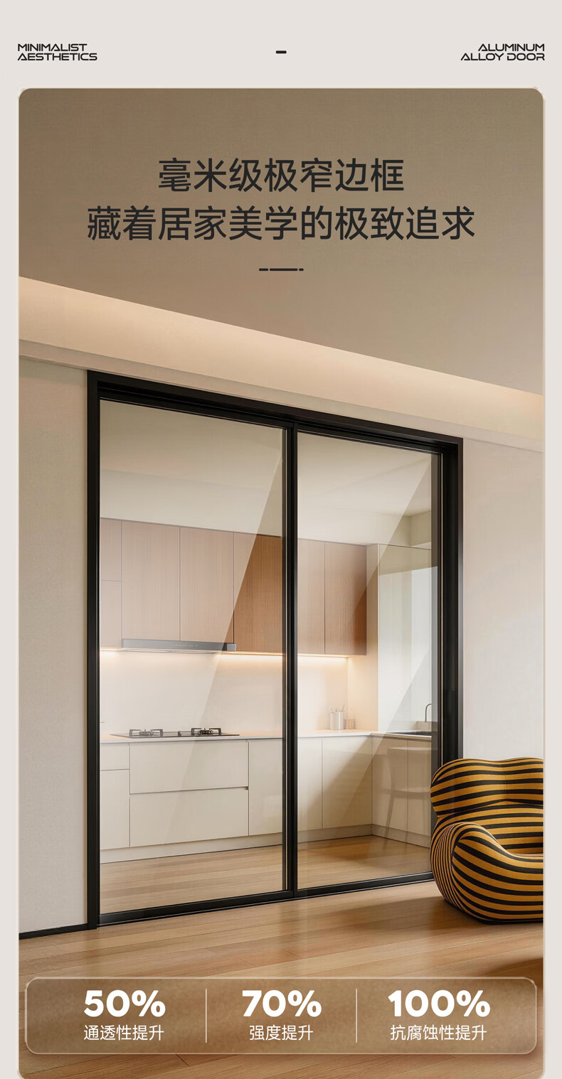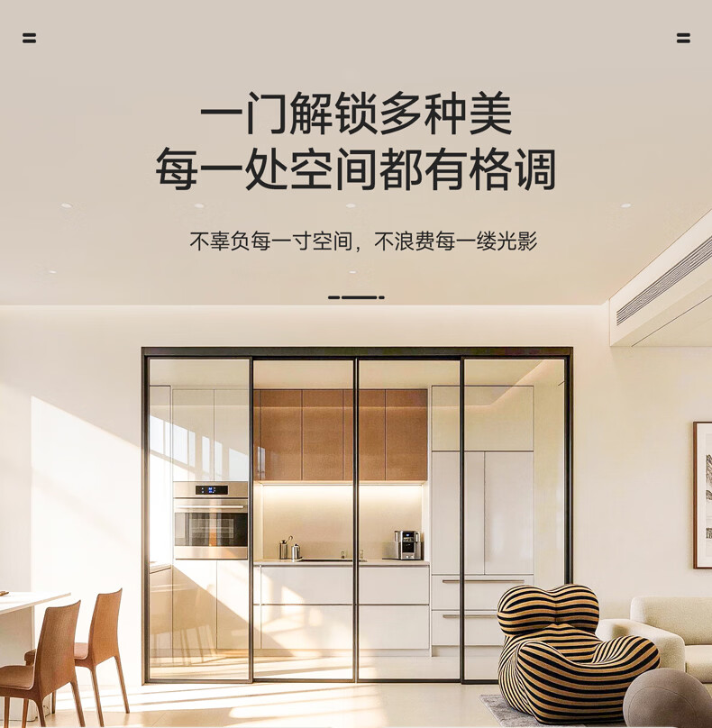亚太天能厨房推拉门铝合金平移推拉门阳台移门隐形折叠门玻璃门 吊轨-极致-三联动1009/㎡(单扇1.5㎡起算)