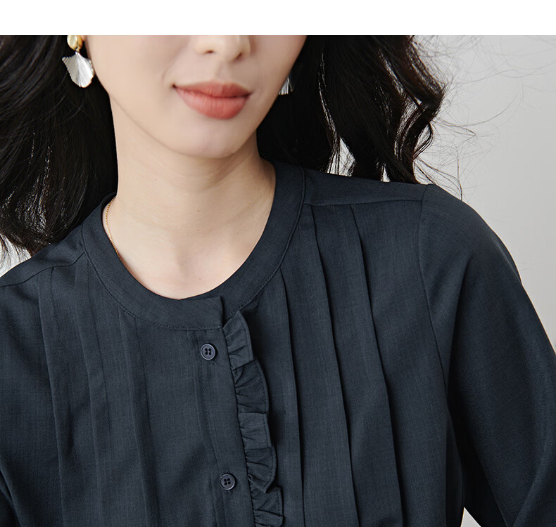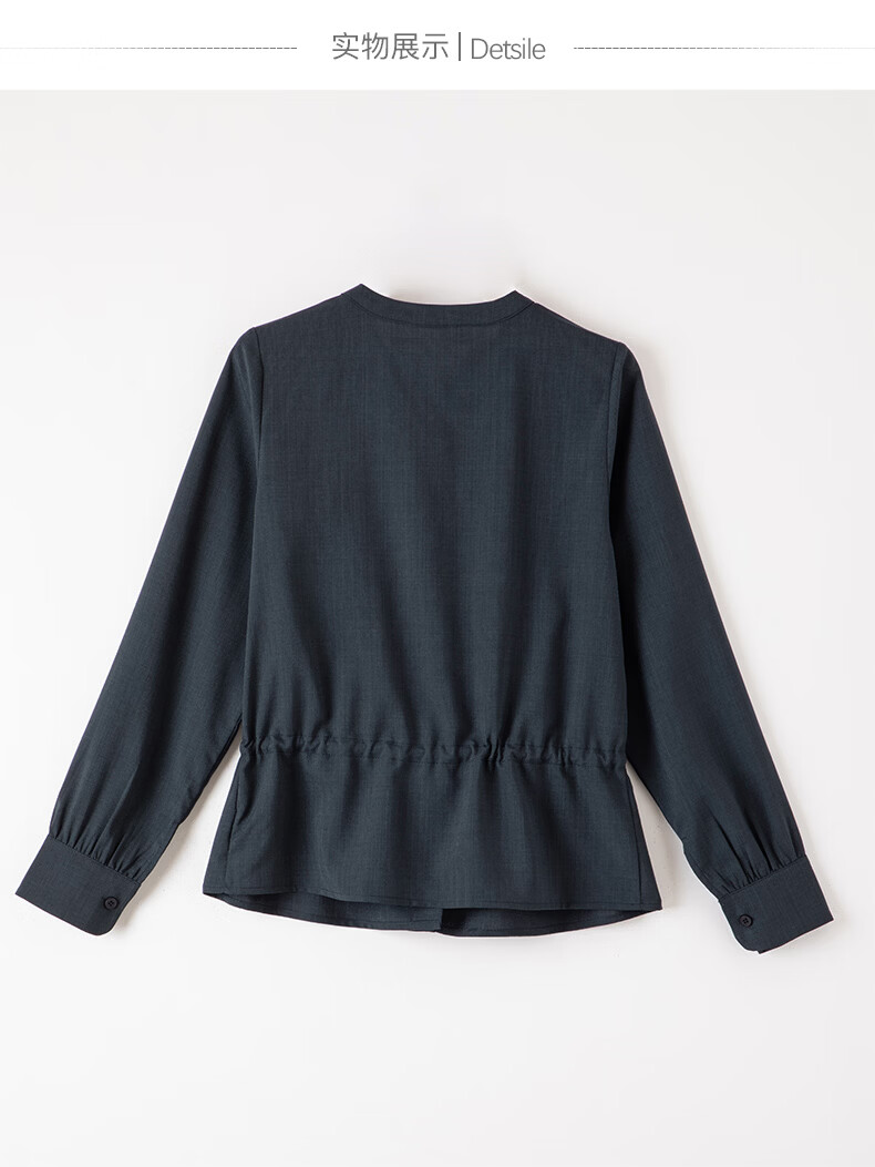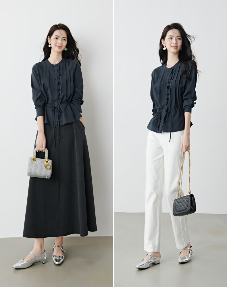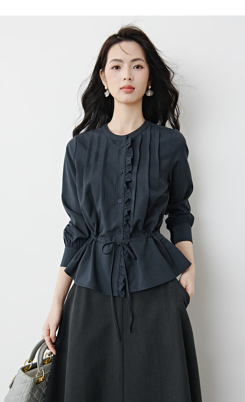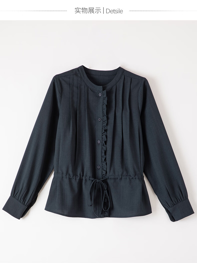 晚白2026年春款文艺复古花边圆领上衣抽绳收腰遮肉小众设计感衬衫女 深蓝色 S