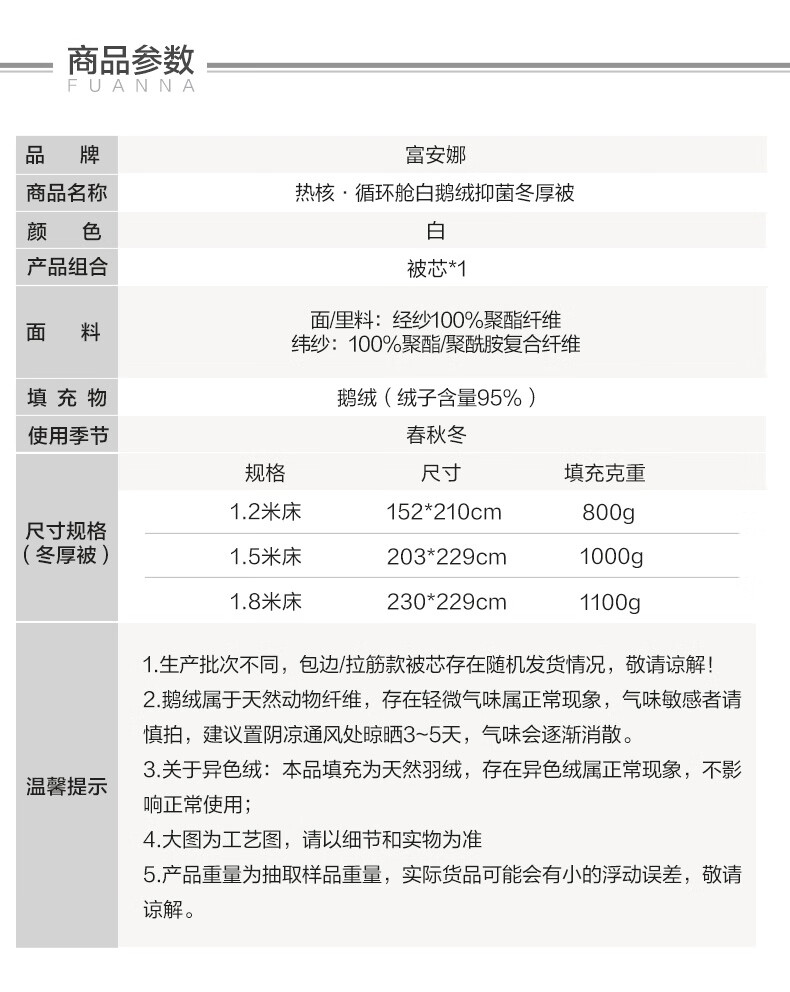 富安娜家纺被芯95鹅绒热热核循环羽绒被 白色 152*210cm